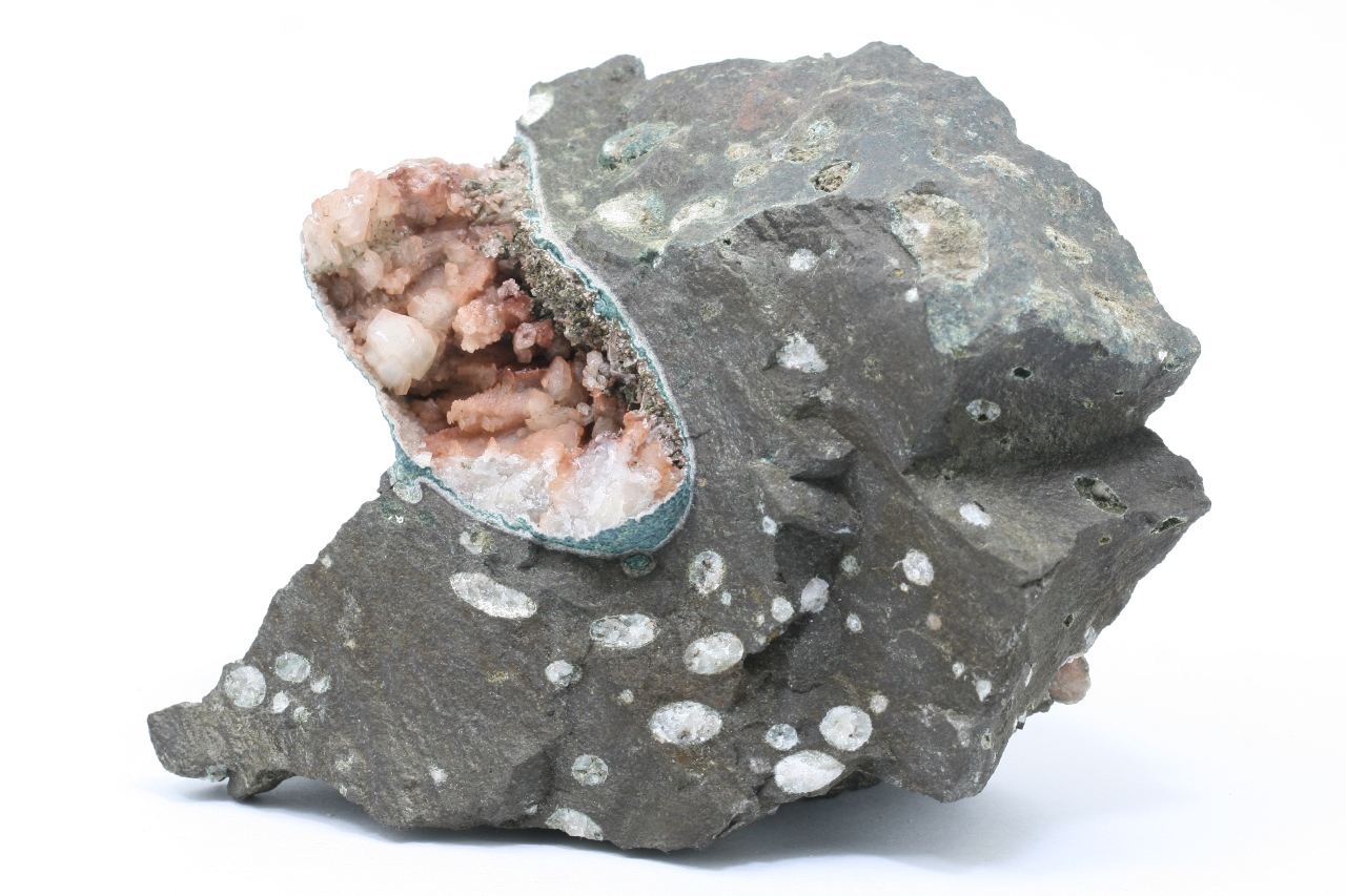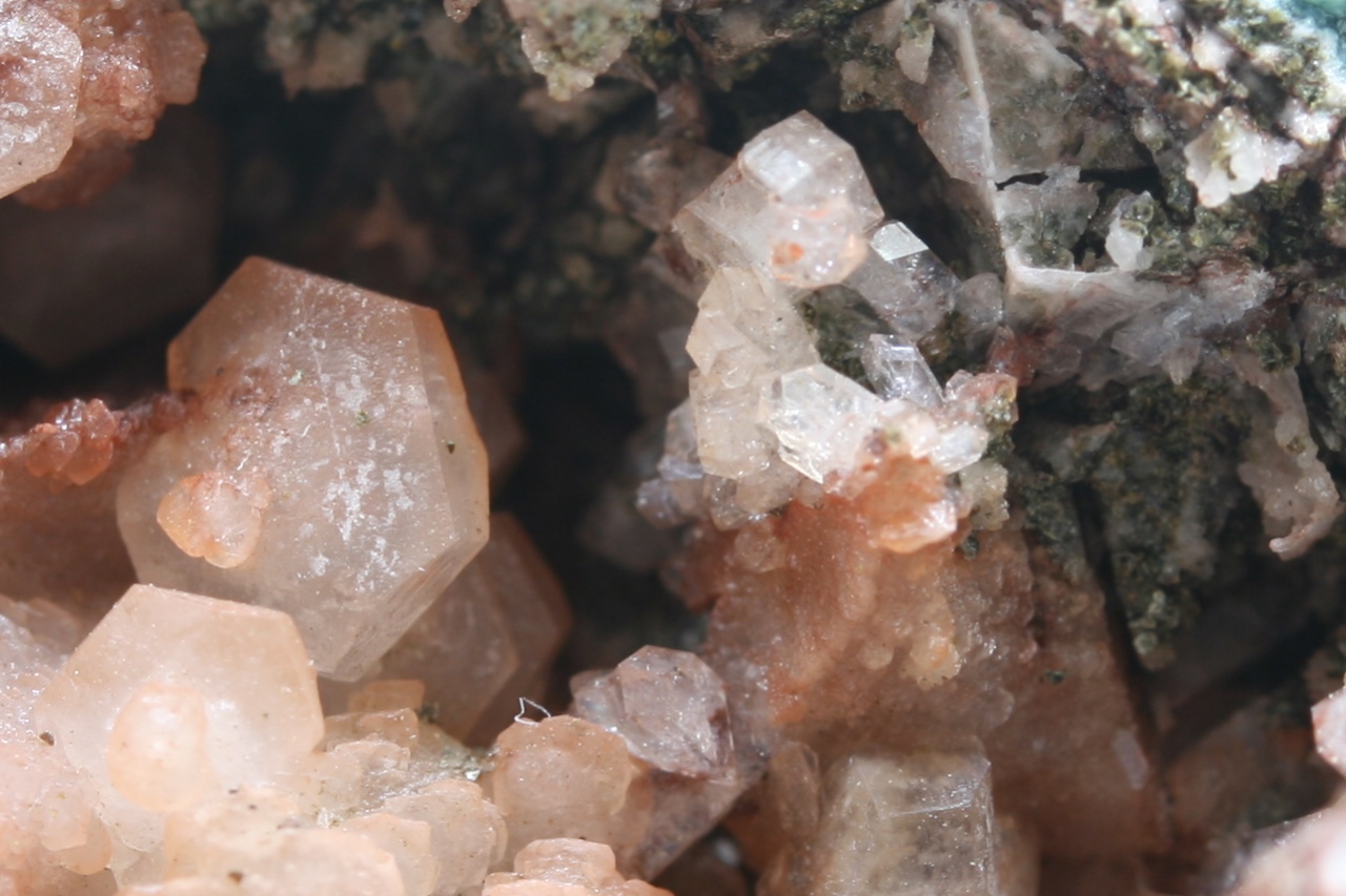 Feine, klare Harmotom-Kristalle mit Kalkspat in einer Höhle gewachsen.