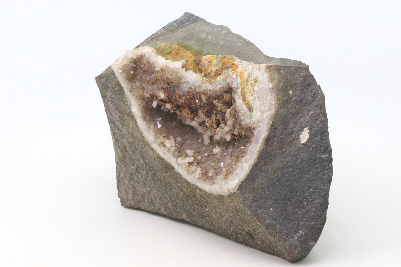 Höhle gefüllt mit Kristallen von Quarz (hell Amethyst), überwachsen mit weißem Harmotom bis zu 6 mm groß.