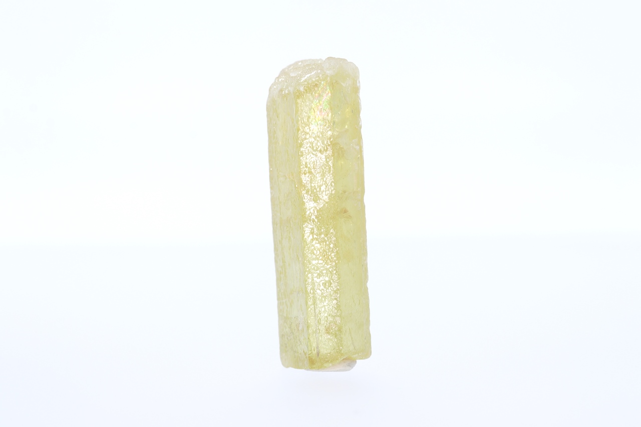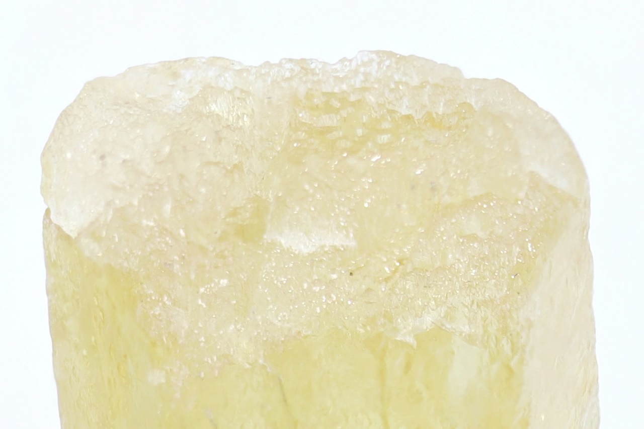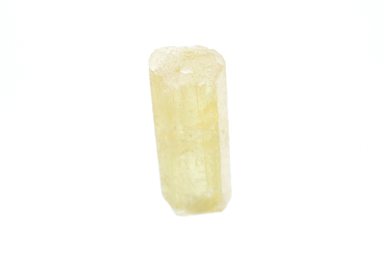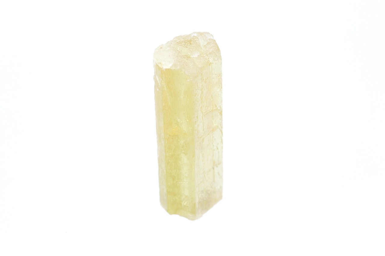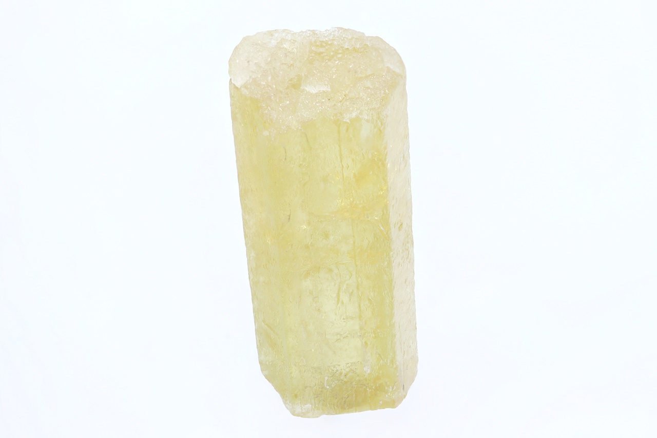 Kristall der gelben Varietät des Berylls – Heliodor. Der Kristall ist auf der einen Seite verheilt, auf der anderen Seite abgebrochen .