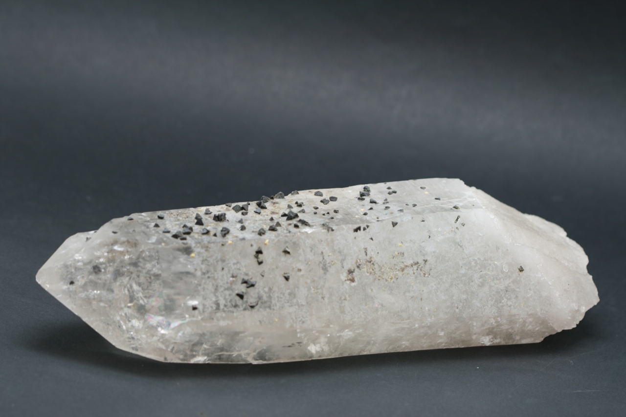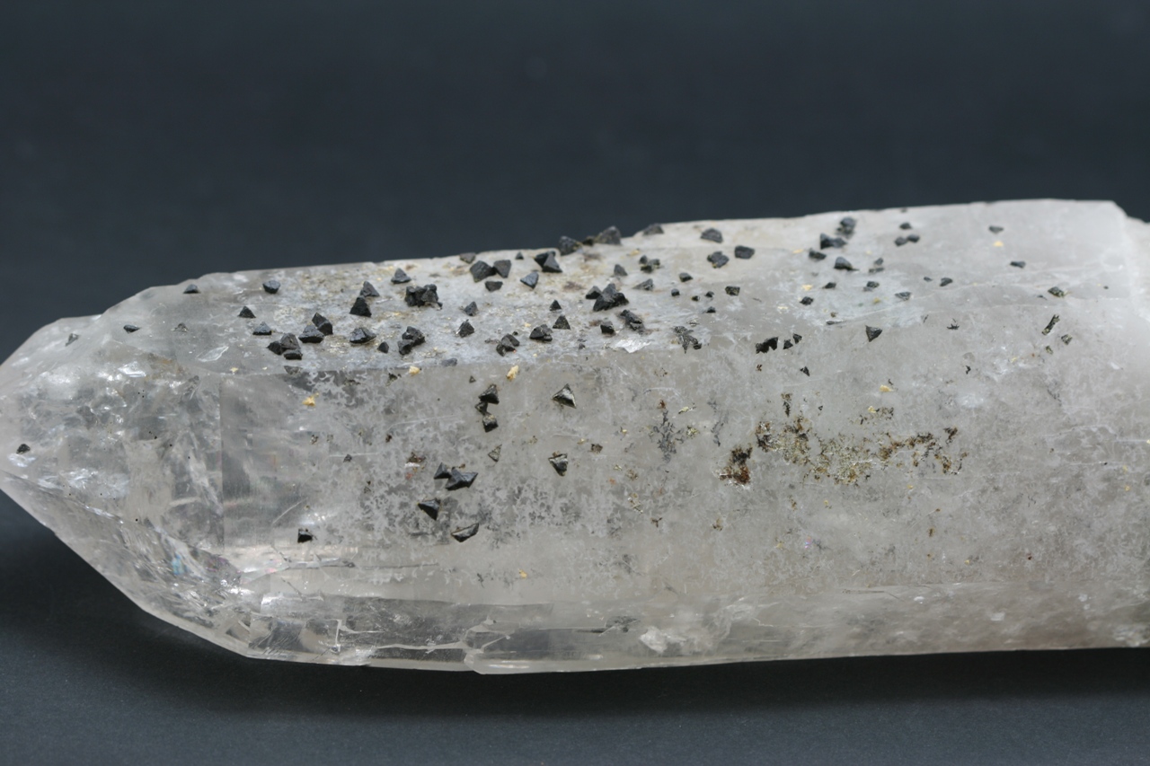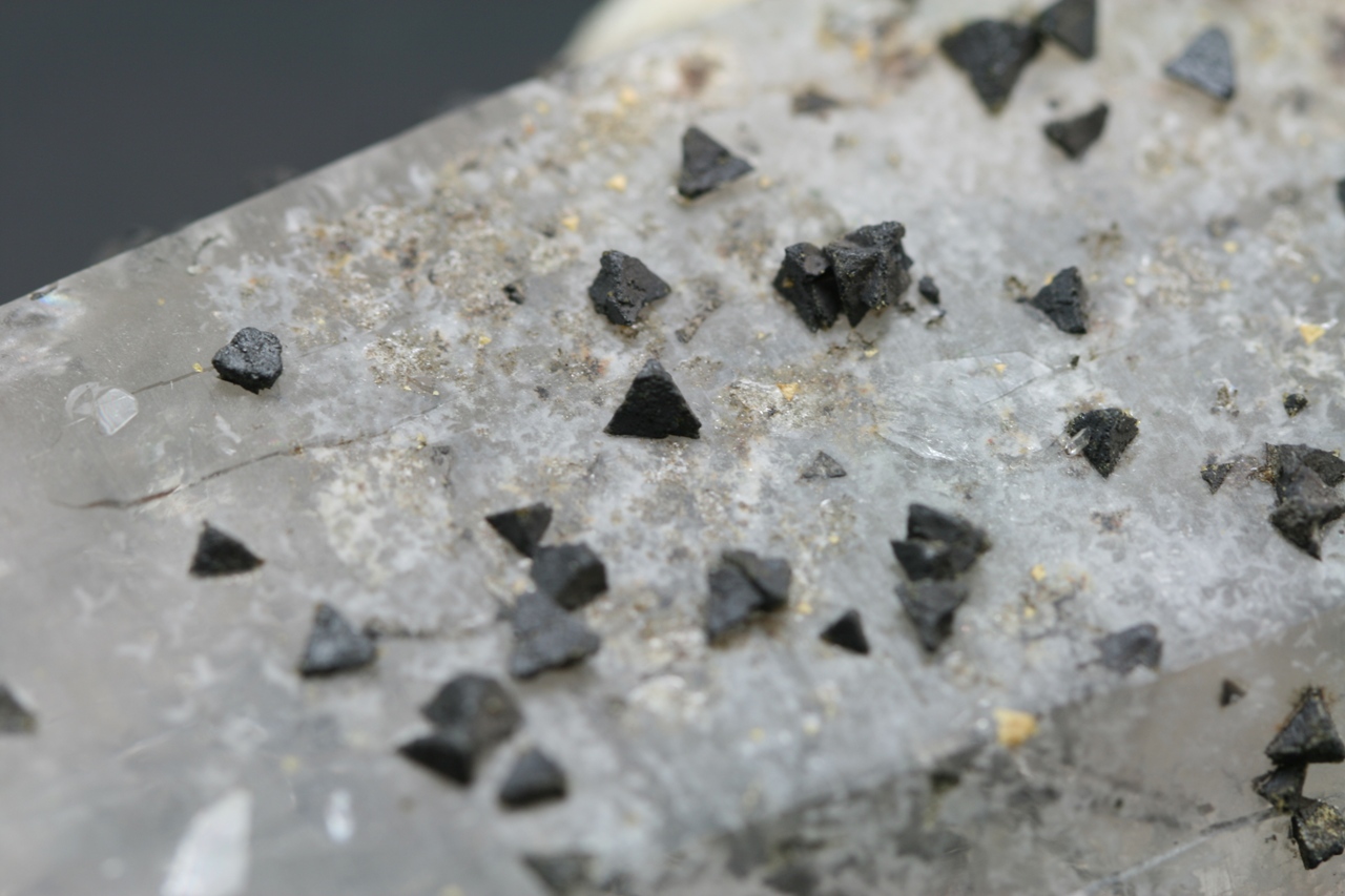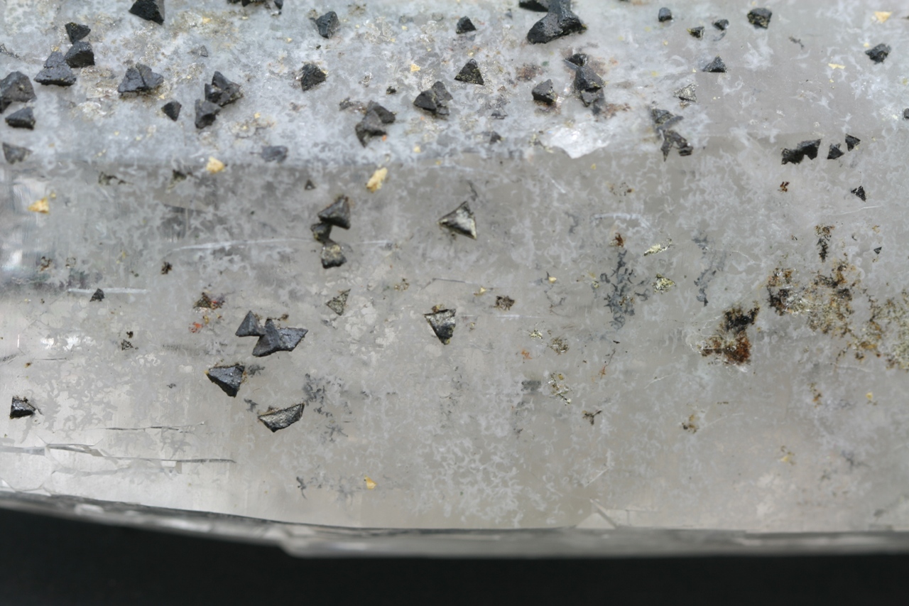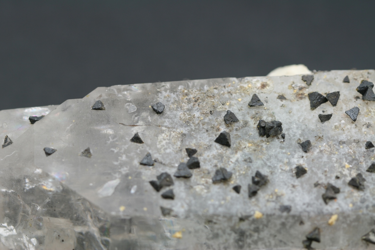 Wunderschönes Exemplar von schwarzen tetraedrischen Kristallen des seltenen Silikats Beryll aus Brasilien, gewachsen auf Bergkristall.
