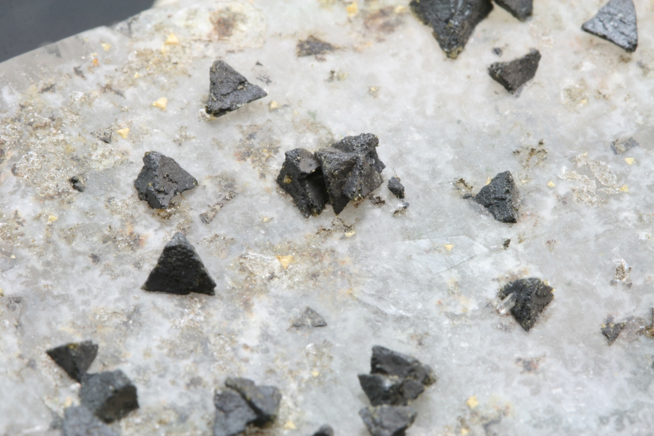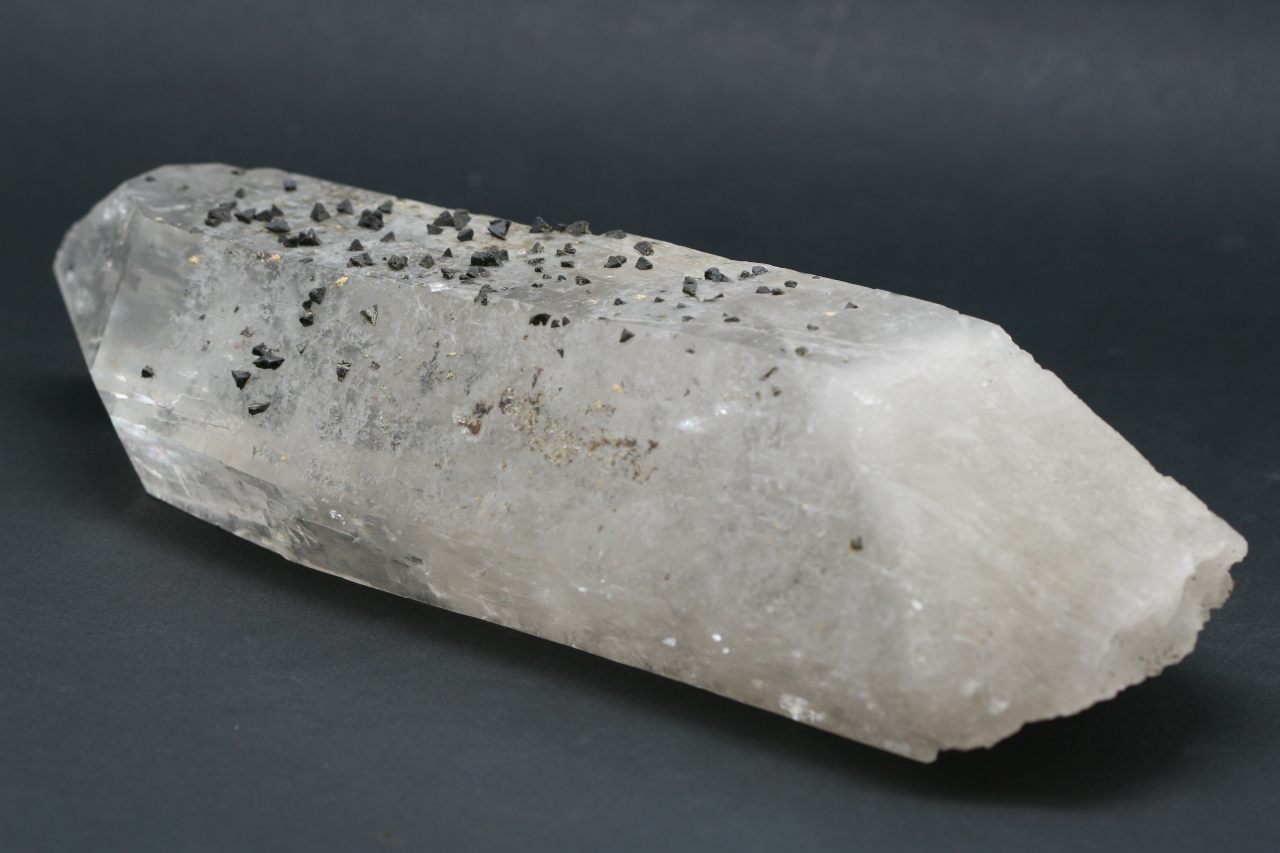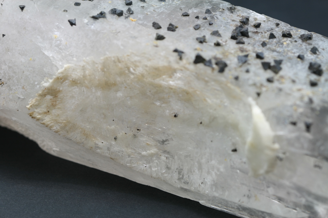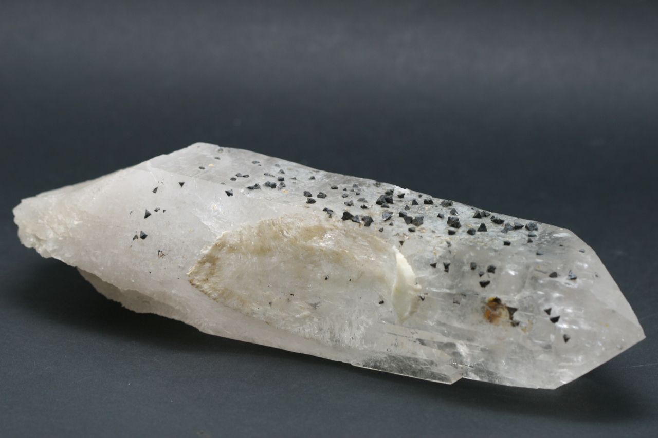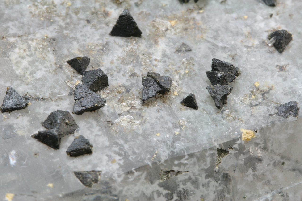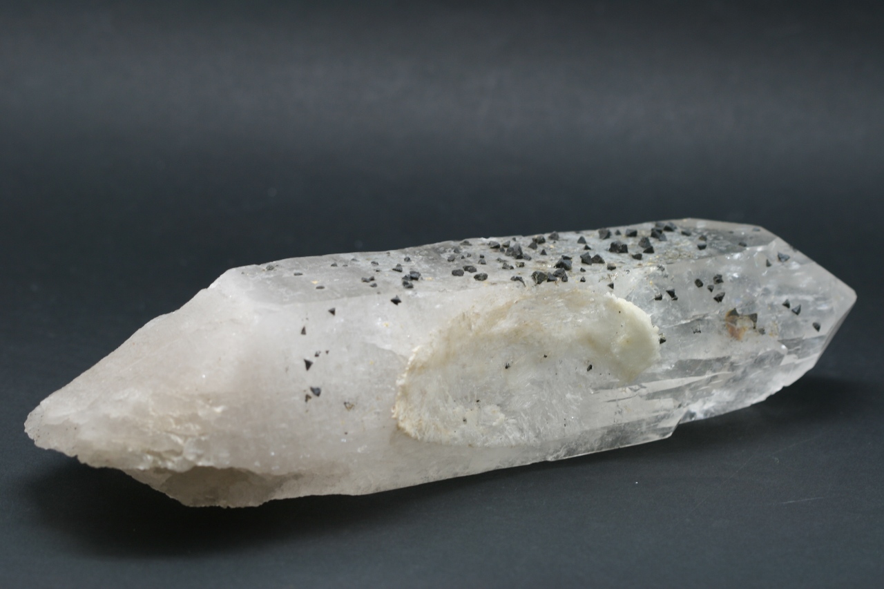 Wunderschönes Exemplar von schwarzen tetraedrischen Kristallen des seltenen Silikats Beryll aus Brasilien, gewachsen auf Bergkristall.