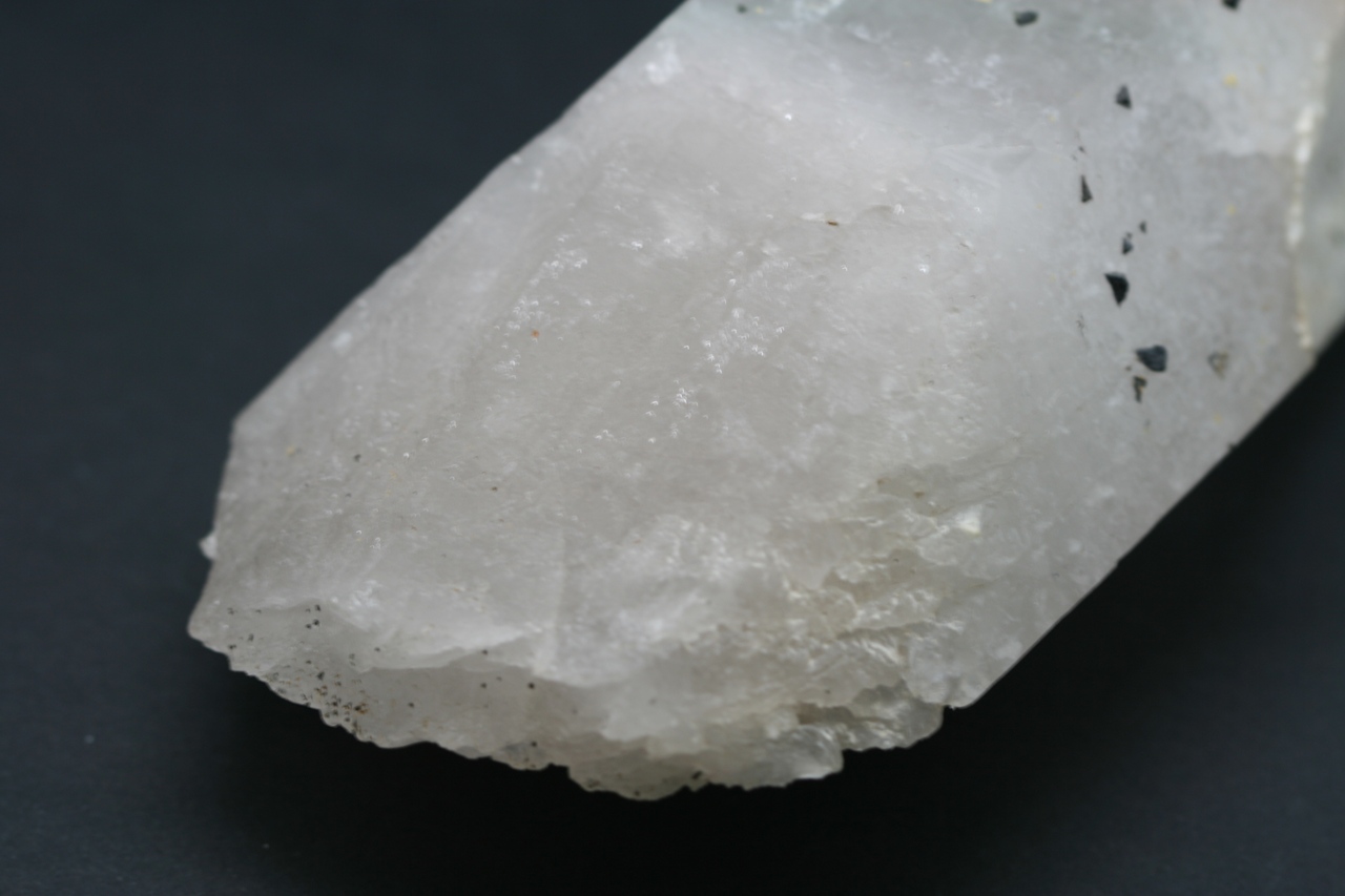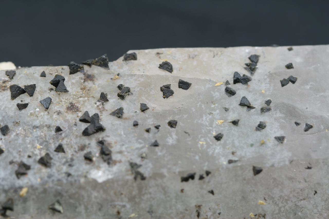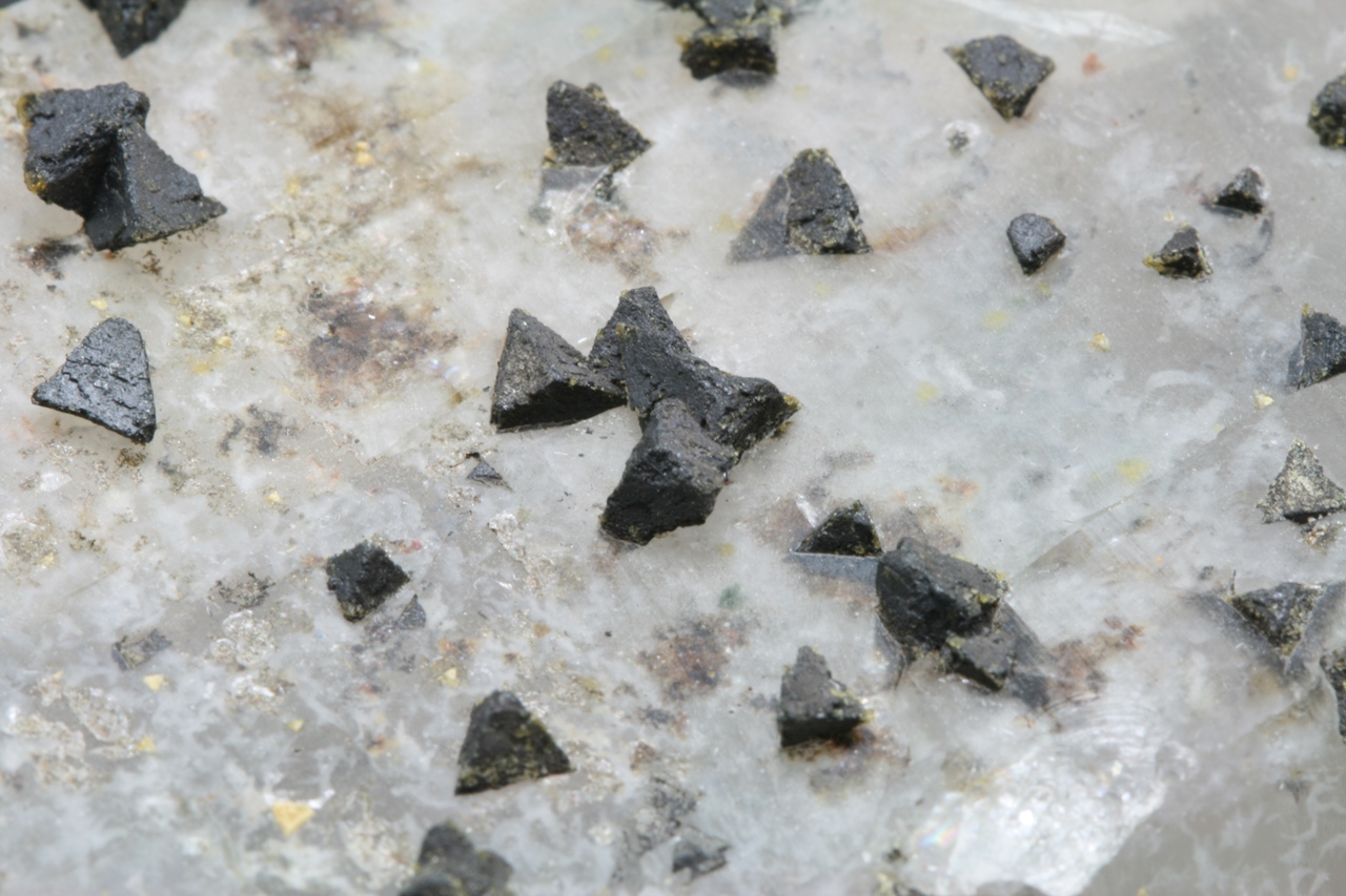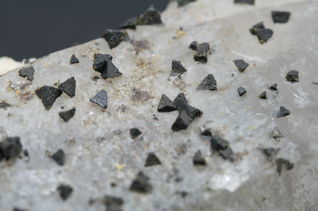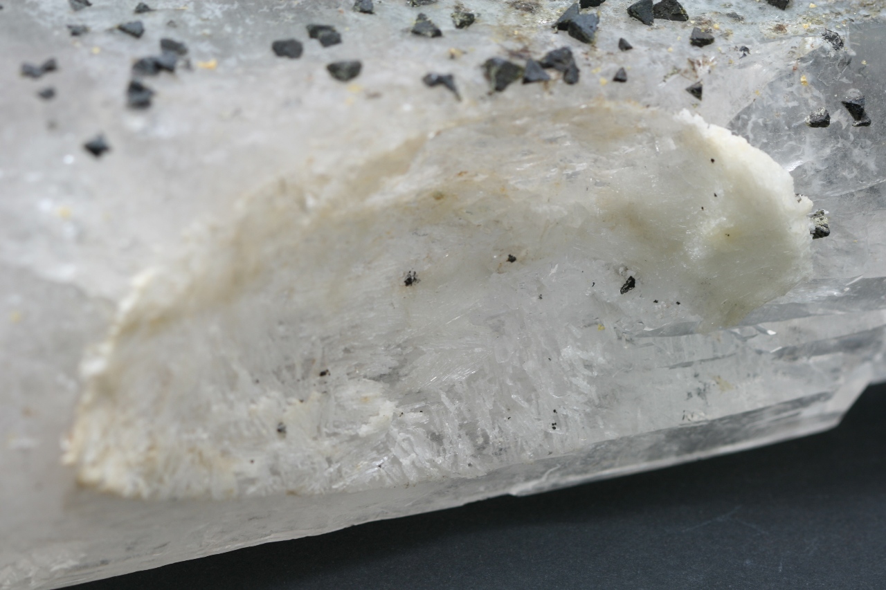 Wunderschönes Exemplar von schwarzen tetraedrischen Kristallen des seltenen Silikats Beryll aus Brasilien, gewachsen auf Bergkristall.