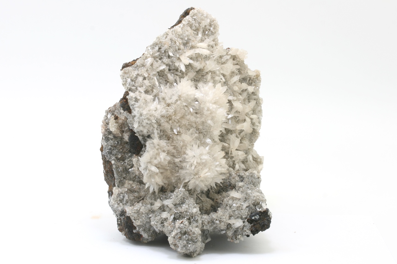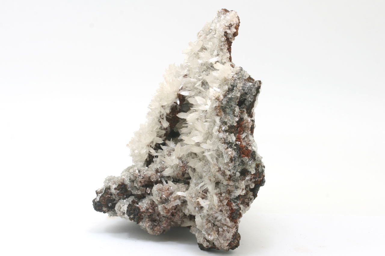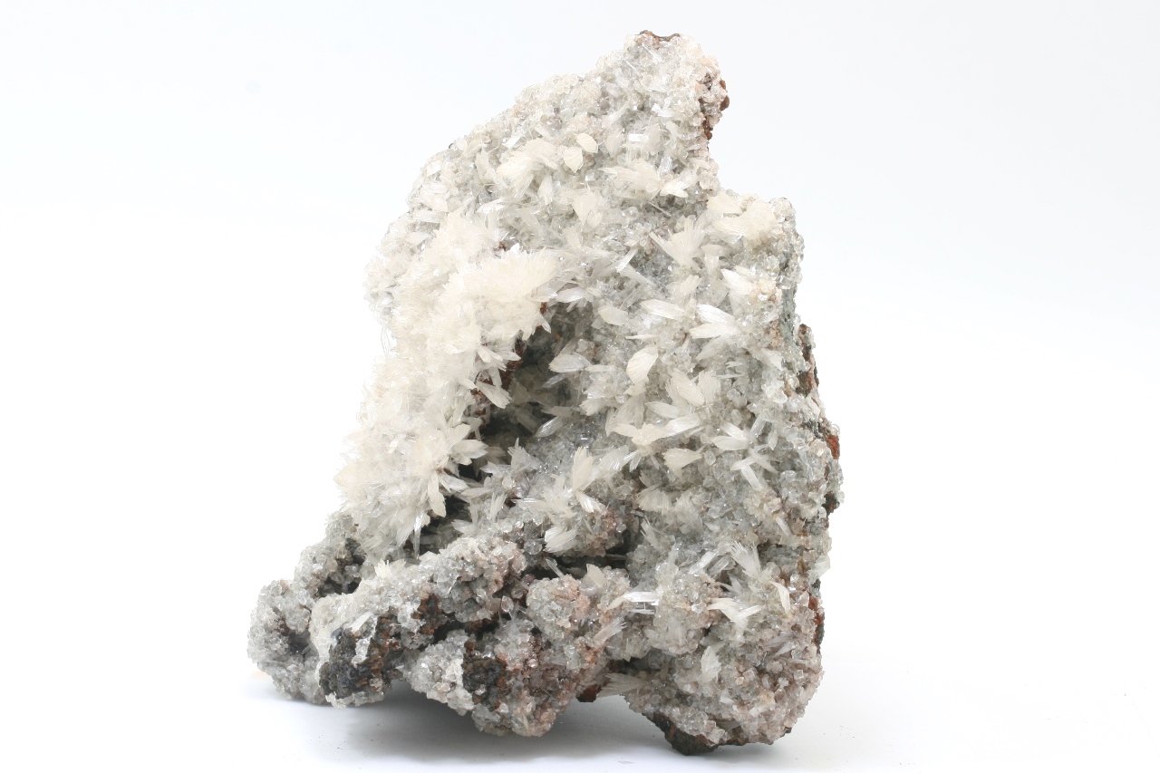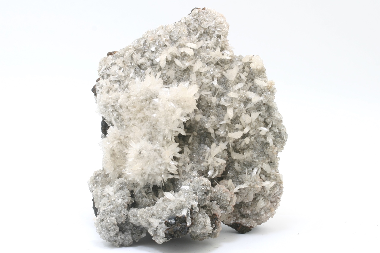 Großer, ästhetischer Probe von weißen, bis zu 1 cm großen Fächern von Hemimorphit, die auf den Rhomboedern von Kalcit gewachsen sind.