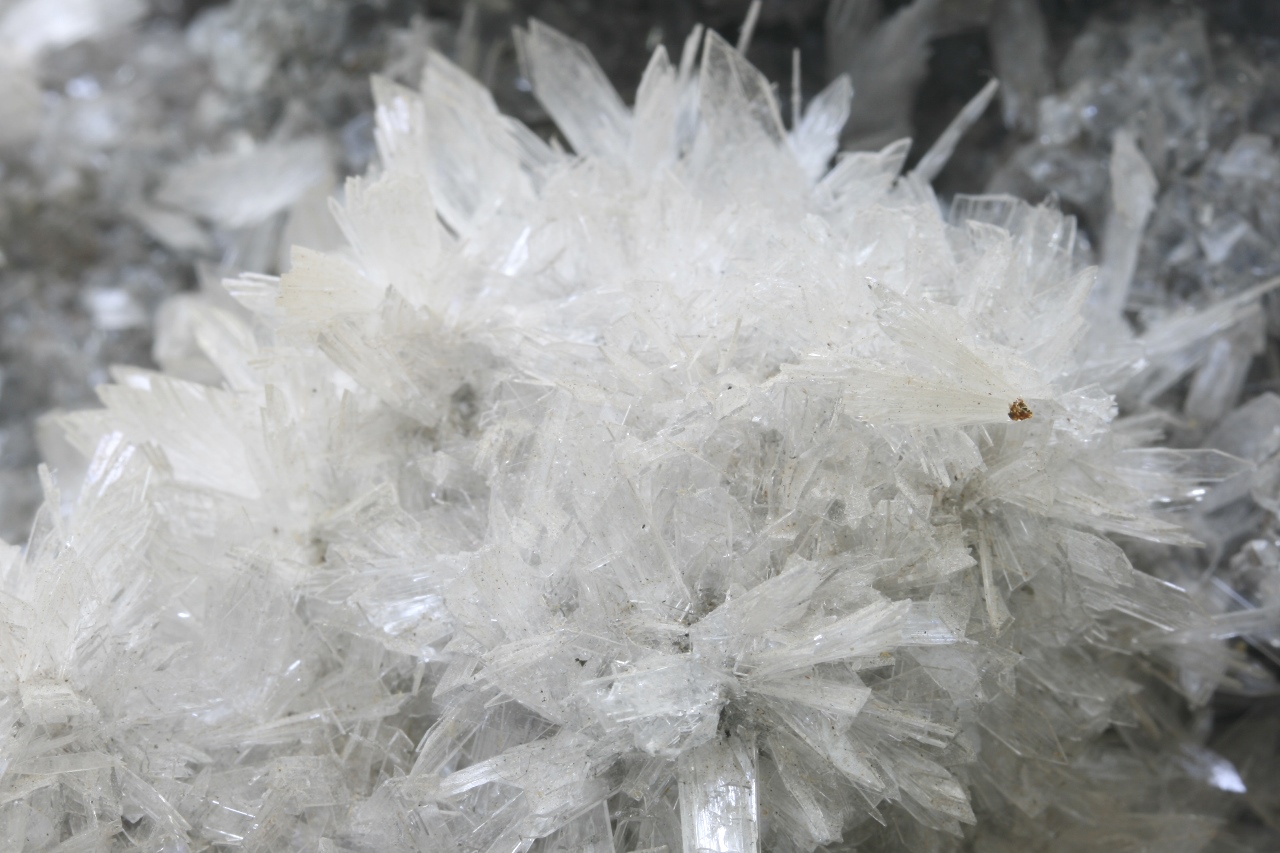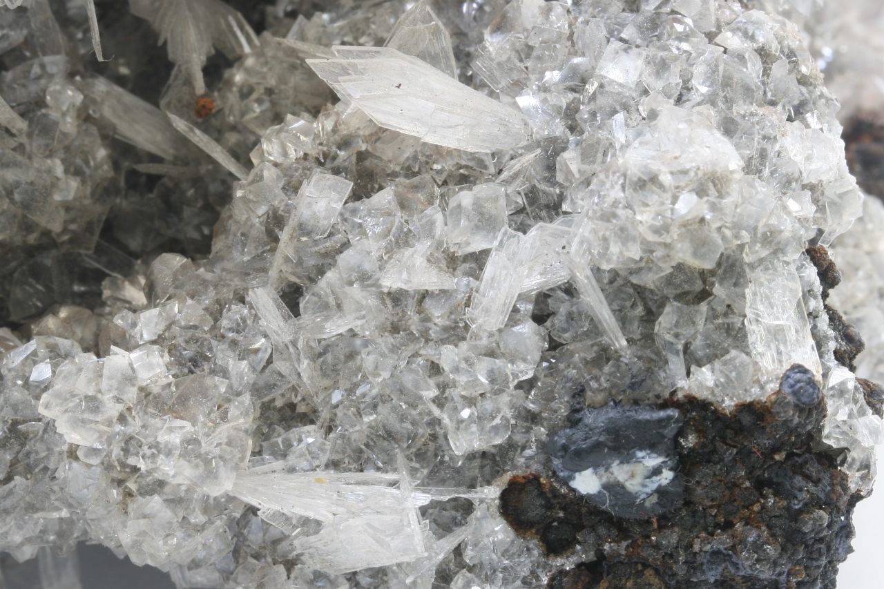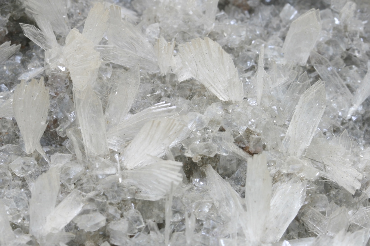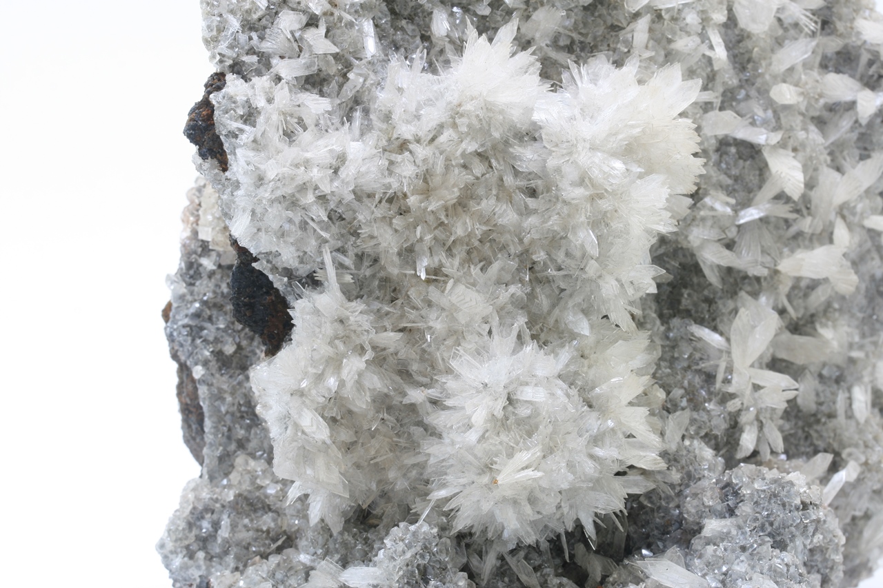 Großer, ästhetischer Probe von weißen, bis zu 1 cm großen Fächern von Hemimorphit, die auf den Rhomboedern von Kalcit gewachsen sind.