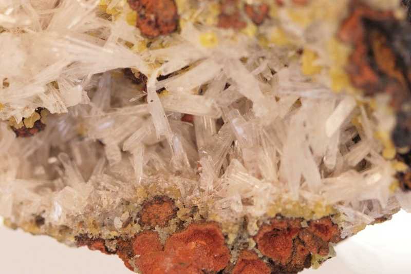 Schönes Exemplar von sekundären Mineralien aus einer klassischen Lokalität. Weiße stängelige Kristalle von Hemimorphit mit gelben kugelförmigen Aggregaten von Mimetesit.