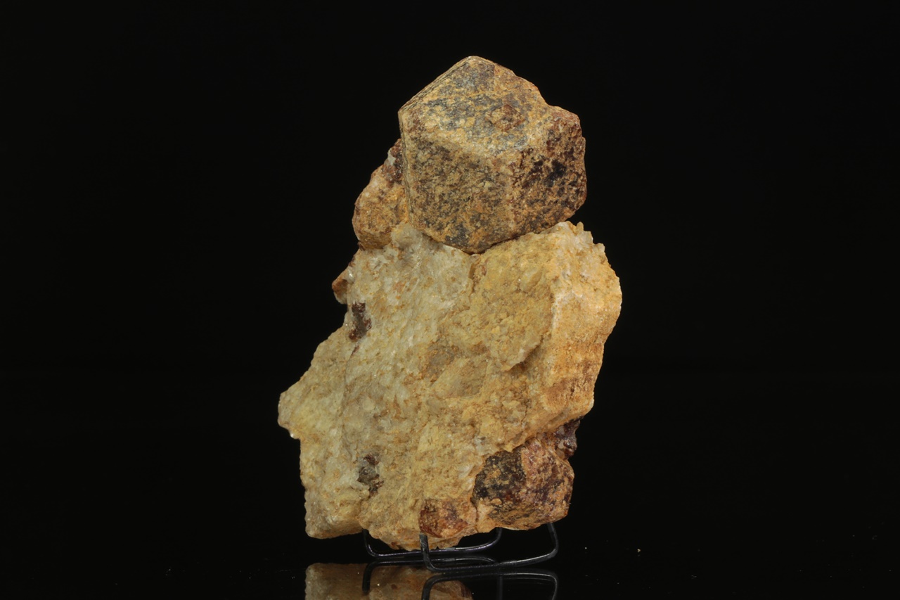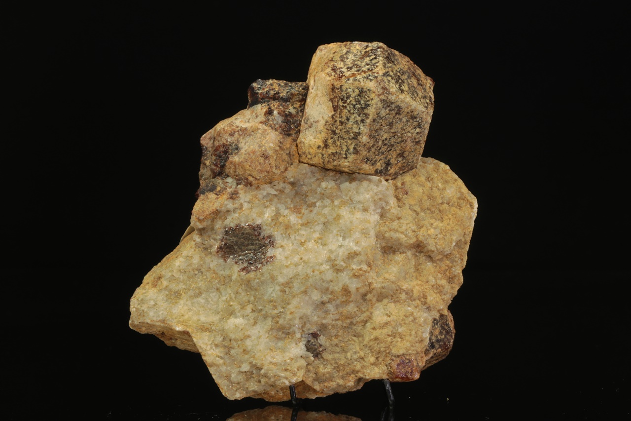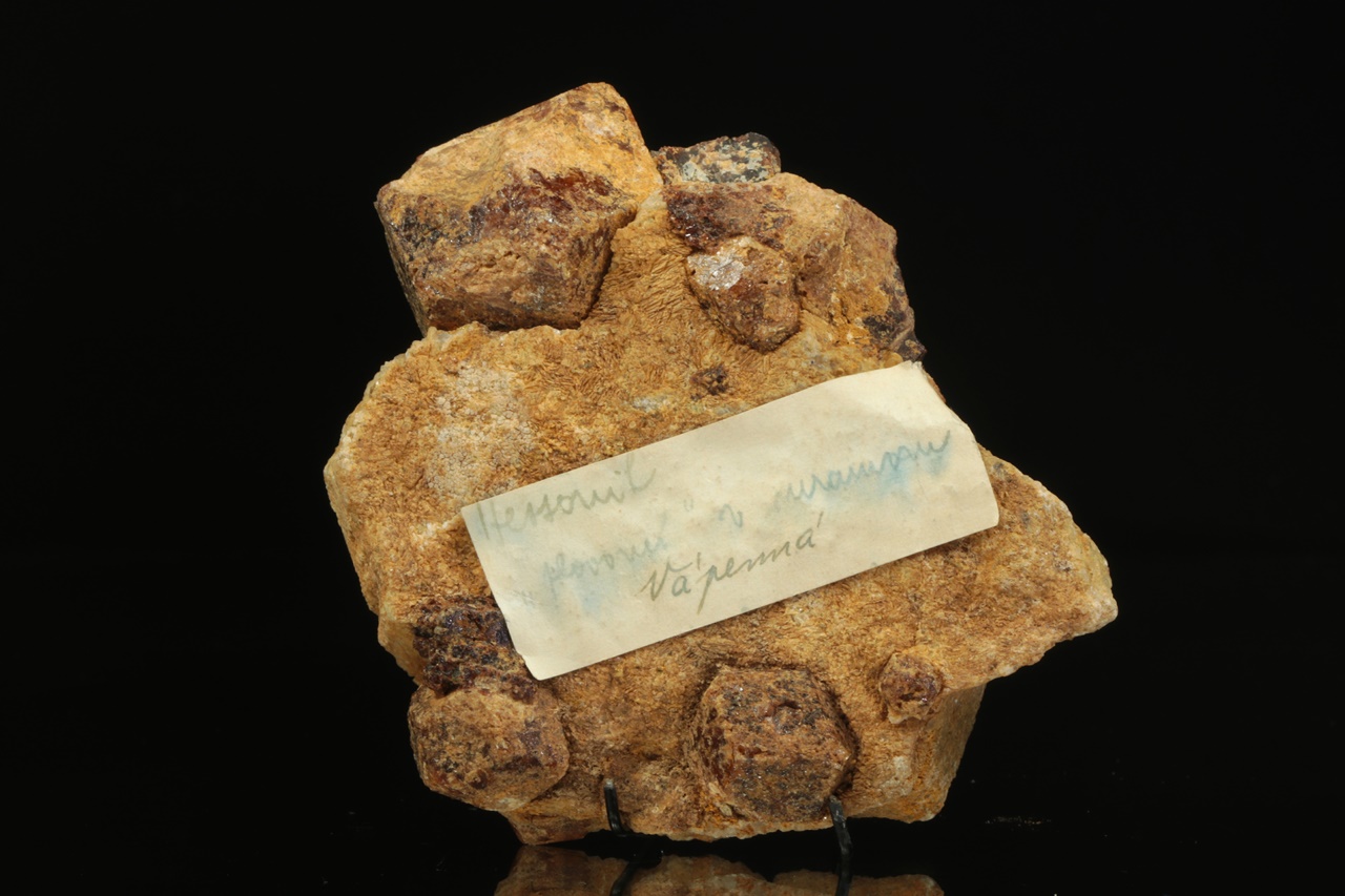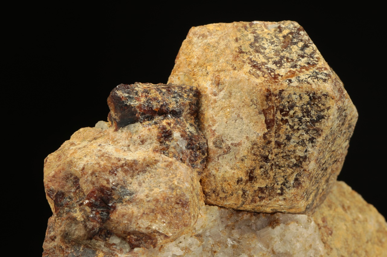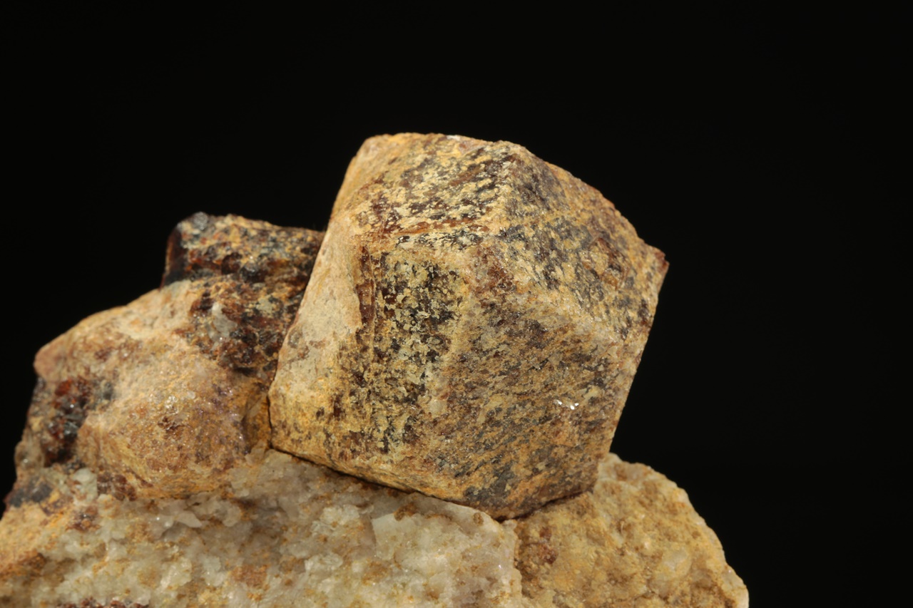 Rombododekaedrische Kristalle von beige-braunem, calciumreichem Granat im Kalkstein. Der größte Kristall ist 4 cm groß.