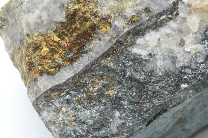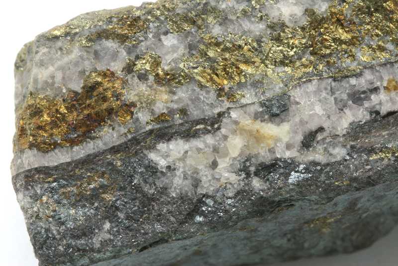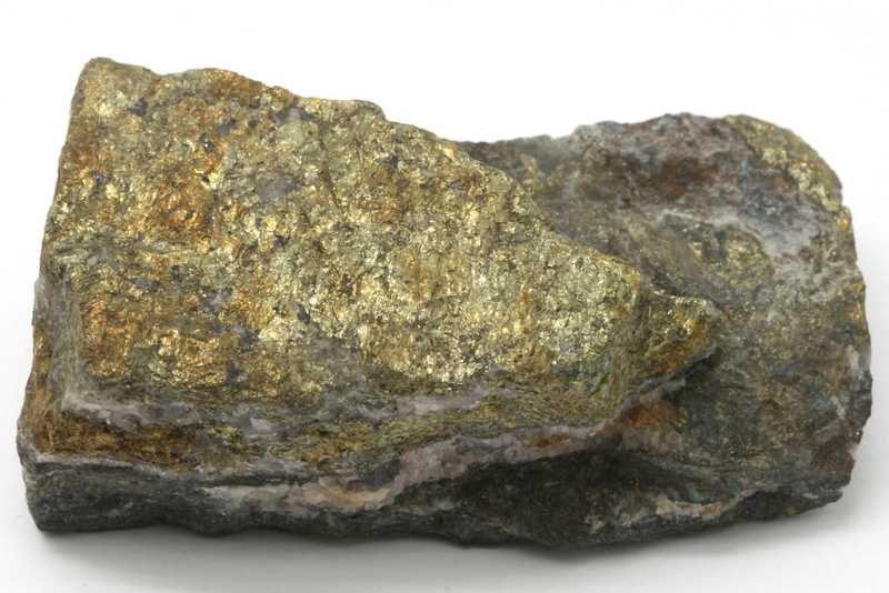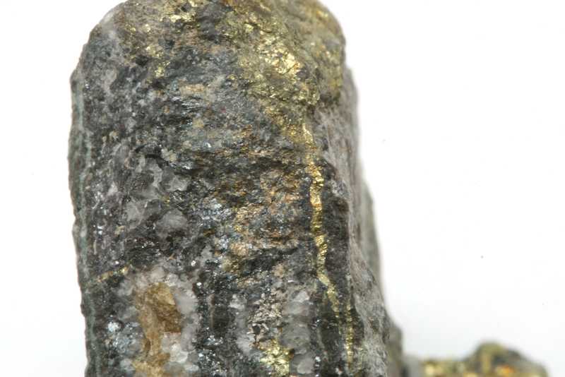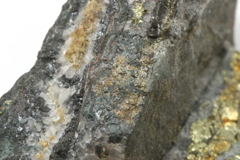 Muster eines seltenen Sulfids aus Wismut und Kupfer – Hodrušit aus dem Typlokalität. Hochwertiges Muster von metallisch glänzenden, bronzefarbenen Aggregaten des seltenen Hodrušits, welche eine Ader mit einer Mächtigkeit von bis zu 15 mm durchdringen .