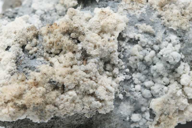 Weiße Aggregate von Magnesiumkarbonat.. Einige mm große nierenförmige Aggregate von Hydromagnesit.