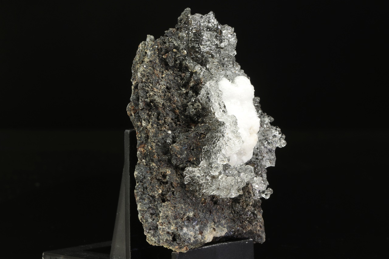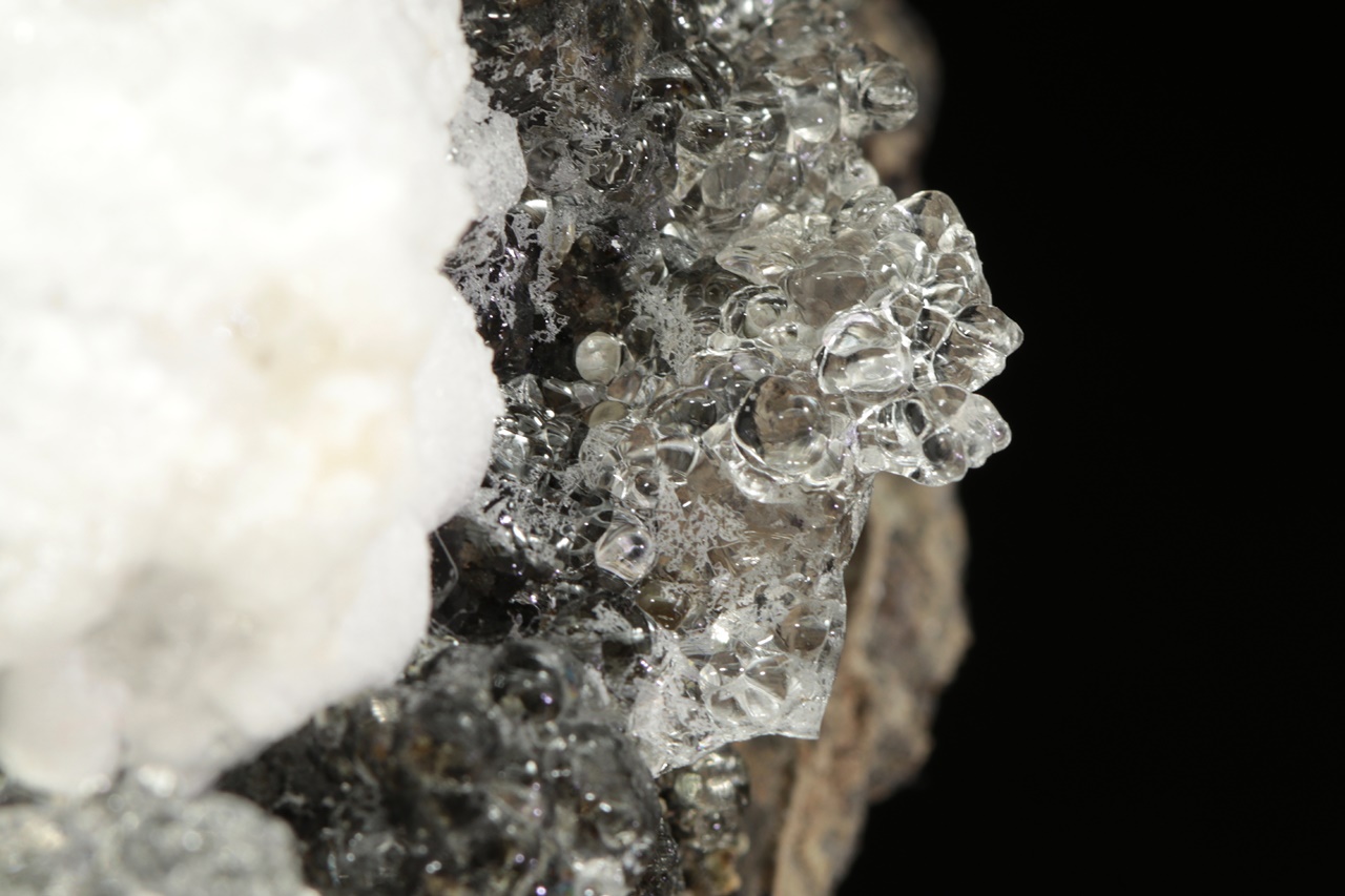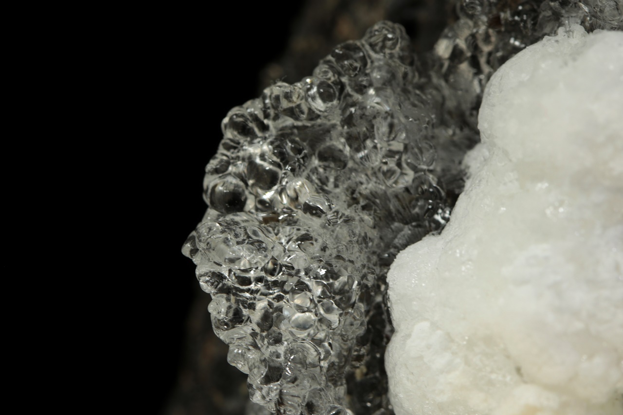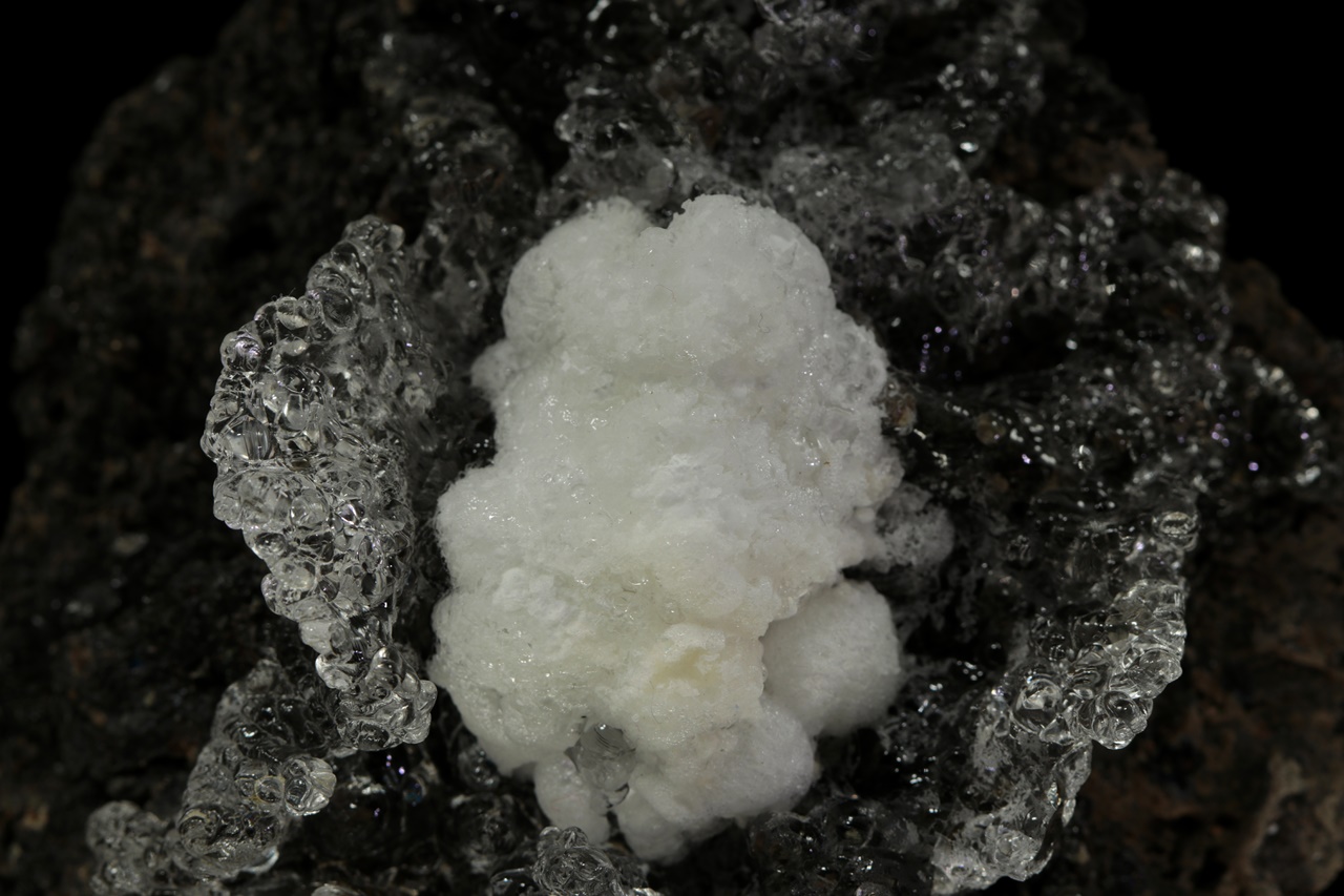 Wunderschöne Krone aus klarem Opal auf dunklem Untergrund, die den Eindruck von spritzender Wasseroberfläche erweckt. Die Krone ist im rechten unteren Bereich an zwei Stellen leicht beschädigt. Die Probe leuchtet unter UV-Licht grün.