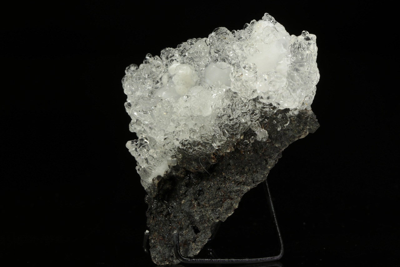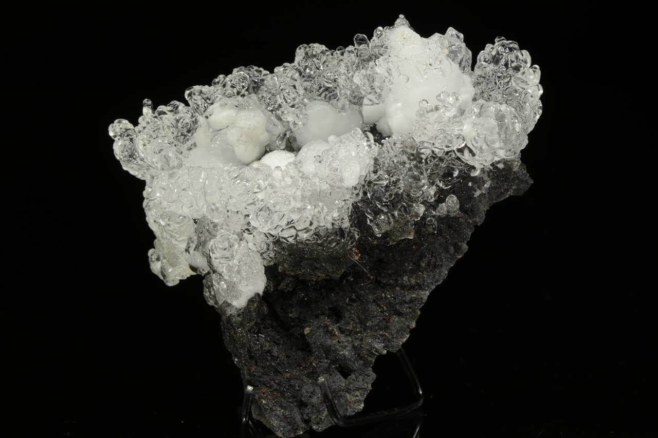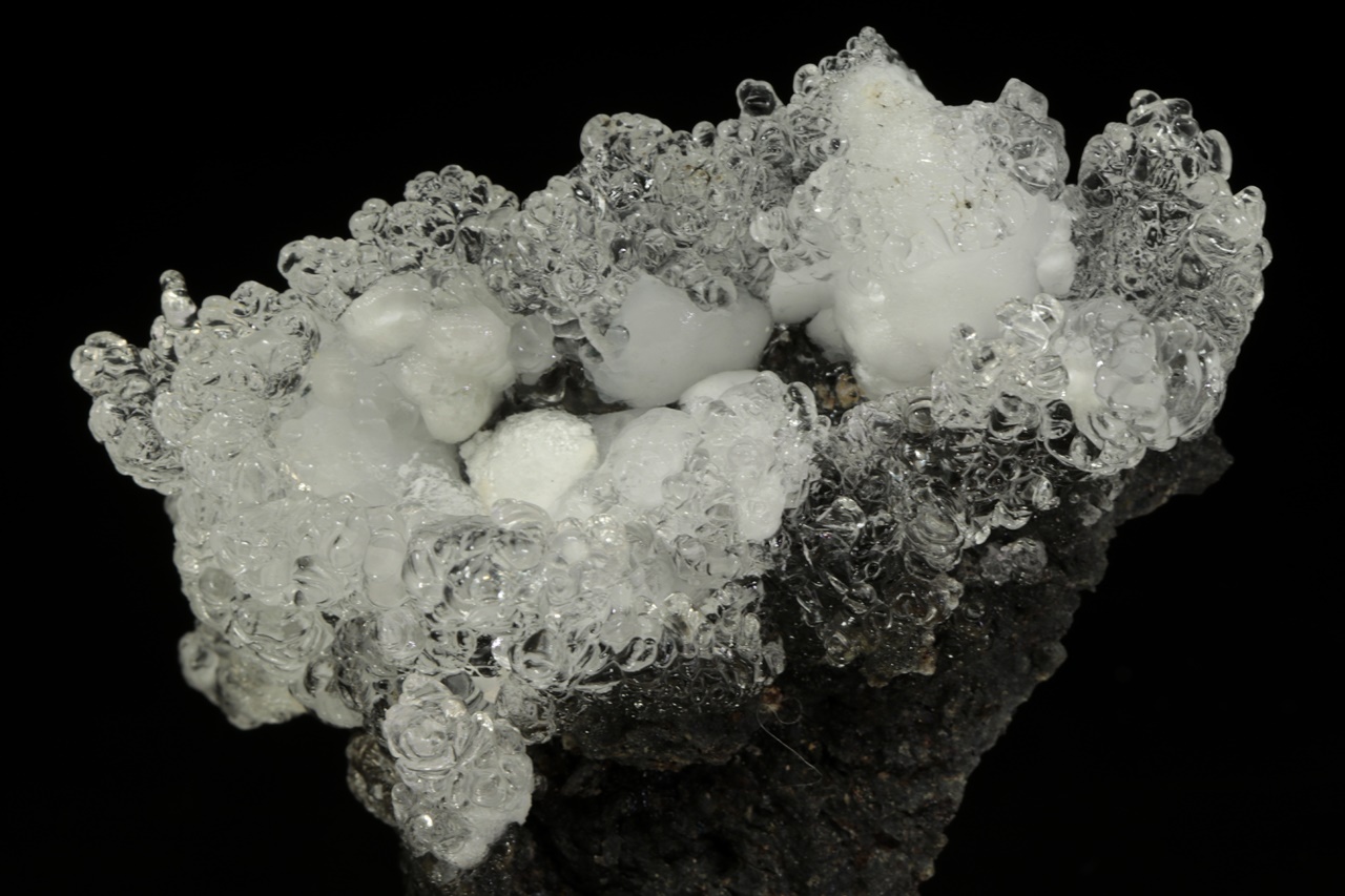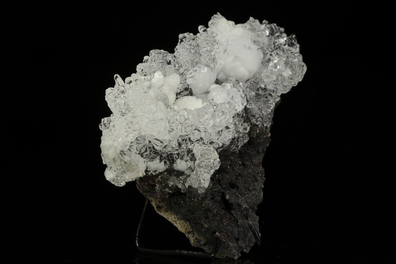 Prächtiges Exemplar eines reich gewachsenen farblosen Opals, der eine 7 cm große Krone bildet. Die Probe leuchtet unter UV-Licht grün.