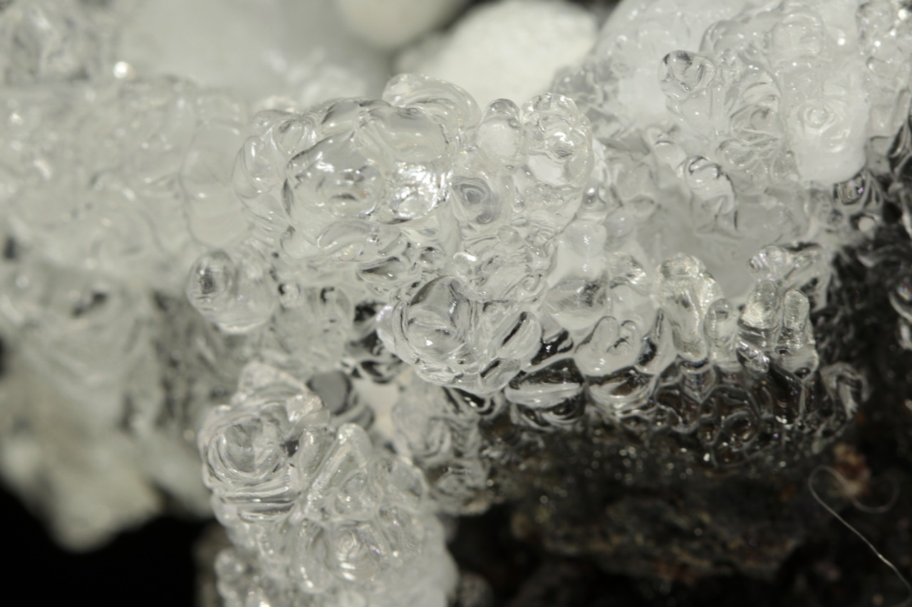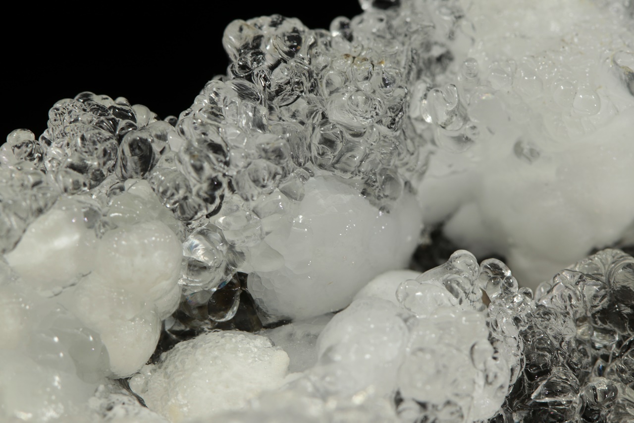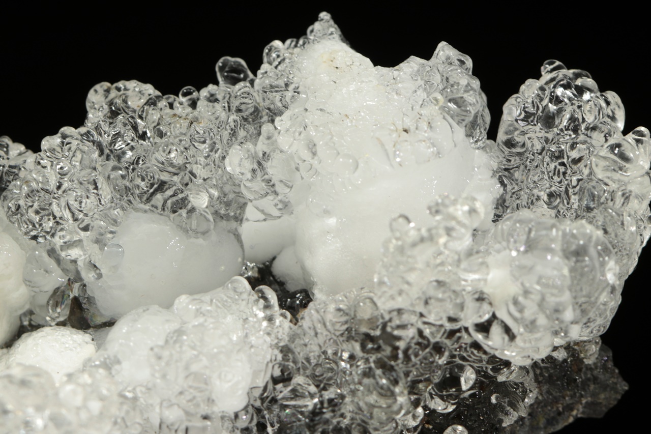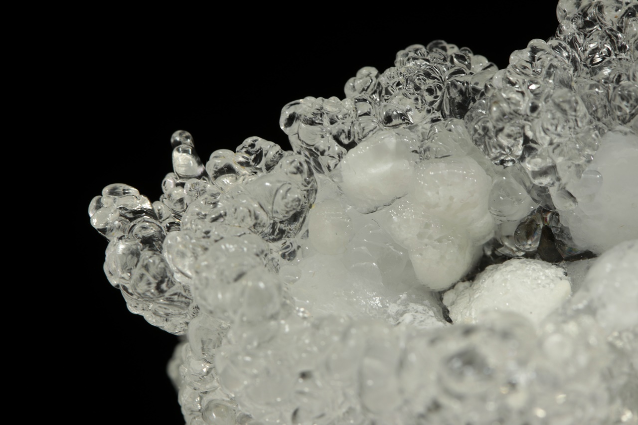 Prächtiges Exemplar eines reich gewachsenen farblosen Opals, der eine 7 cm große Krone bildet. Die Probe leuchtet unter UV-Licht grün.
