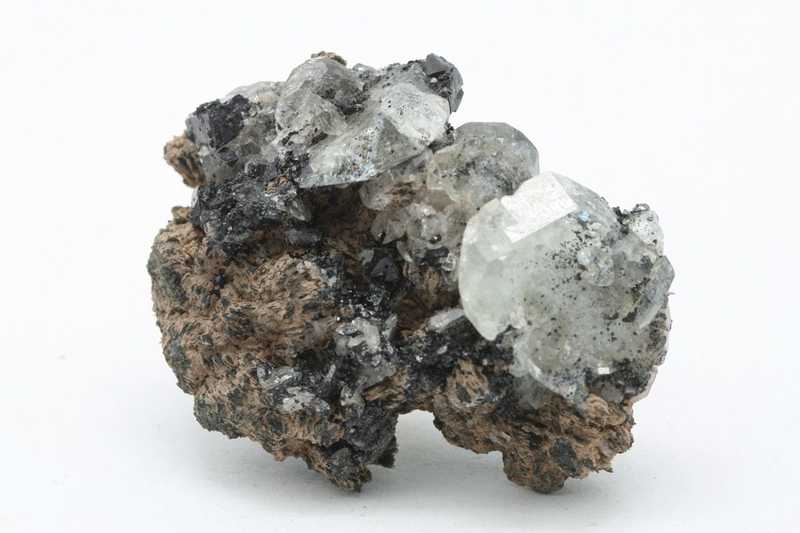 Schöne Probe von schwarzem Ilvait mit ausgeprägter prismatischer Riefung mit klaren basalen Apatitkristallen, die auf einem faserigen Epidot gewachsen sind. Der größte Ilvaitkristall ist 8 mm groß, Apatit misst 2,5 mm.
