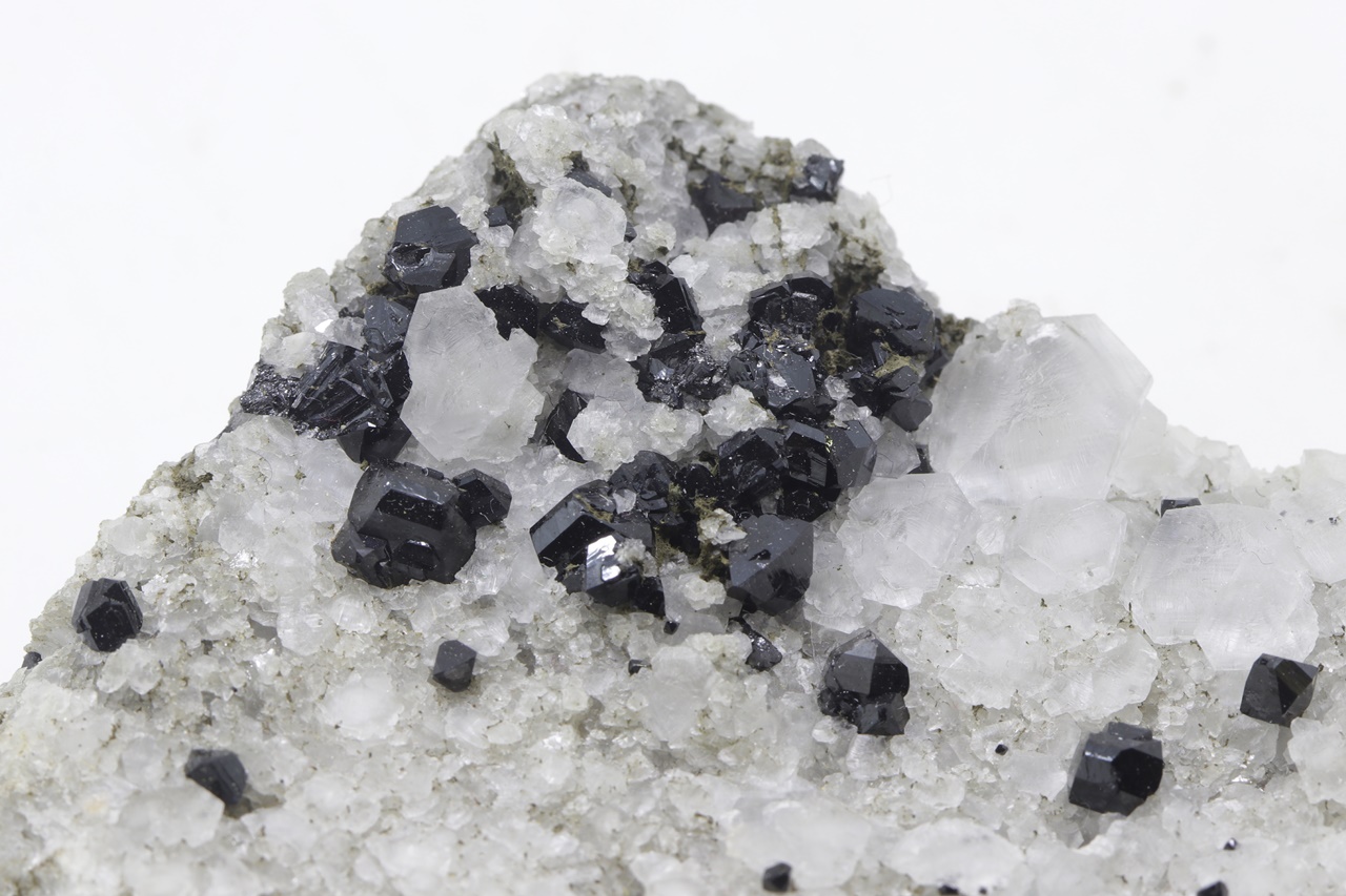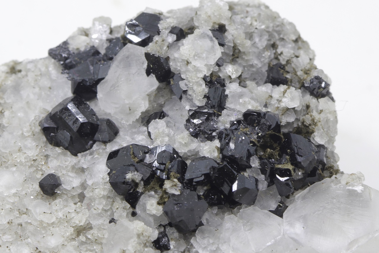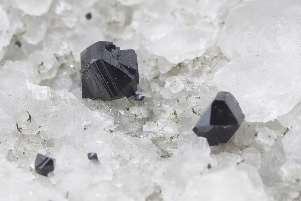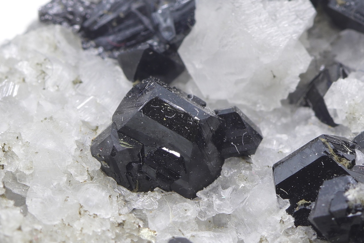 Druse von schwarzen, hochglänzenden Elbait-Kristallen, die auf einem kontrastierenden weißen Calcit gewachsen sind. Der größte Elbait-Kristall ist 5 mm groß.