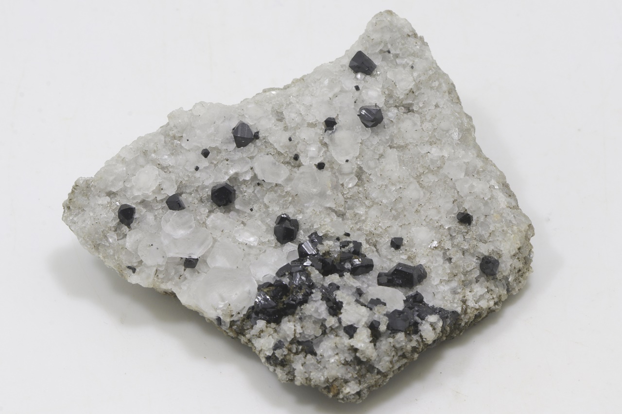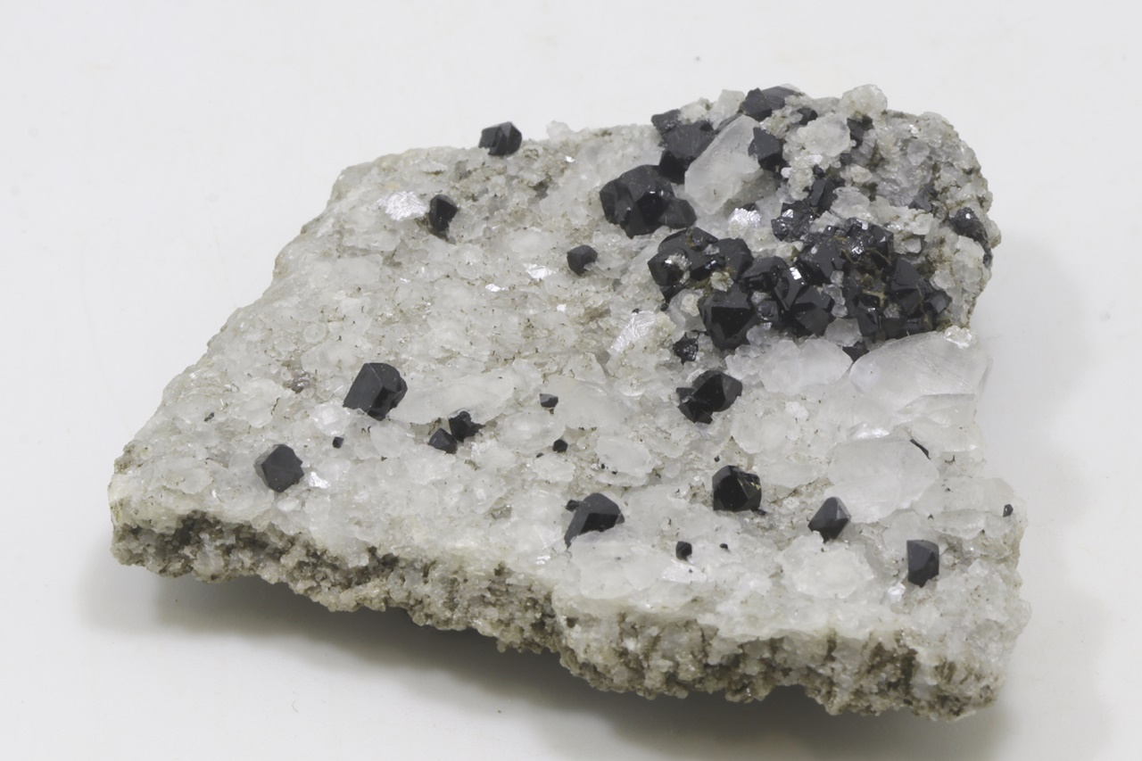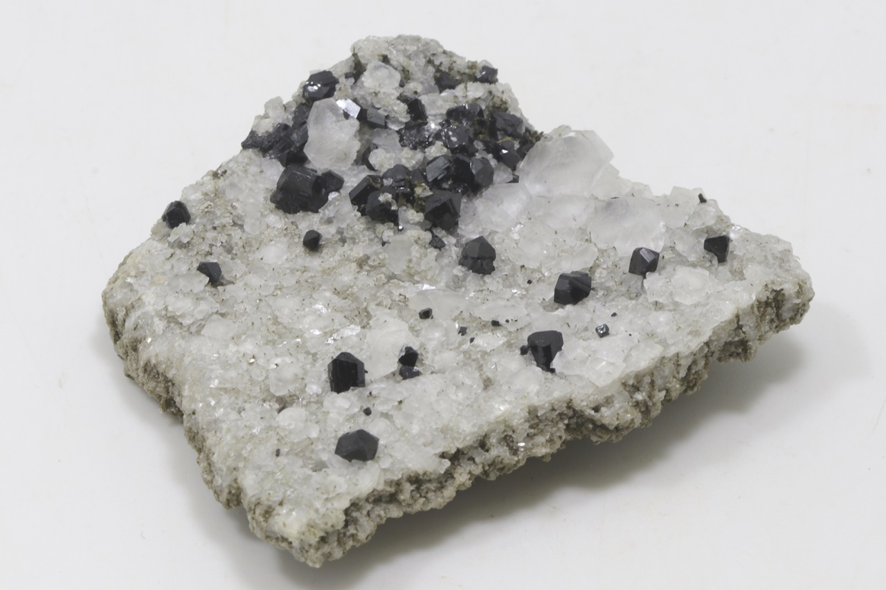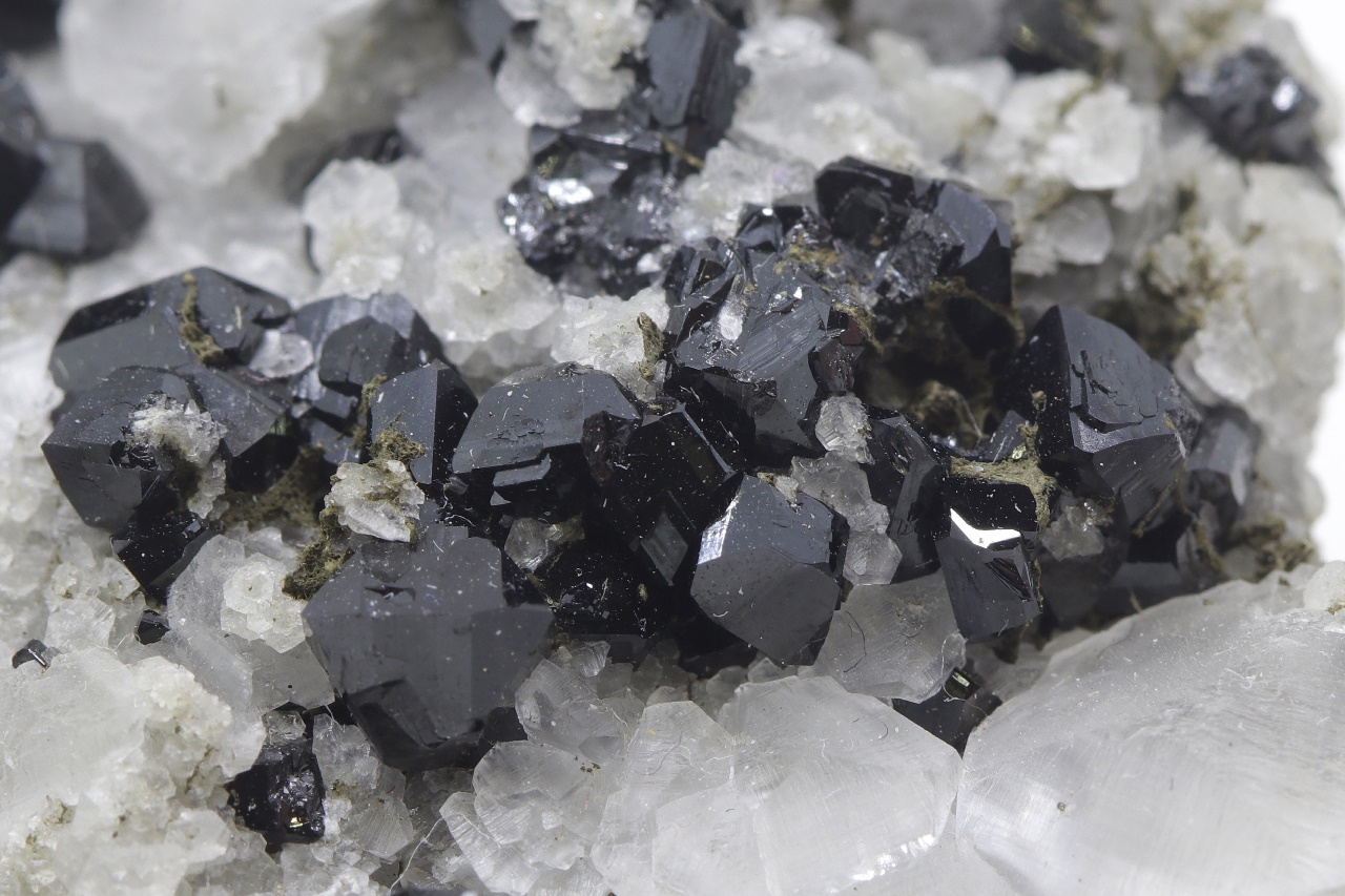 Druse von schwarzen, hochglänzenden Elbait-Kristallen, die auf einem kontrastierenden weißen Calcit gewachsen sind. Der größte Elbait-Kristall ist 5 mm groß.
