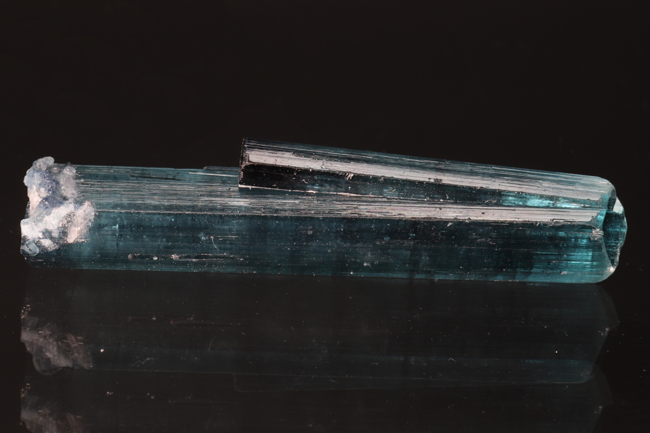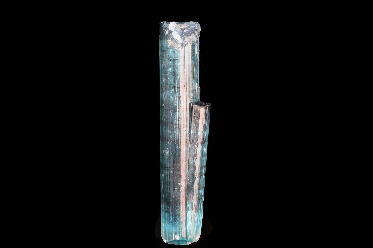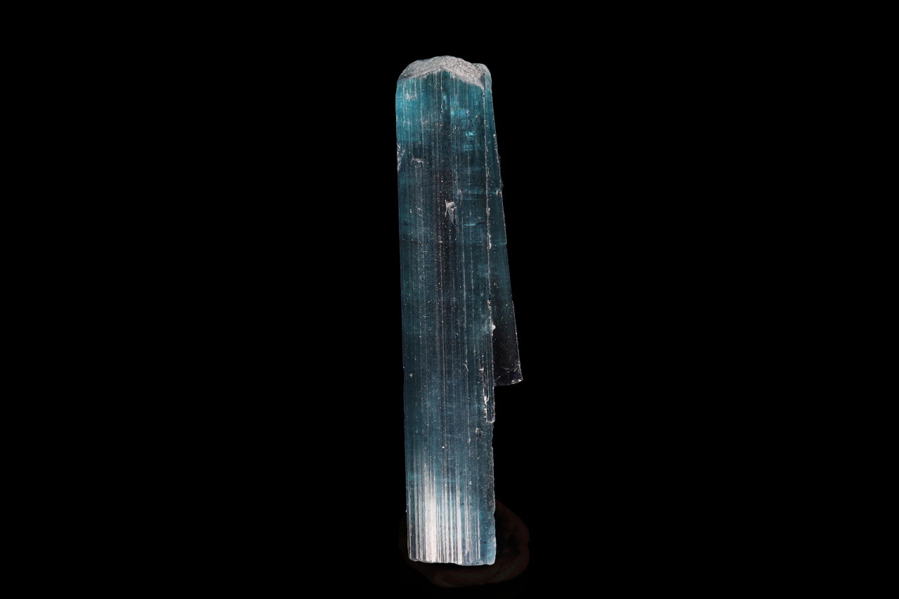 Glänzende, längsgeriefte Verwachsung von durchsichtigen, intensiv blauen Kristallen des Turmalins, sogenannter Indigolith. Die Probe ist auf der einen Seite von Kristallflächen begrenzt, auf der anderen Seite teilweise von einer Kristallfläche und teilweise von einer unregelmäßigen Berührung mit dem ursprünglichen Untergrund. Ein kleinerer, seitlich angewachsener Kristall hat eine schwarze Endung, sogenannte Mohrenkopfspitze. Schöne Verwachsung von Kristallen für Turmalin der seltenen blauen Farbe aus der Region Kunar in Afghanistan.