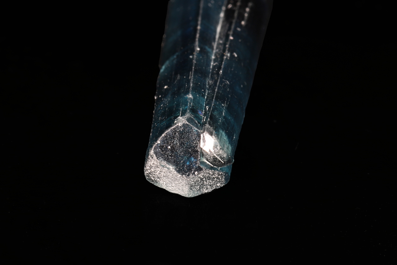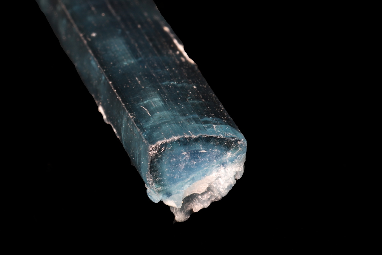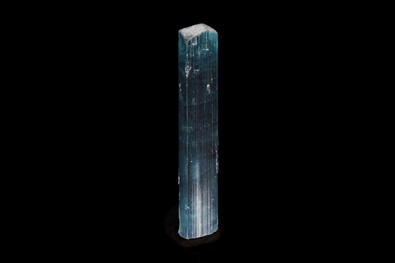 Glänzende, längsgeriefte Verwachsung von durchsichtigen, intensiv blauen Kristallen des Turmalins, sogenannter Indigolith. Die Probe ist auf der einen Seite von Kristallflächen begrenzt, auf der anderen Seite teilweise von einer Kristallfläche und teilweise von einer unregelmäßigen Berührung mit dem ursprünglichen Untergrund. Ein kleinerer, seitlich angewachsener Kristall hat eine schwarze Endung, sogenannte Mohrenkopfspitze. Schöne Verwachsung von Kristallen für Turmalin der seltenen blauen Farbe aus der Region Kunar in Afghanistan.