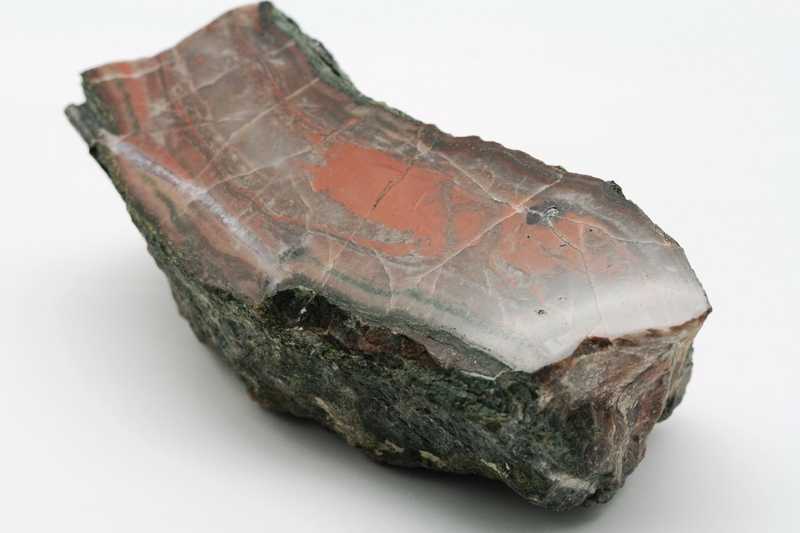 Skvrny und Schichten aus rotem Jaspis in hellem Gestein mit einer feinen Amethystader. Polierter Jaspis-Muster von einem klassischen Fundort.