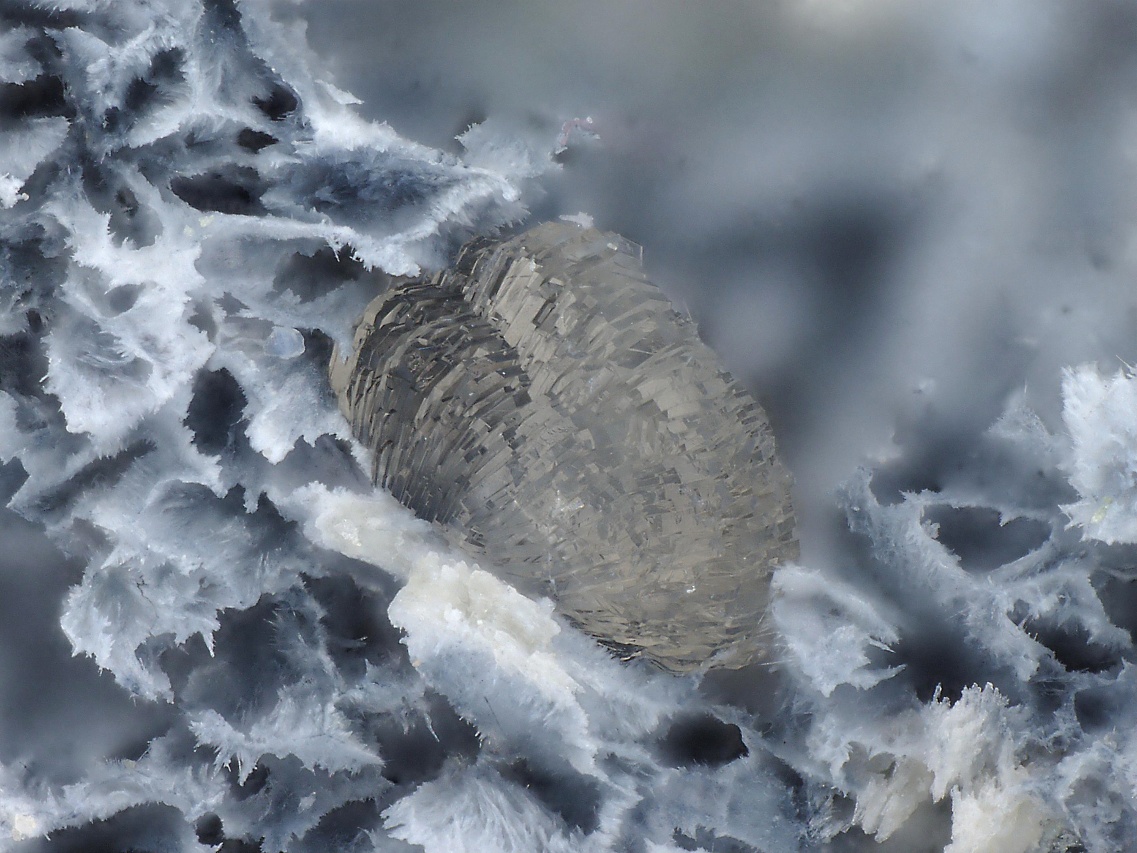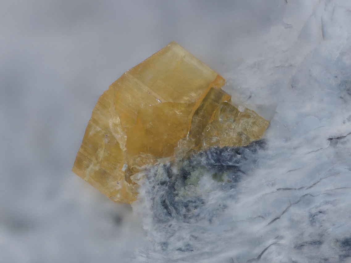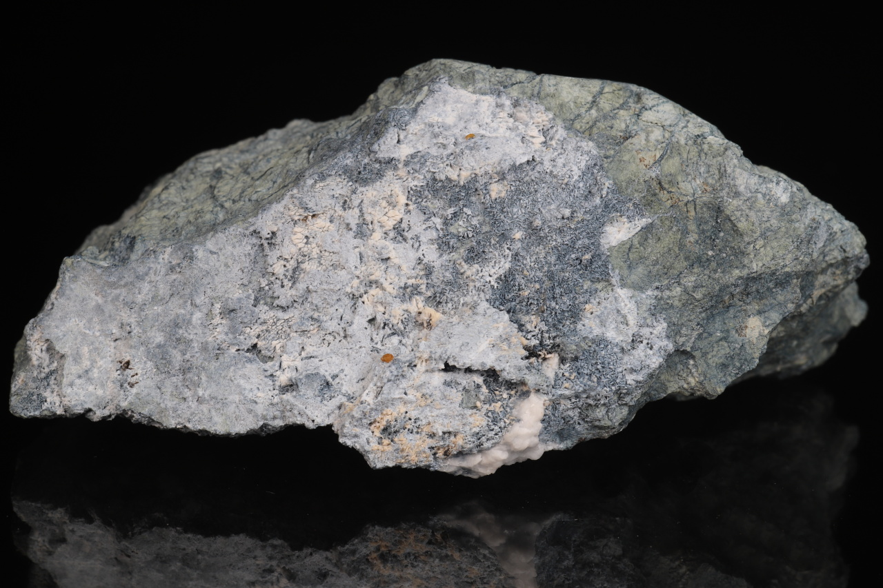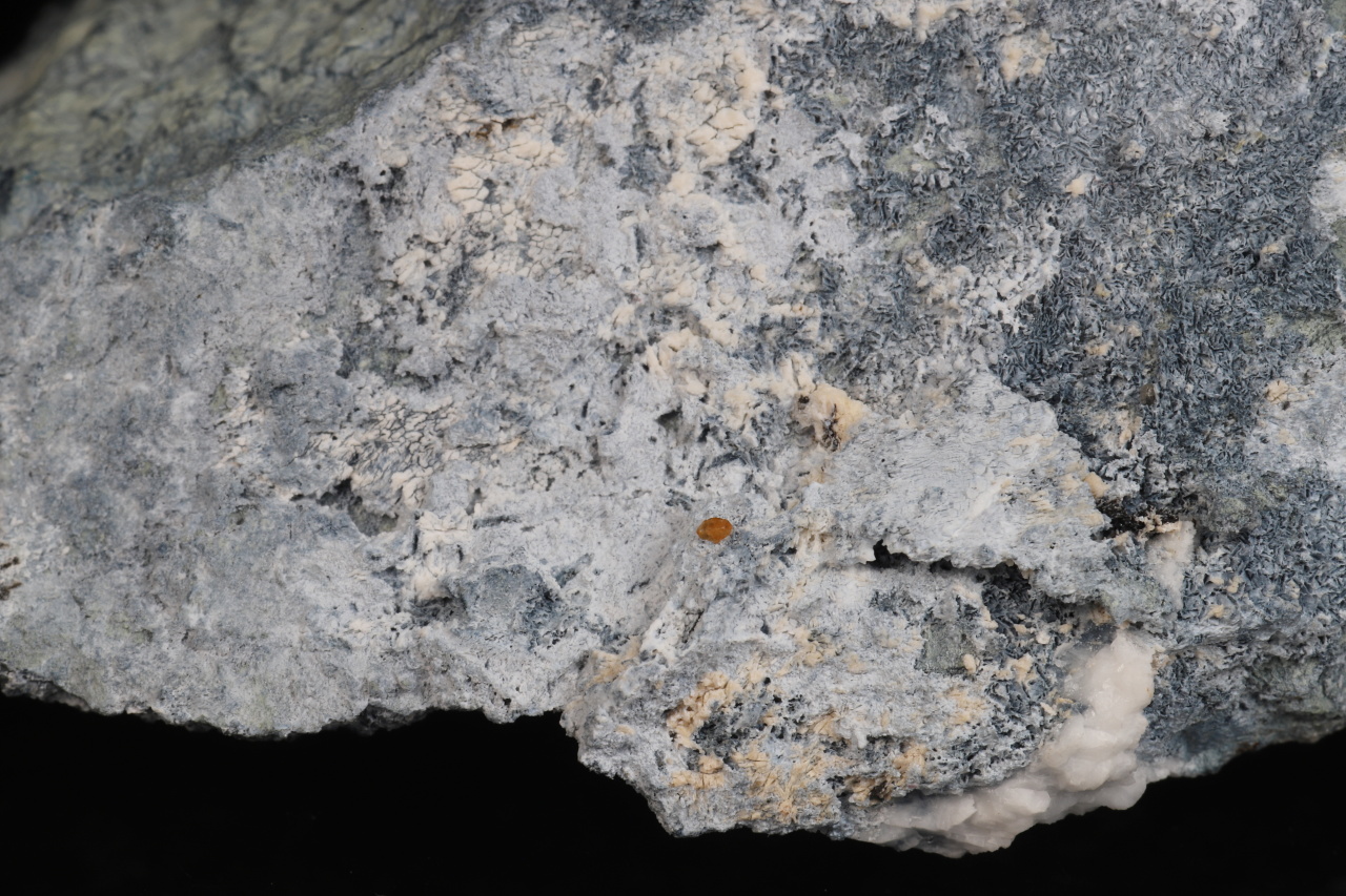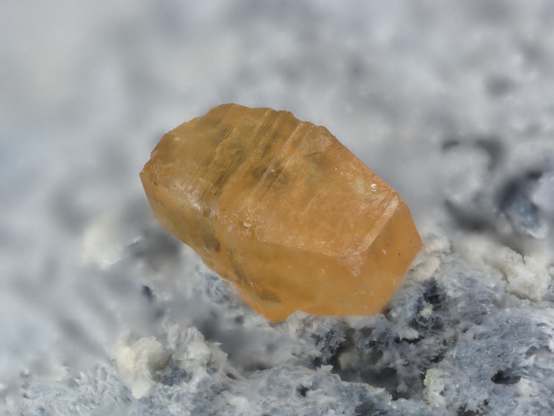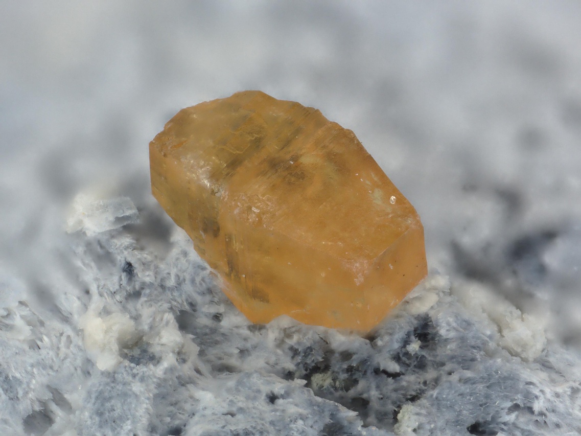 Vzorek oranžových krystallů a srostlic vzácného silikátu ceru a barya joaquinitu-(Ce), který tvoří krystaly do velikosti cca 1,5 mm. Na vzorku jsou velmi drobné drúzy a kulovité srostlice čirého extrémně vzácného jonesitu (silikátu barya, titanu, hliníku a dalších prvků). Pro oba tyto minerály je naleziště San Benito, ze kterého tato ukázka pochází, typovou lokalitou.