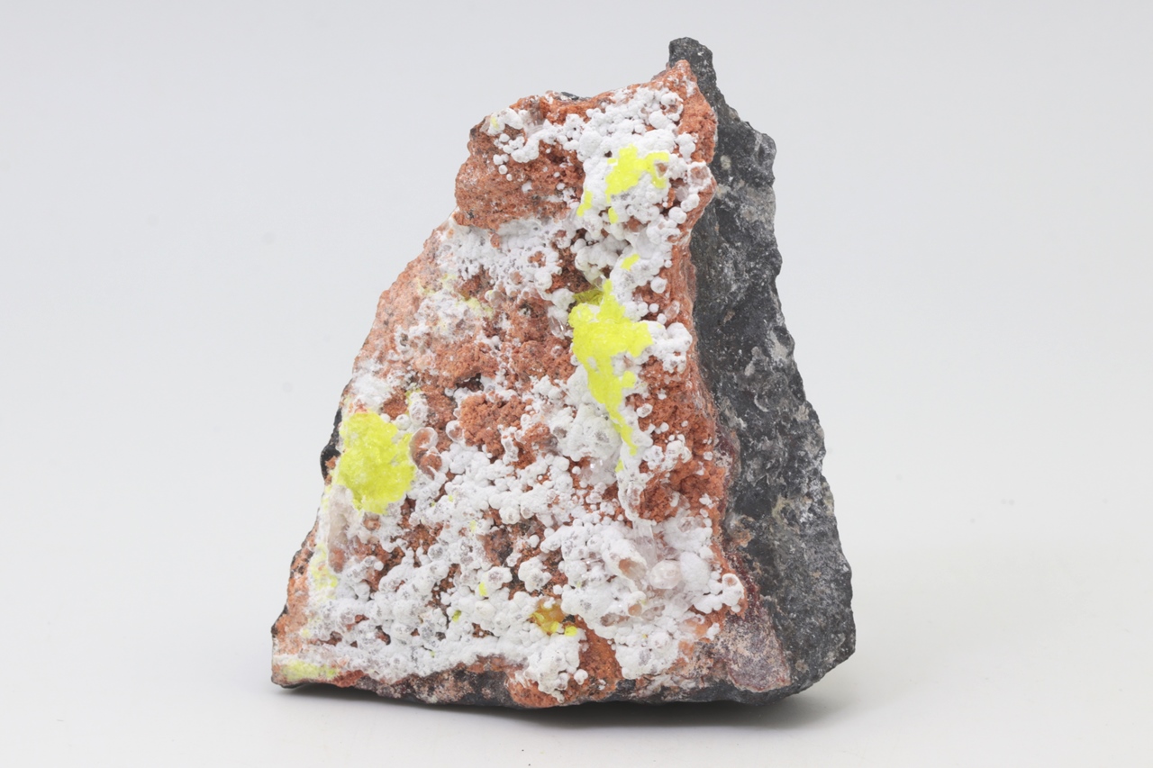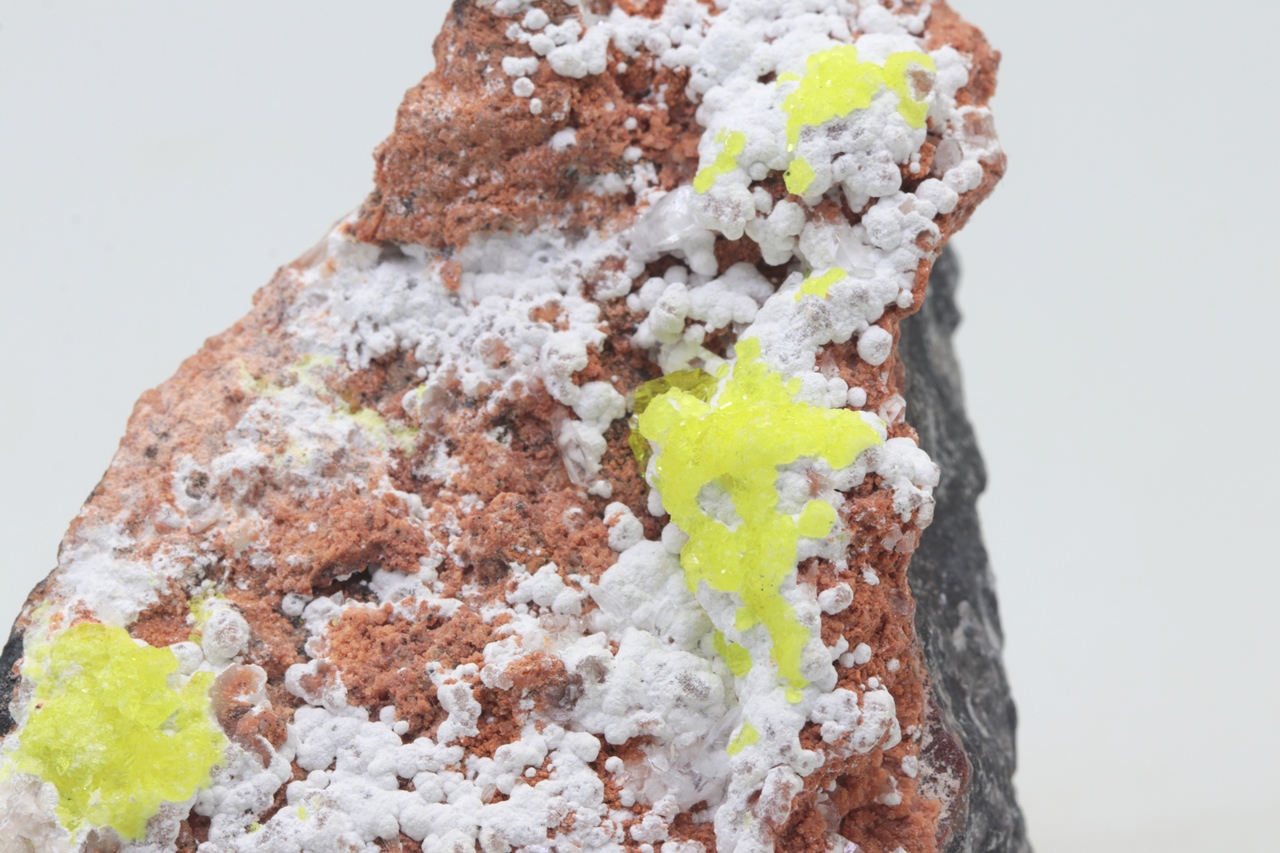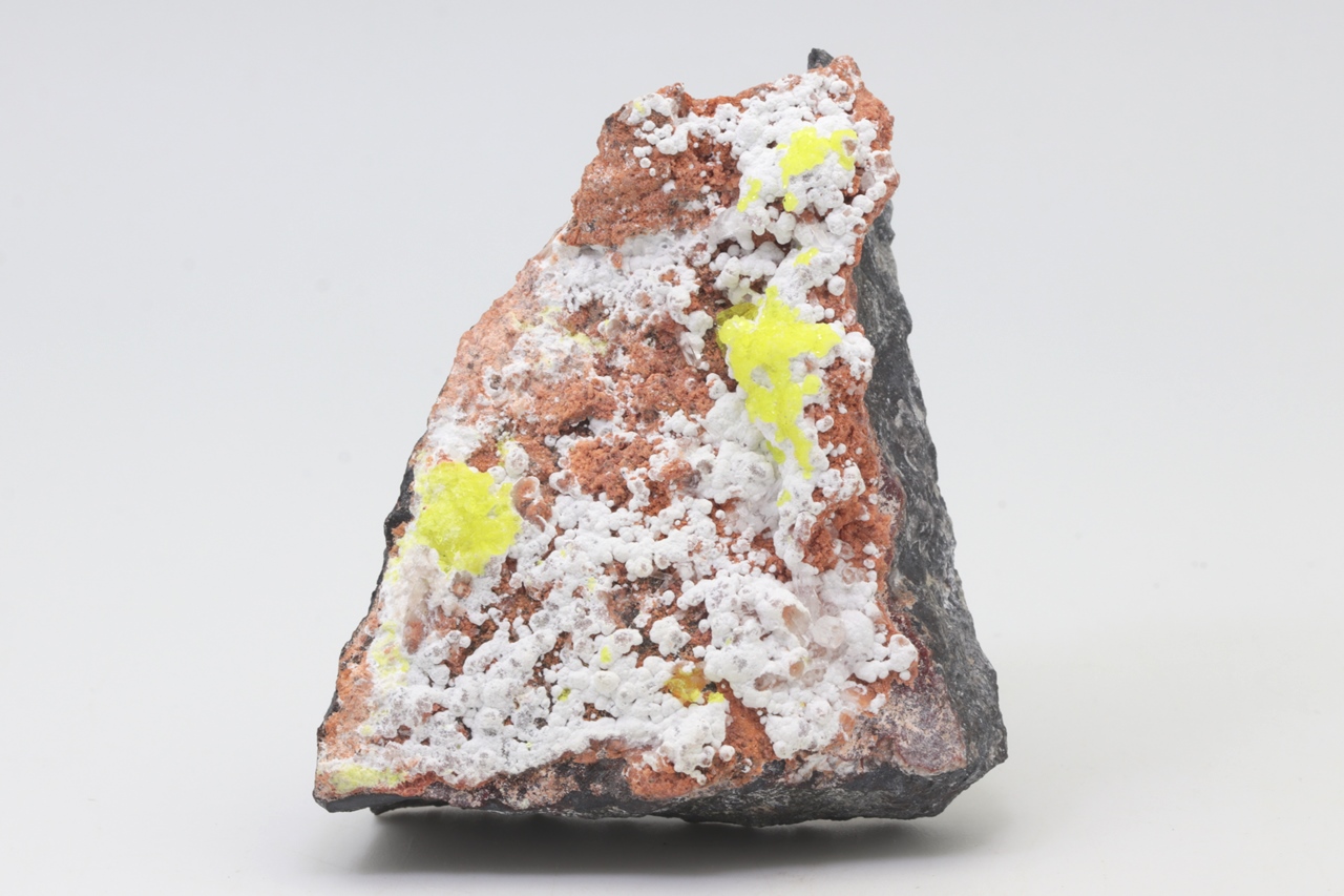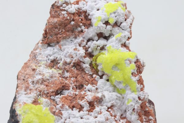 Jouravskit ist weltweit ein seltener Mineral. Es kommt nur an sechs Standorten vor. Jouravskit bildet auf der Probe kleine, hexagonale, glasglänzende Kristalle in hellgelber bis kanariengelber Farbe. Die einzelnen Kristalle von Jouravskit sitzen auf kreideweißen, matten kugelförmigen Aggregaten von Xonolith. Alle oben genannten Minerale sitzen auf einer orange gefärbten und dunkelgrauen Grundgestein. Es handelt sich um ein sehr ästhetisches und schönes Beispiel dieses Minerals aus der Republik Südafrika.