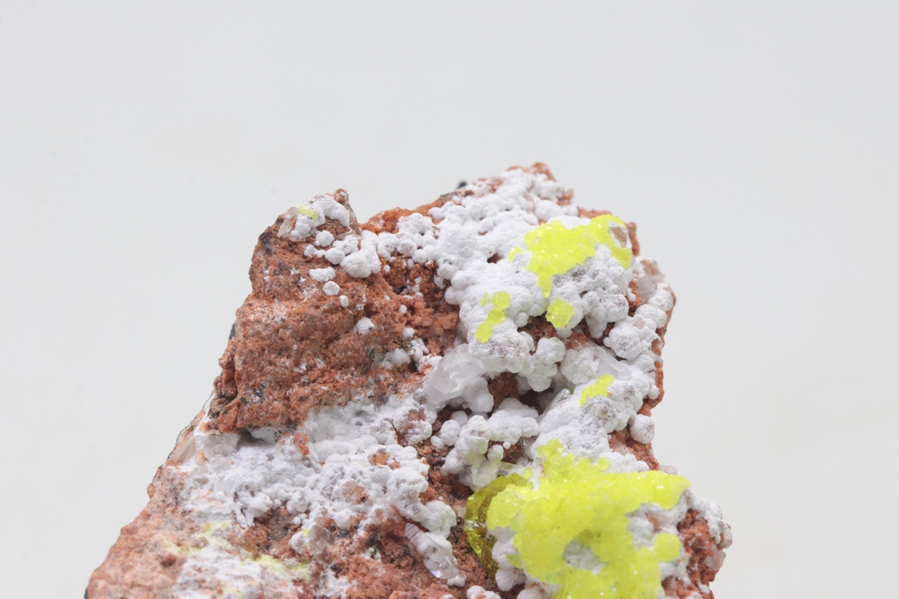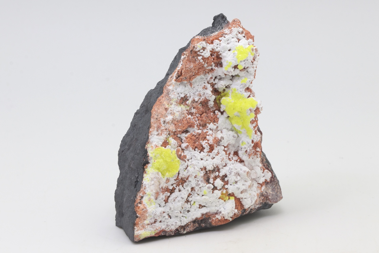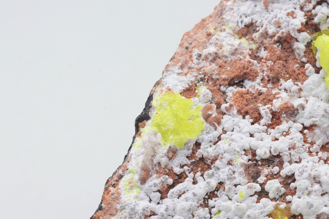 Jouravskit ist weltweit ein seltener Mineral. Es kommt nur an sechs Standorten vor. Jouravskit bildet auf der Probe kleine, hexagonale, glasglänzende Kristalle in hellgelber bis kanariengelber Farbe. Die einzelnen Kristalle von Jouravskit sitzen auf kreideweißen, matten kugelförmigen Aggregaten von Xonolith. Alle oben genannten Minerale sitzen auf einer orange gefärbten und dunkelgrauen Grundgestein. Es handelt sich um ein sehr ästhetisches und schönes Beispiel dieses Minerals aus der Republik Südafrika.