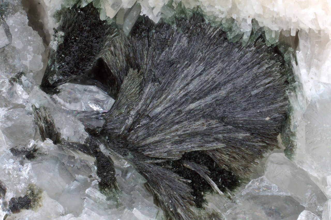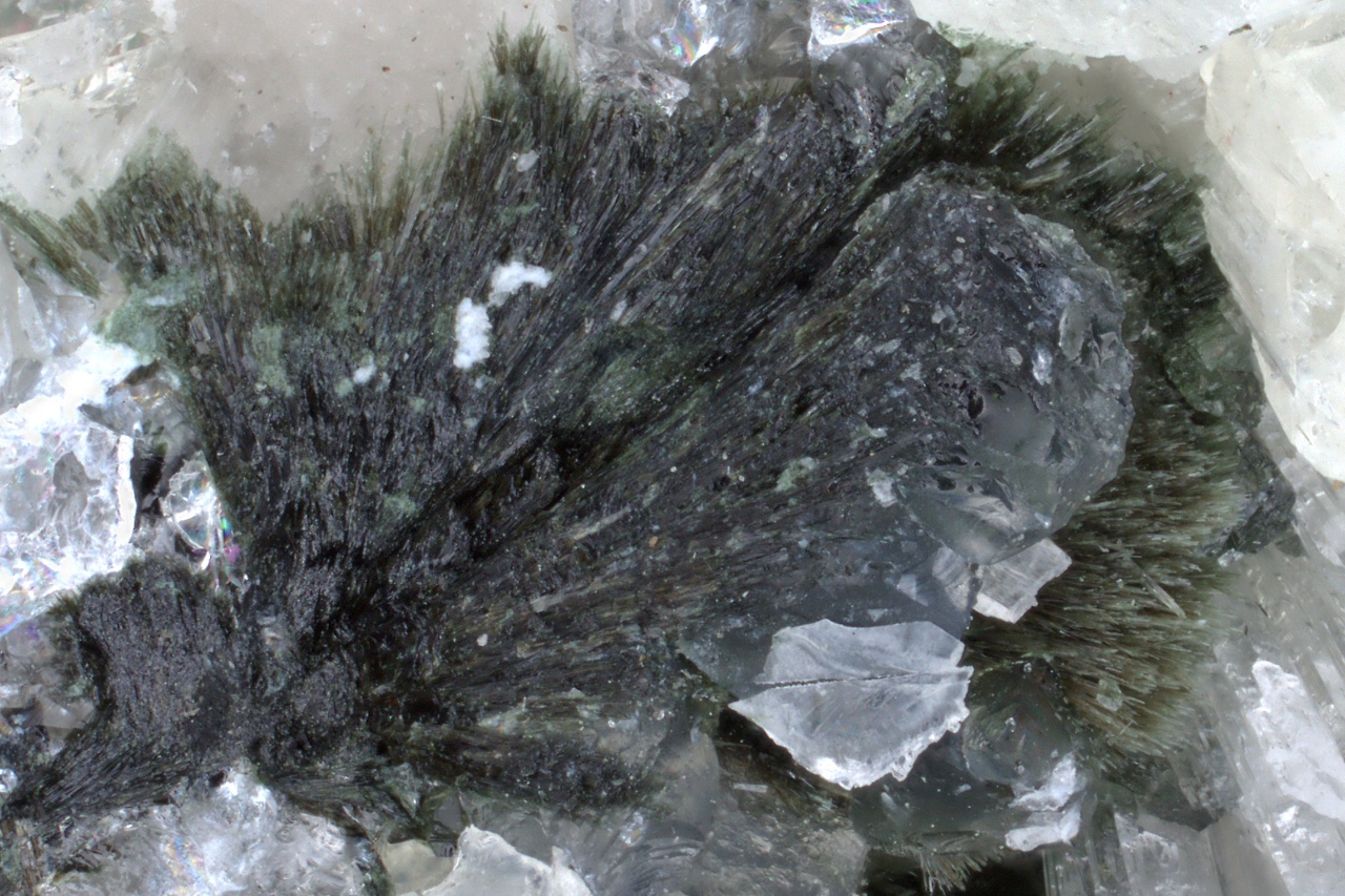 Kvalitní ukázka v České republice nově popsaného vzácného minerálu z pumpellyitové řady julgolditu-Fe2+ ,ktarý tvoří vějířovité agregáty do velikosti 4 mm složené z vláknitých tmavě zelených krystalů. Tyto agregáty narůstají do dutiny spolu s pektolitem a z lokality nově popsaným datolitem. Na tento minerální druh velmi pěkná ukázka, pocházející z kamenolomu v Košťálově.