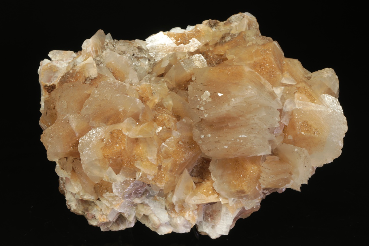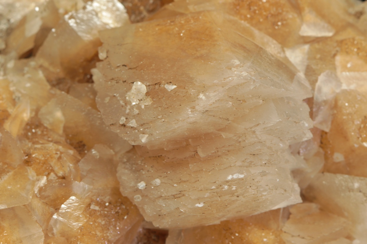 Drúza světlejších klencových krystalů kalcitu porostlých druhou generací menších žlutých kalcitů. Největší krystal je 3 cm velký.