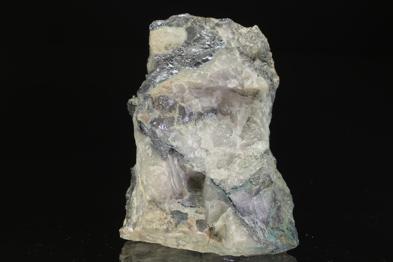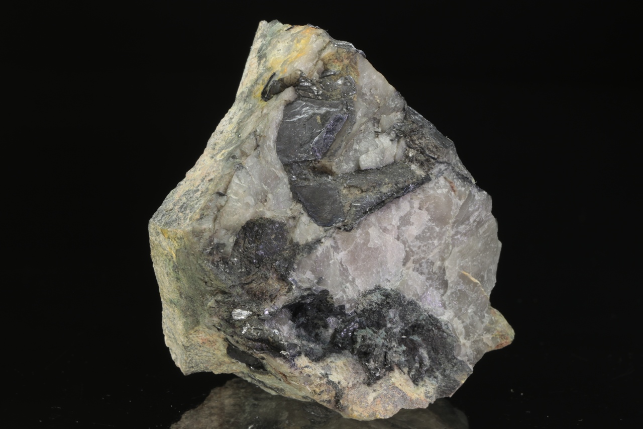 Kovově lesklý Molybdenit přecházející do vzácného, matně černého Kamiokitu v masivním křemeni.