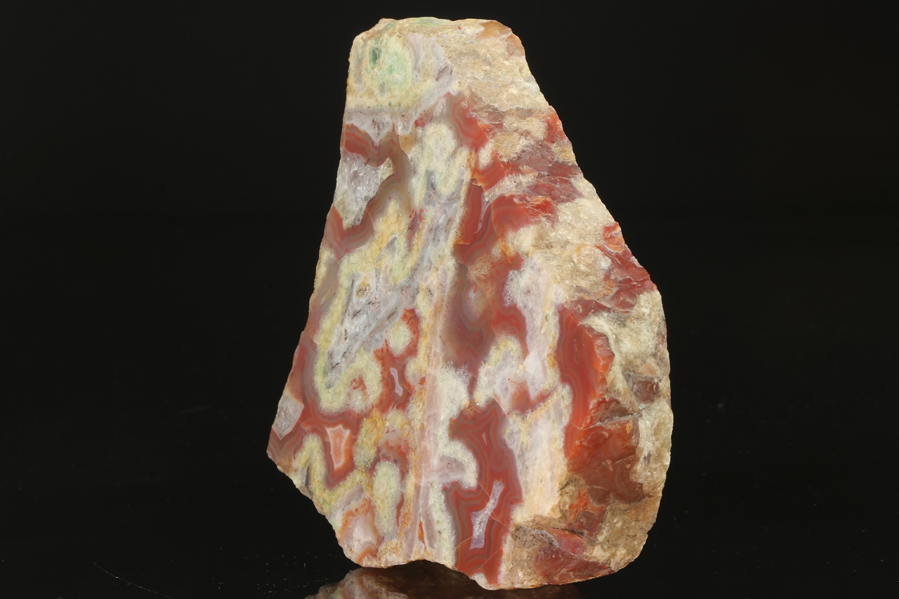 Polierter Muster des glänzenden Fluorits mit orangefarbenem Karneol. Die Probe ist auf der Rückseite abgeschnitten.