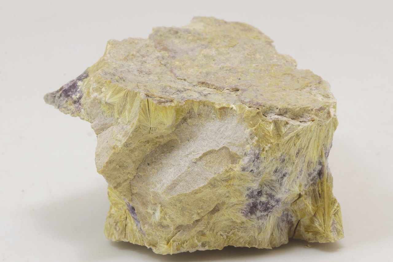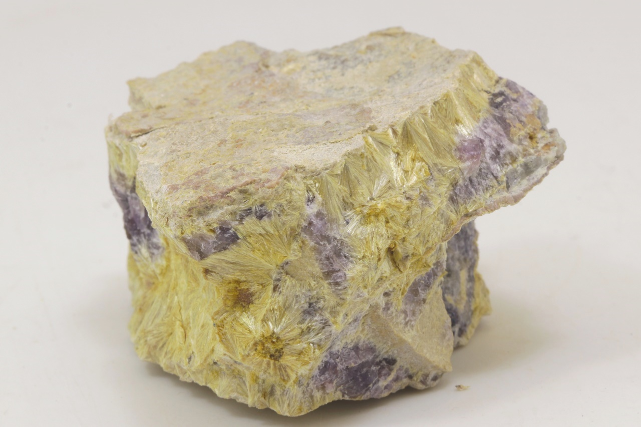 Sattgelbe radiär strahlenförmige Aggregate von Karfolit aus der Typlokalität mit kontrastierendem violetten Fluorit.