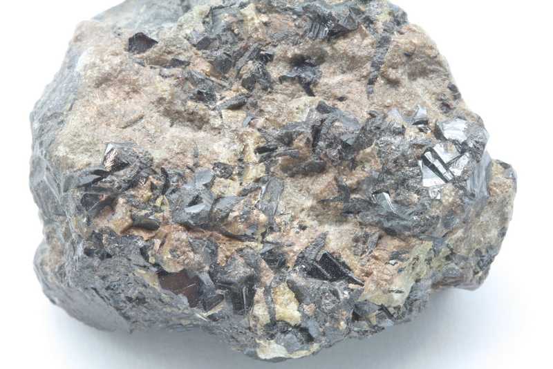Probe von Cassiterit aus Horní Slavkov, Tschechien. Schwarze glänzende Cassiterit-Kristalle.