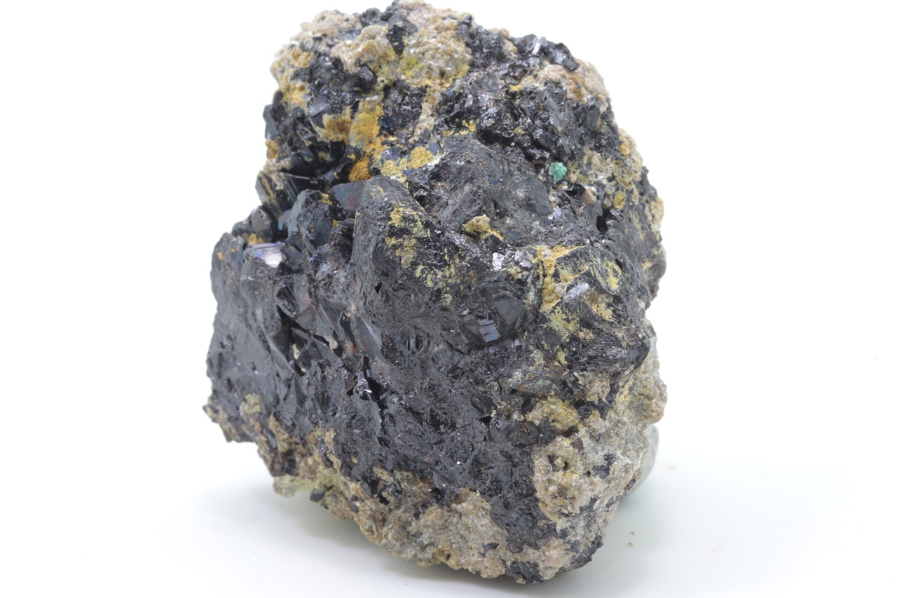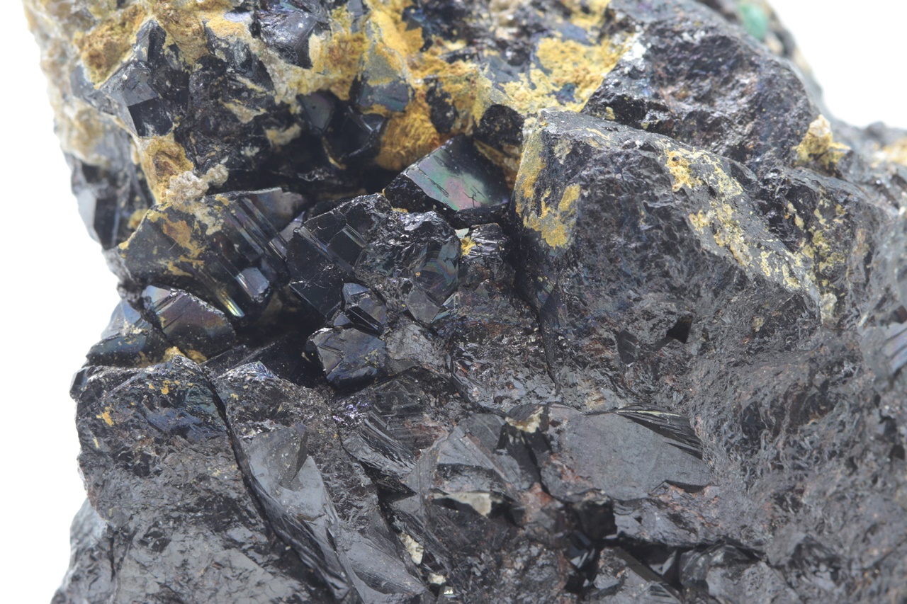 Schwarze Kristalle von Zinn(IV)-oxid, die in eine Höhlung gewachsen sind, wo die Kristalle mit sehr glänzenden Kristallflächen enden.