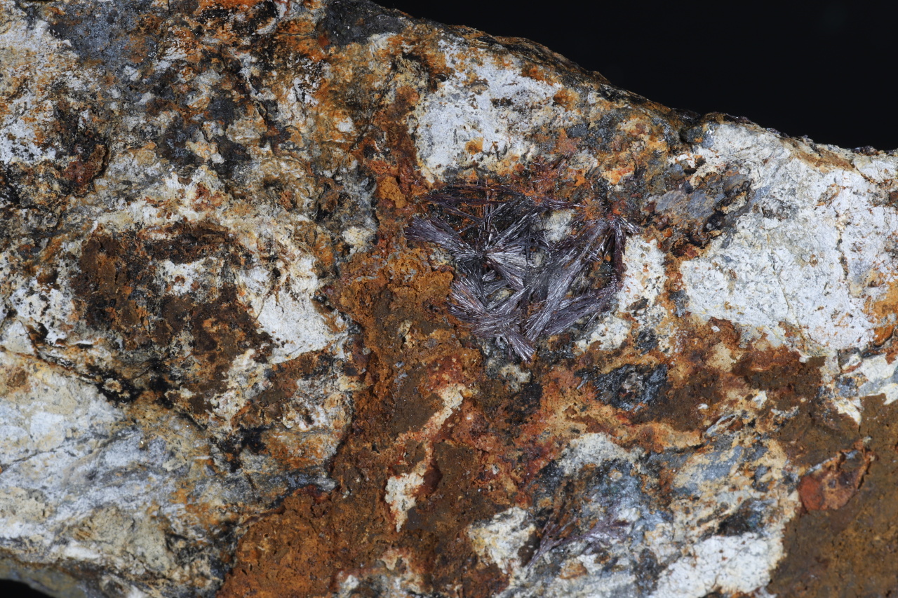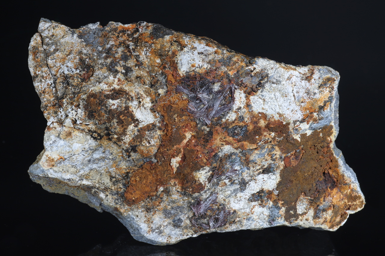 Dünne flache Stufe bis zu 8 mm großen Aggregaten nadelförmiger Kermezit-Kristalle auf massivem feinkörnigem Antimonit aus der klassischen Fundstelle Pernek. Die Probe ist auf der Rückseite abgeschitten.