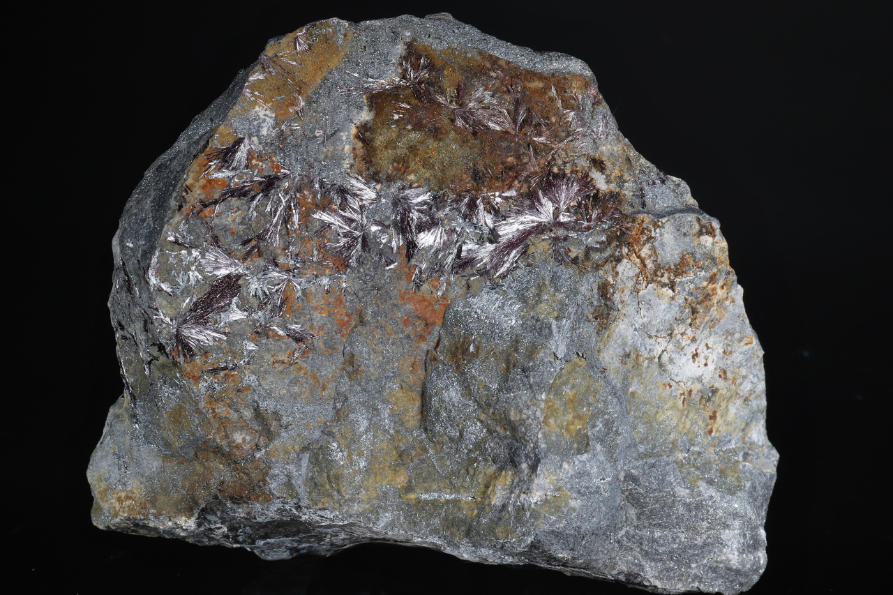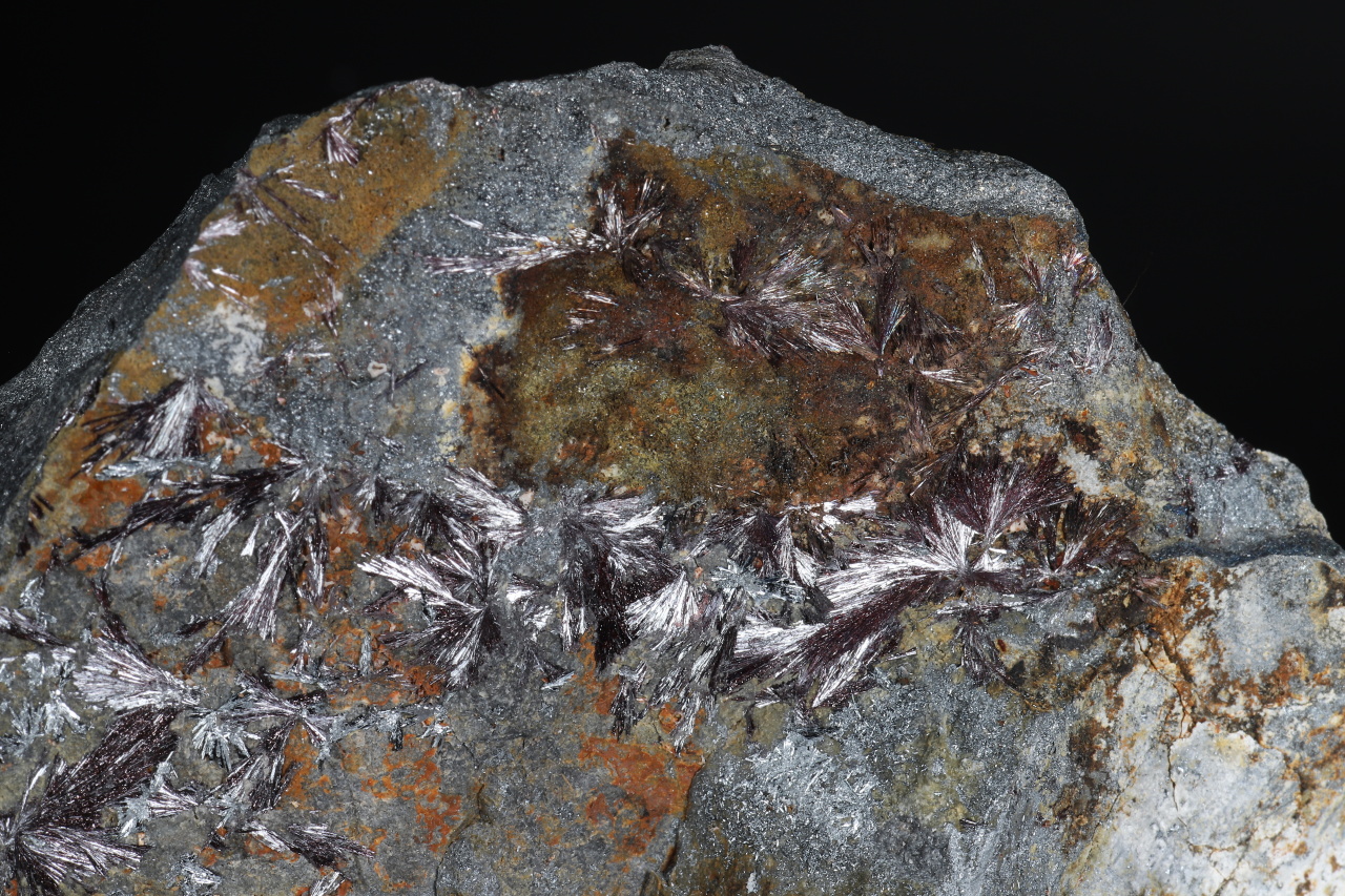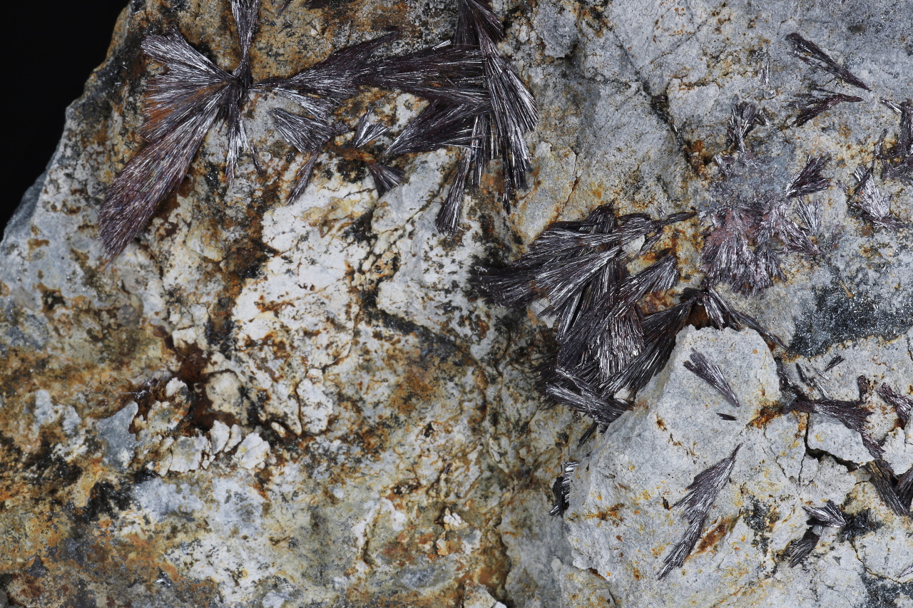 Sehr schöner reicher Stufe von räumlichen, bis zu 22 mm großen Aggregaten nadelförmiger Kermezit Kristalle auf massivem feinkörnigem Antimonit aus der klassischen Lokalität Pernek. Die Kermezit Kristalle befinden sich auf beiden Seiten der Stufe.