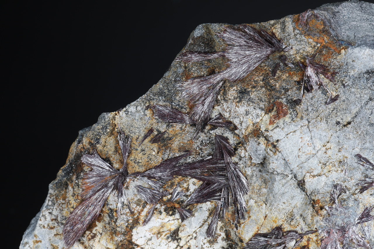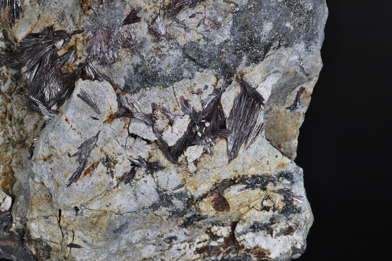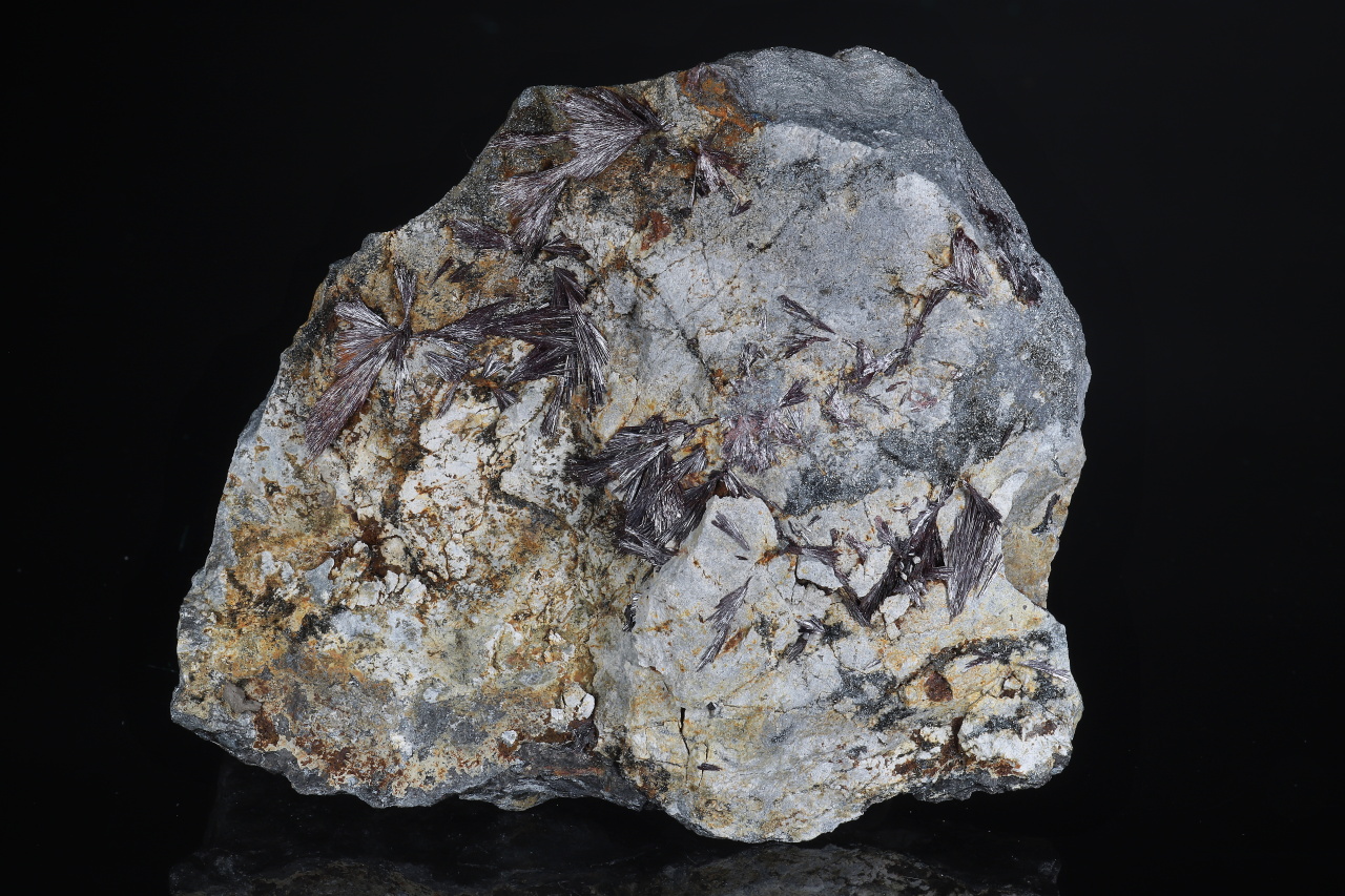 Sehr schöner reicher Stufe von räumlichen, bis zu 22 mm großen Aggregaten nadelförmiger Kermezit Kristalle auf massivem feinkörnigem Antimonit aus der klassischen Lokalität Pernek. Die Kermezit Kristalle befinden sich auf beiden Seiten der Stufe.