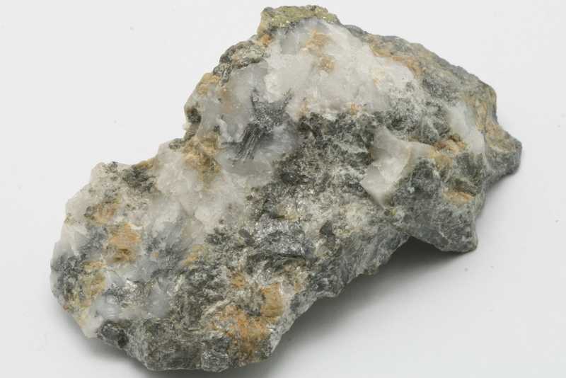 Probe der nicht so üblichen Sulfosalz-Kobellit aus dem slowakischen Smolník. Ziemlich reichhaltige Probe von eingeschlossenen Stahlgrauen Aggregaten von Kobellit in der Größe von 13 mm.