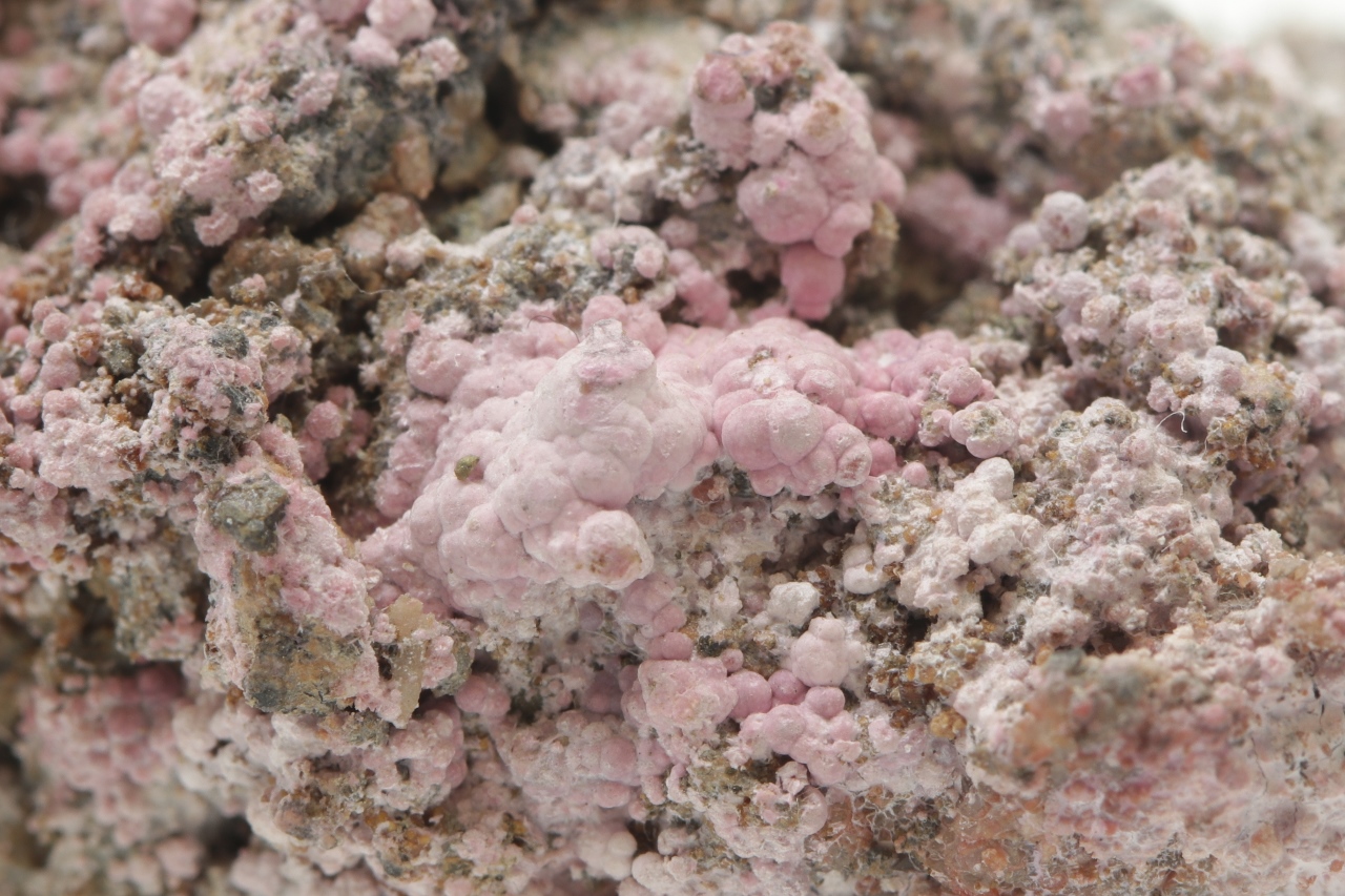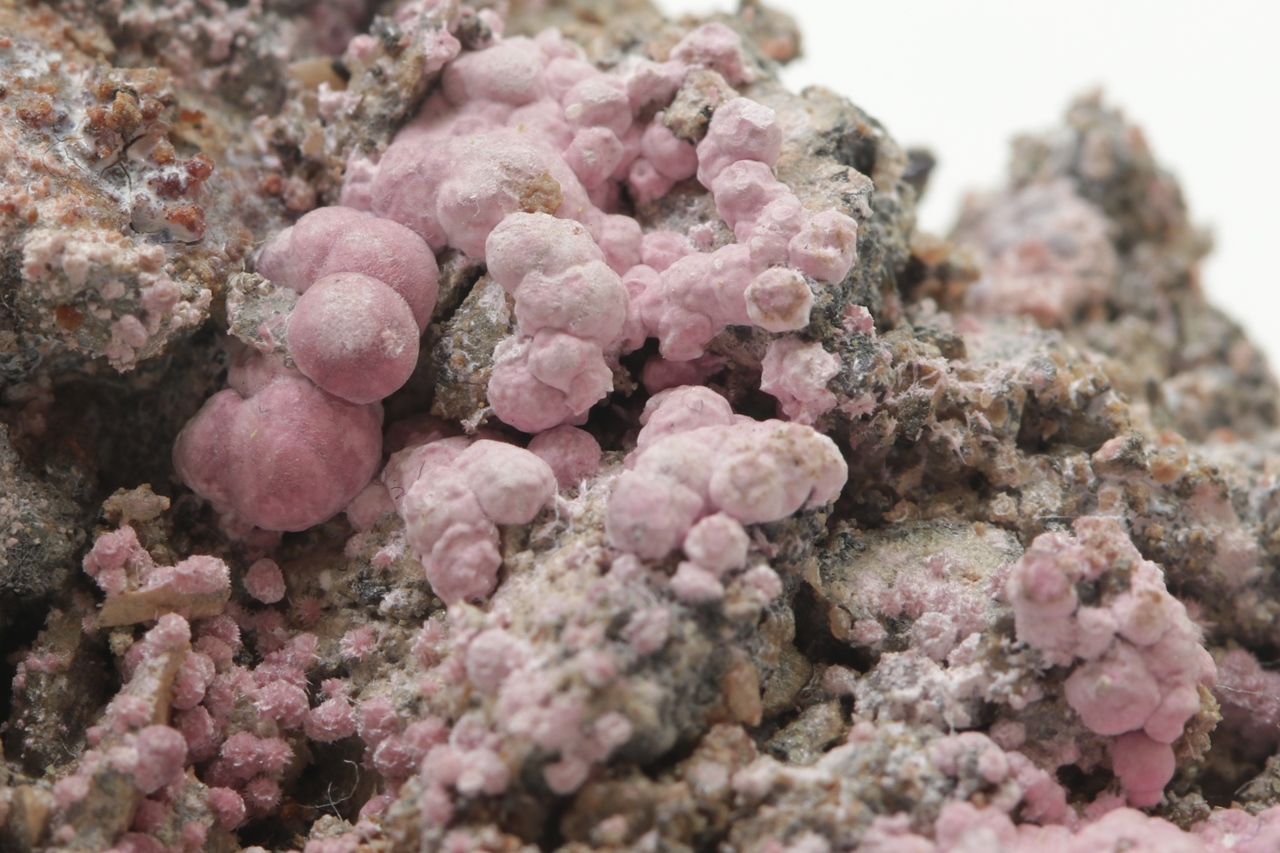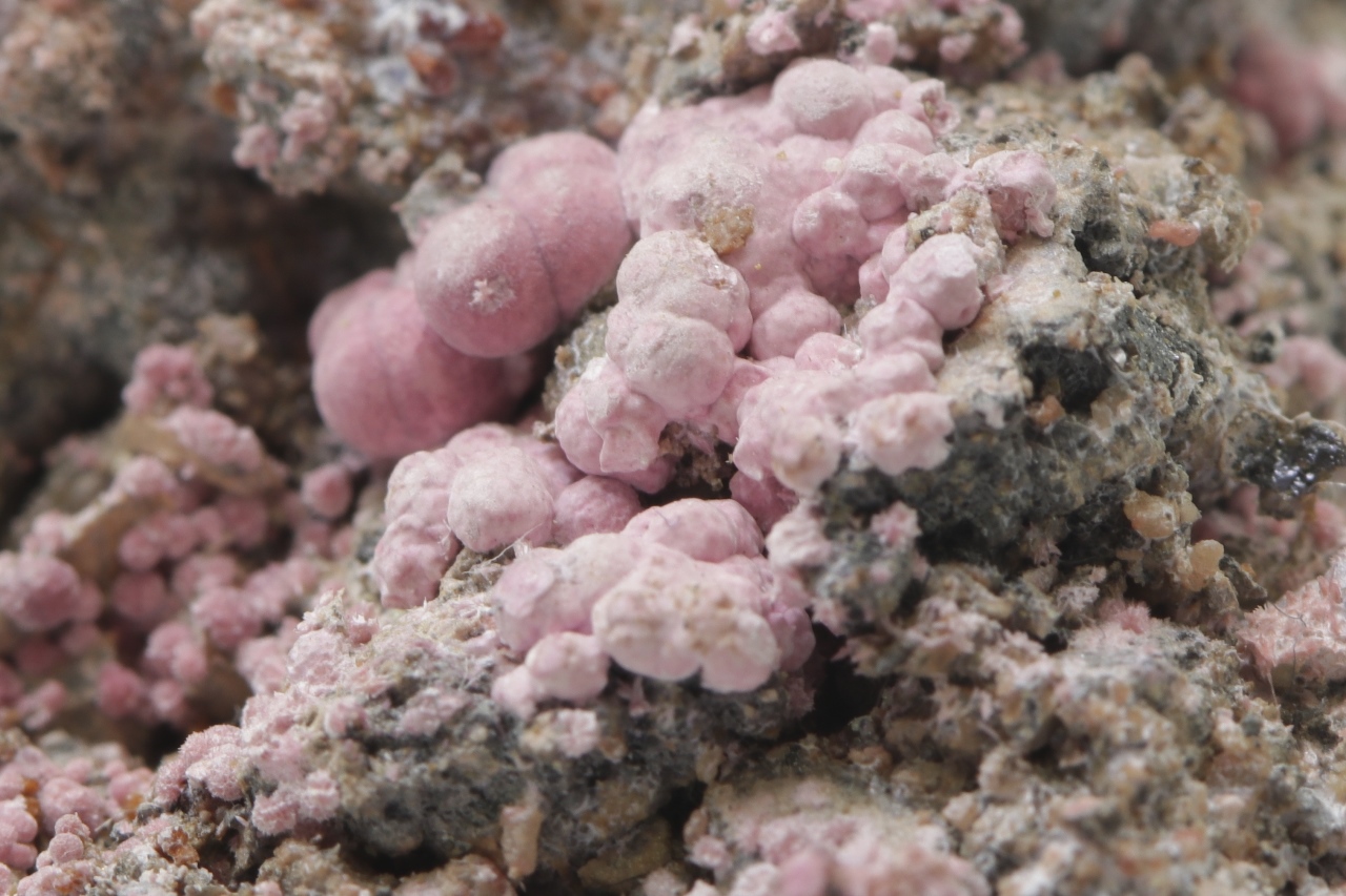 Kugelige Aggregate des rosafarbenen Zinkarsenats. Das Muster stammt aus dem 12. Stockwerk des Bergwerks Svornost, Ader Geschieber.