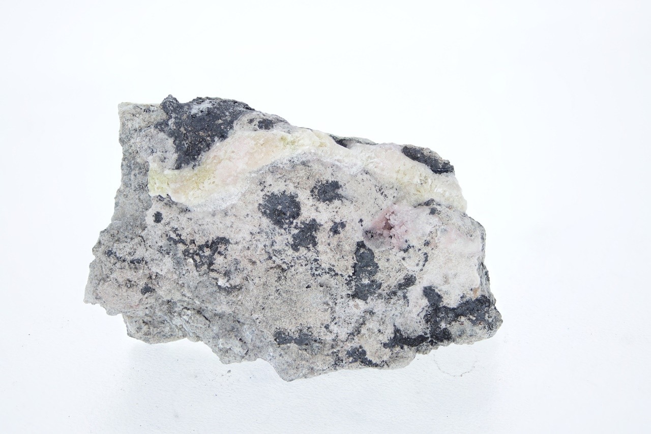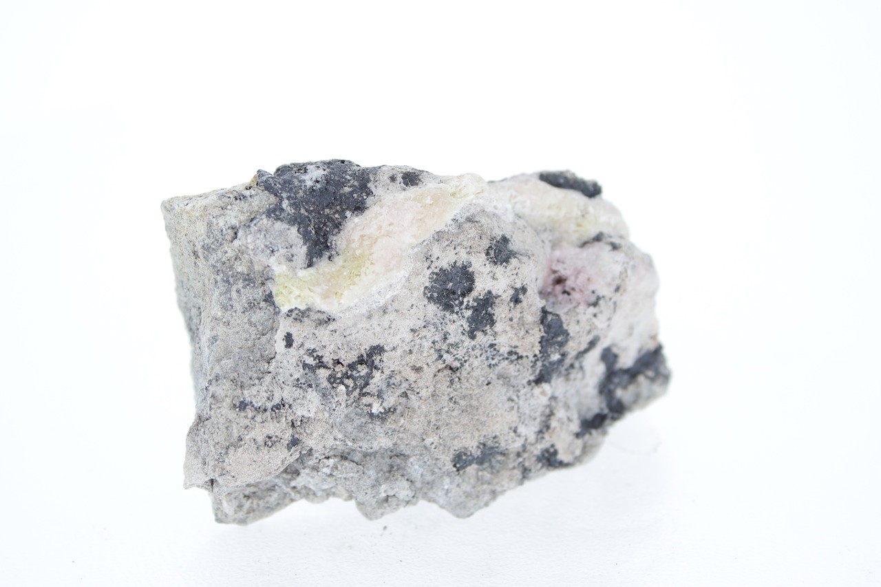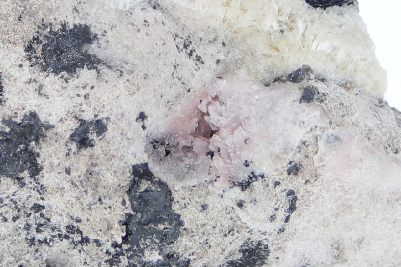Probe mit reichen köttigit-Überzügen, die eine ungewöhnliche „Raupe“ bilden, mit einer Oberfläche, die stellenweise mit isolierten Kristallen sichtbar bedeckt ist. Weitere satte rosa, gut begrenzte Kristalle füllen eine Höhlung im rechten Teil der Probe.
