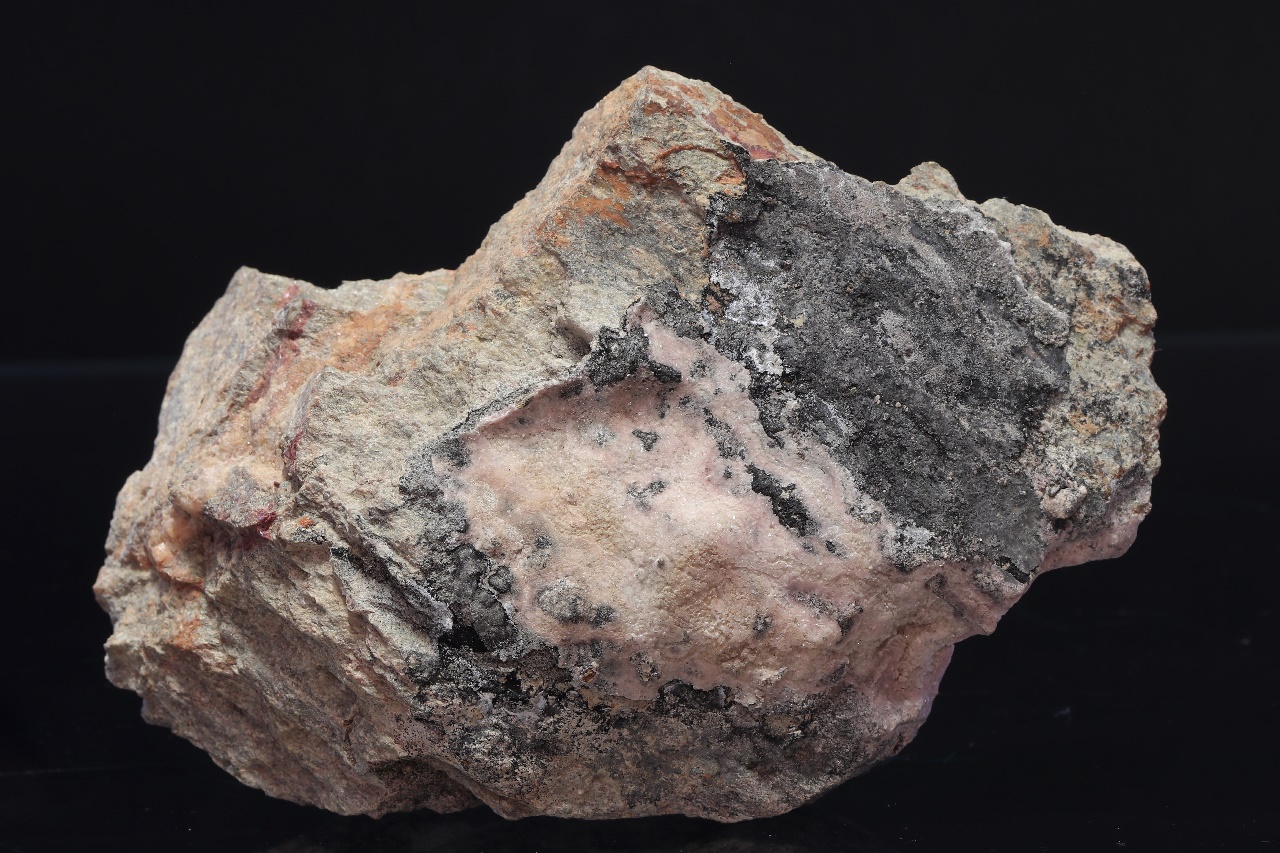 Hellrosa Beschichtung des seltenen Zinkarsenats – köttigit. Die Beschichtung ist ungefähr 6 × 4 cm groß. Historisches Stufe.
