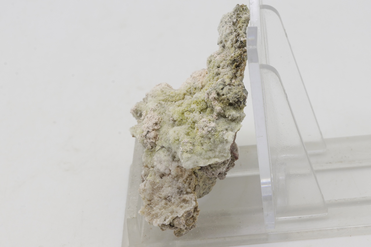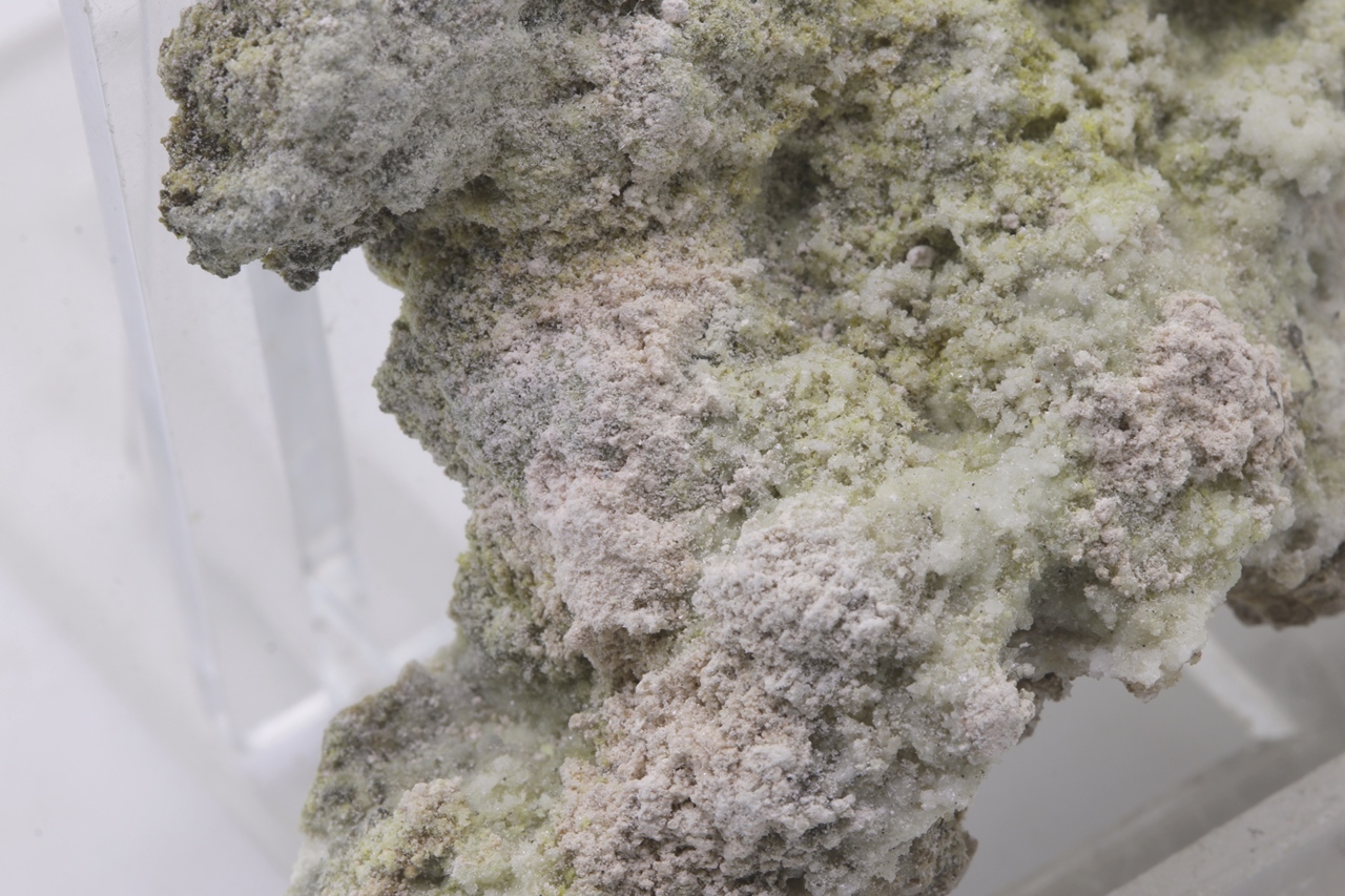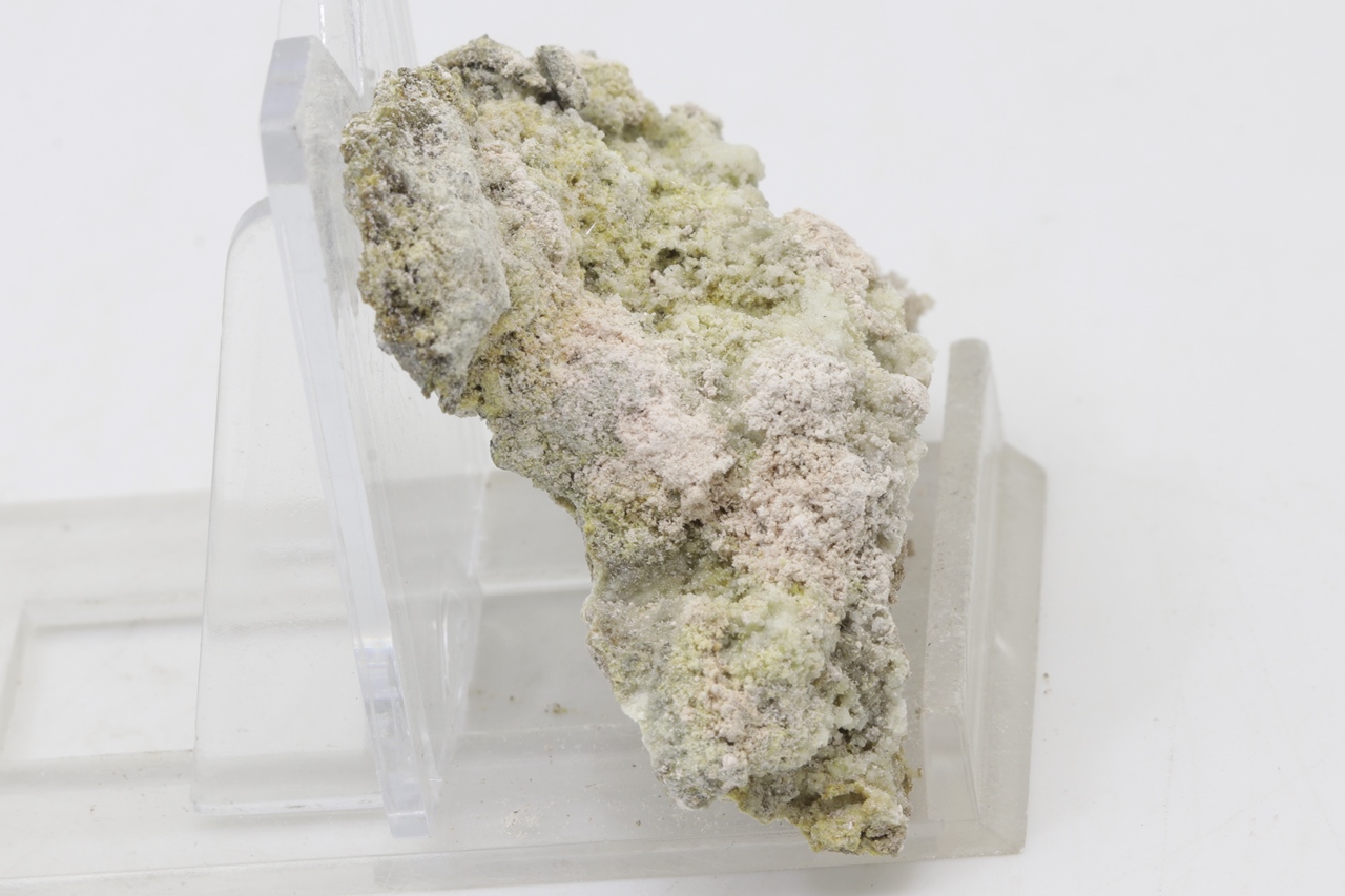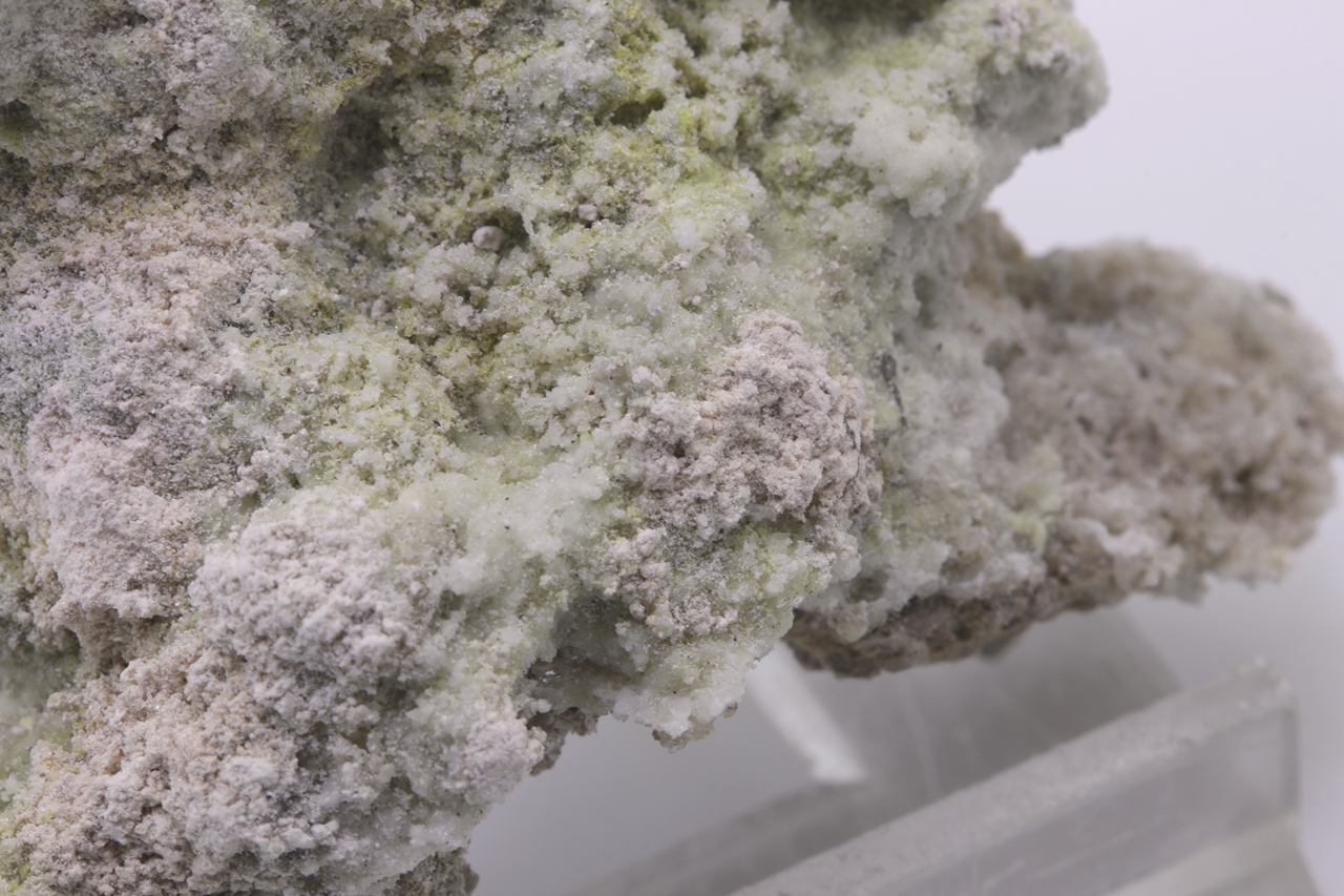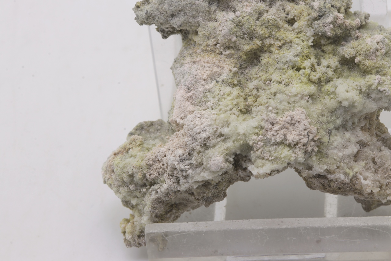 Krautit bildet kleine, halbkugelförmige und pudrige Aggregate von blassrosa bis weißrosa Farbe, die auf der Stufe zusammen mit blassgelben und farblosen Kristallen von Gips vorkommen und oft auch darauf sitzen. Es handelt sich um ein schönes Beispiel von Krautit aus Jáchymov.