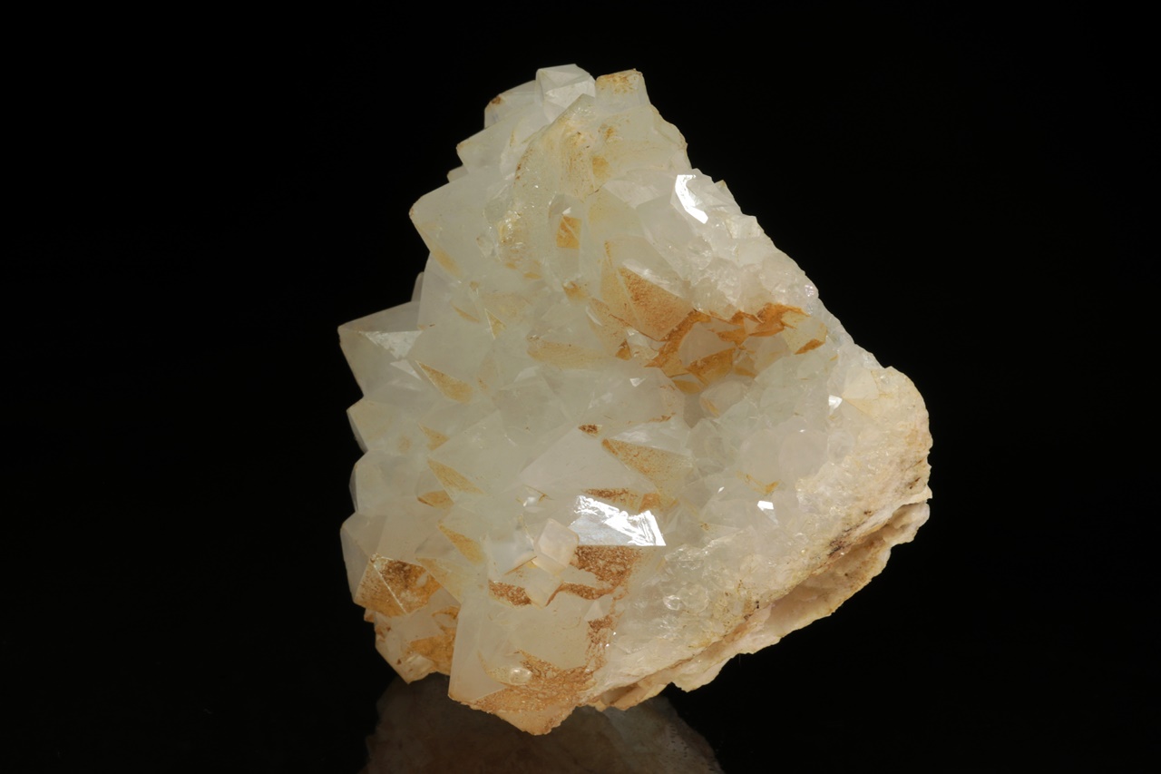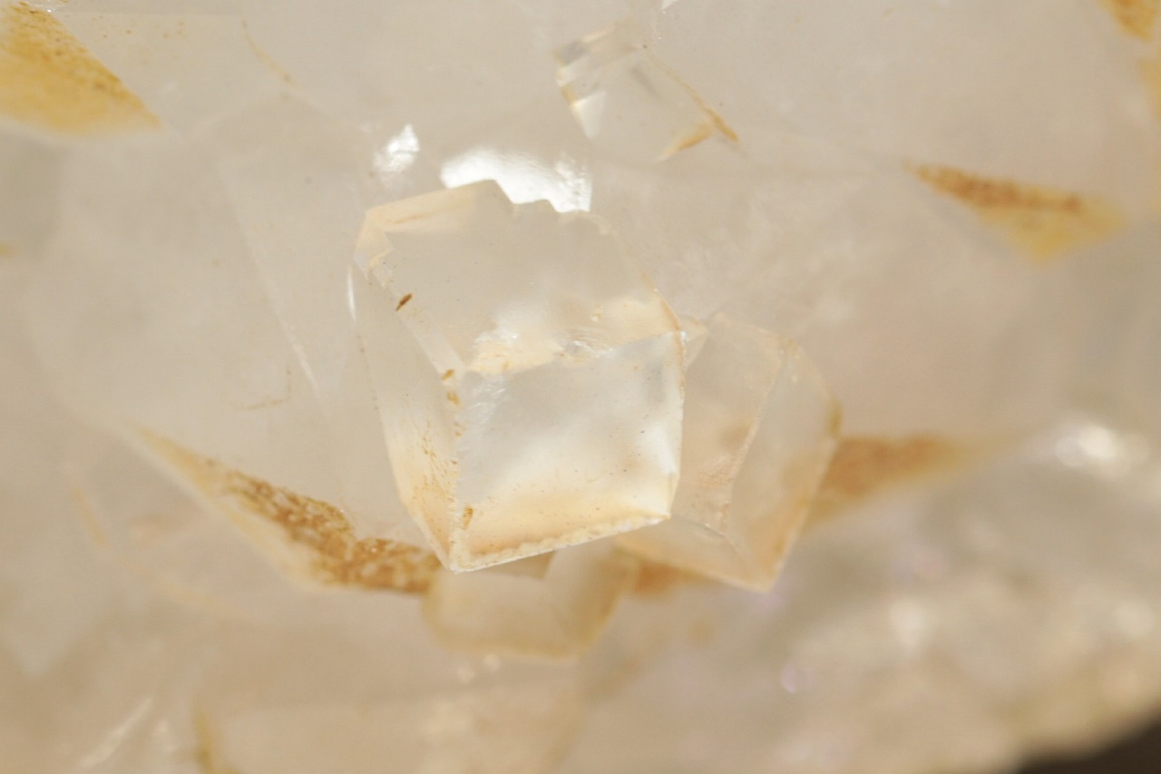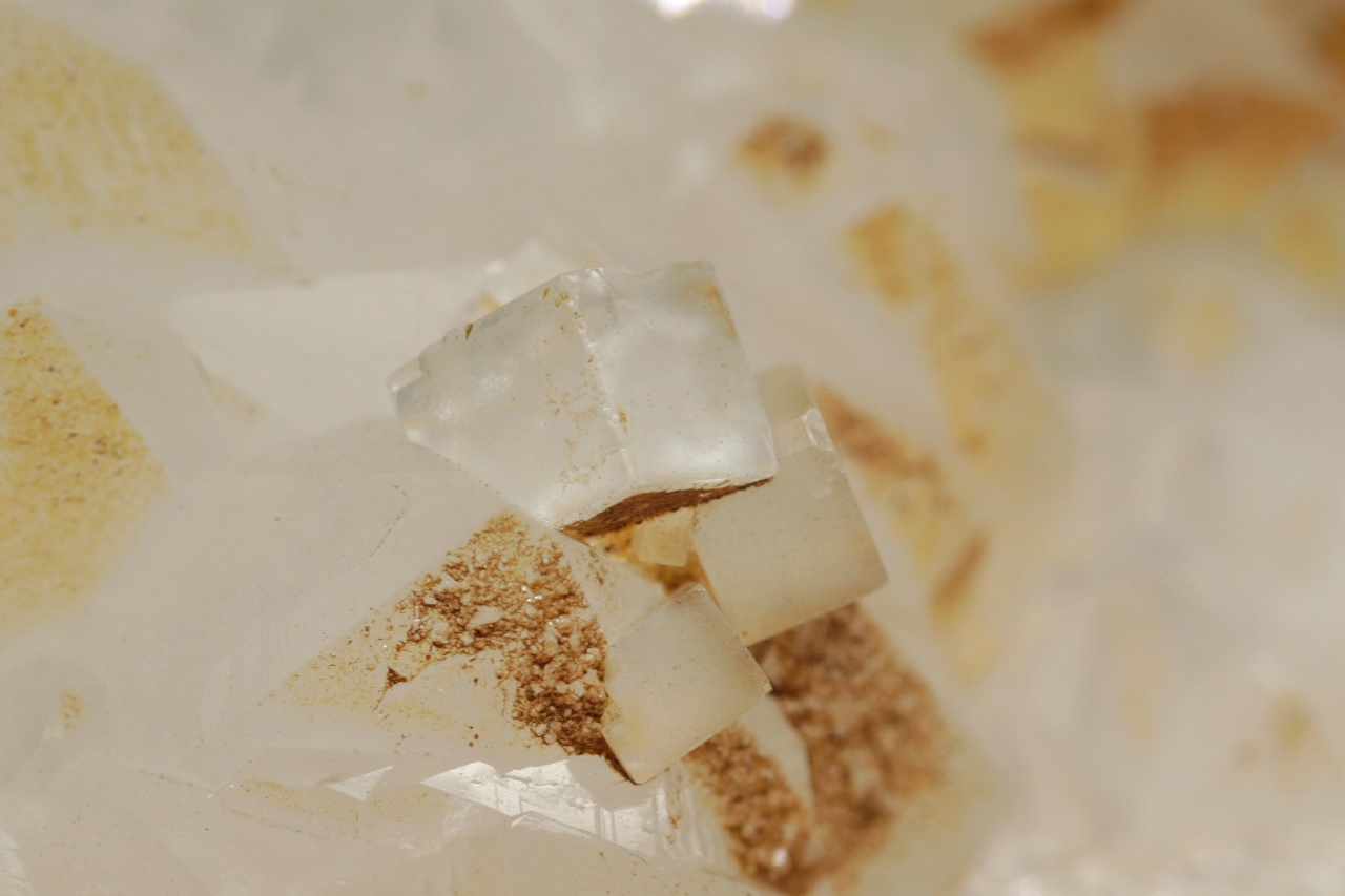 Paprsčitě narostlá drúza bílých krystalů křemene, na které narůstá několik krychlových krystalů čirého fluoritu. Největší krystal fluoritu je 5 mm velký.