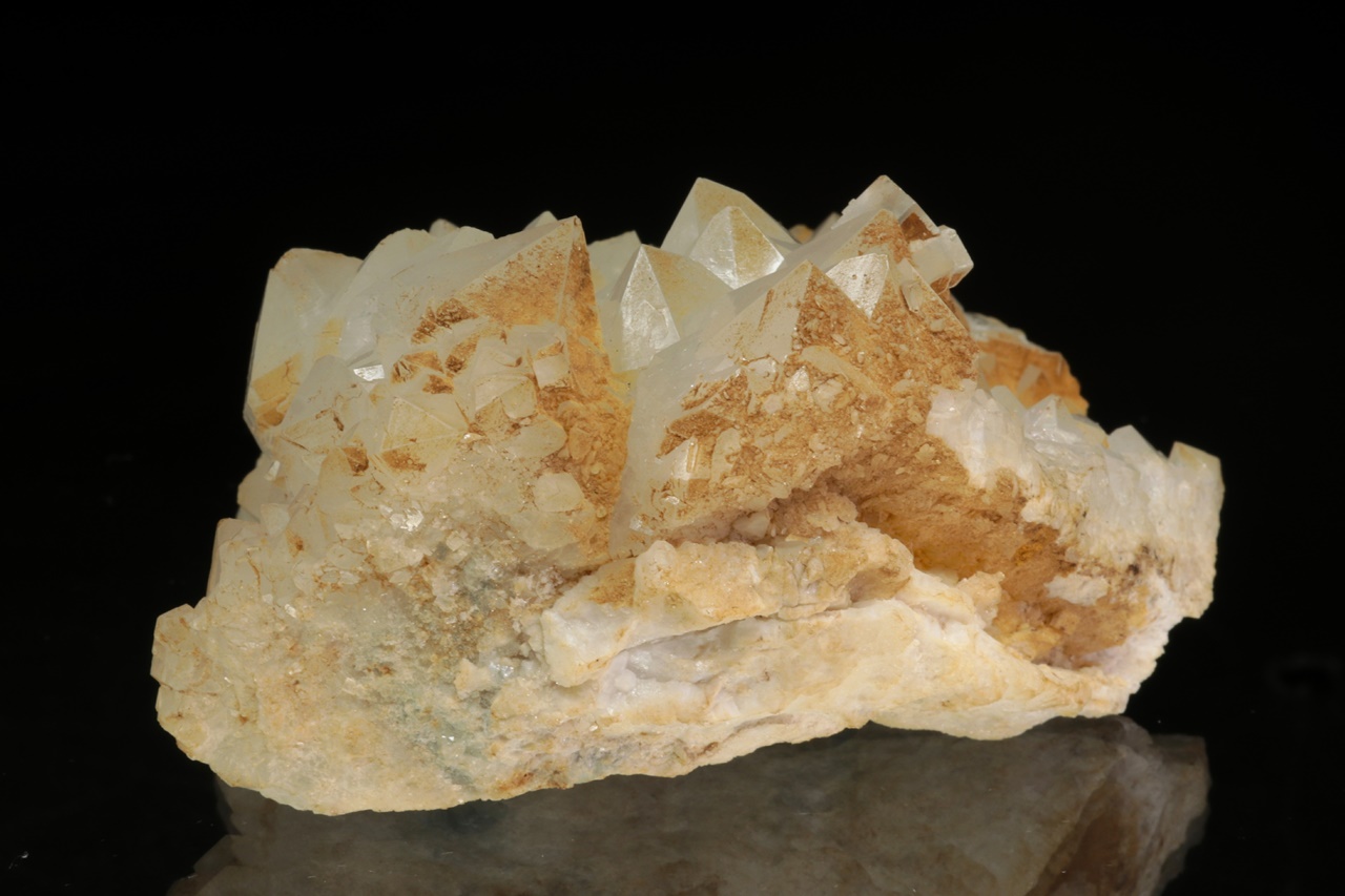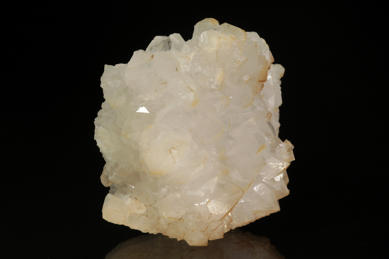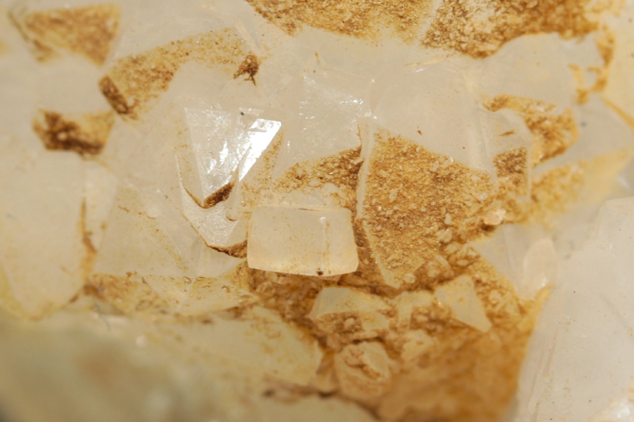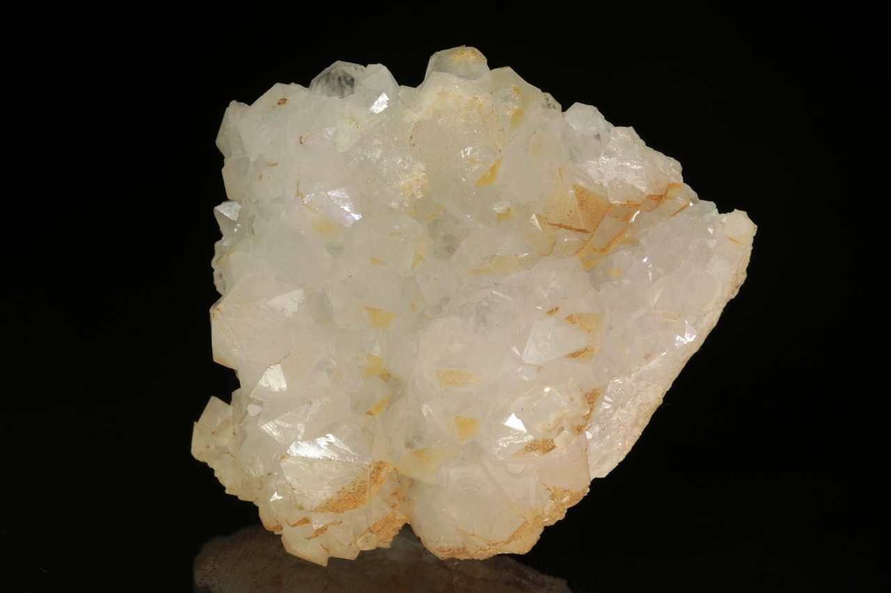 Paprsčitě narostlá drúza bílých krystalů křemene, na které narůstá několik krychlových krystalů čirého fluoritu. Největší krystal fluoritu je 5 mm velký.