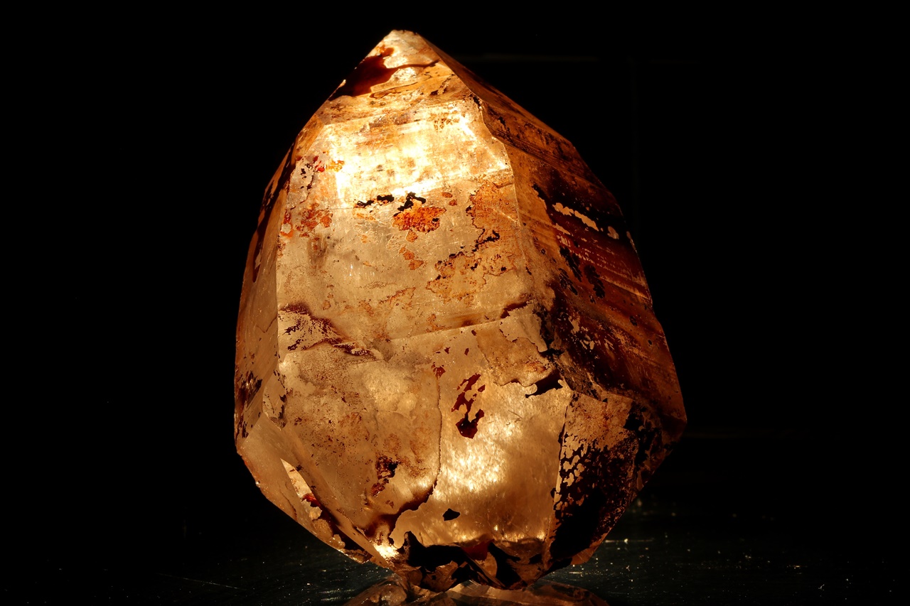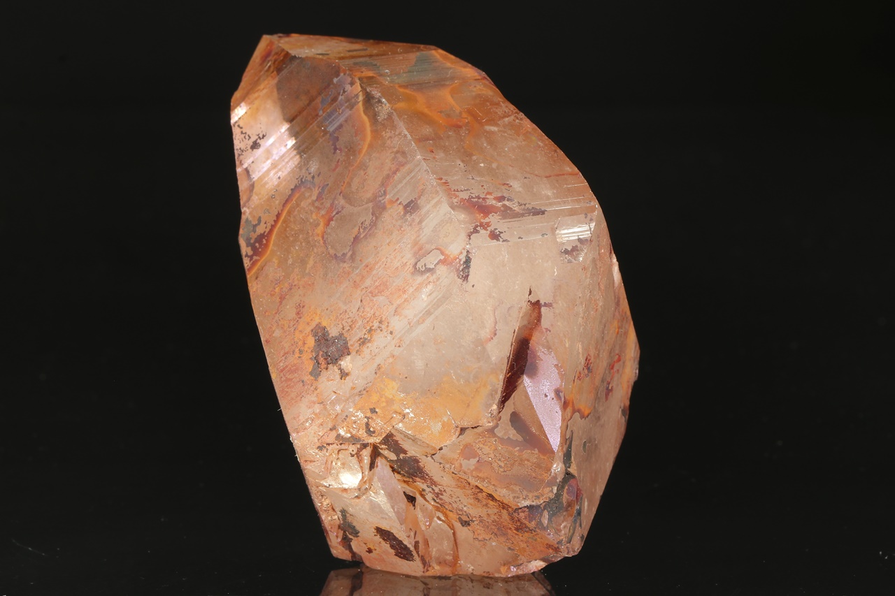 Beidseitig terminierter Kristall von klarem Bergkristall, überzogen mit Eisenoxiden.