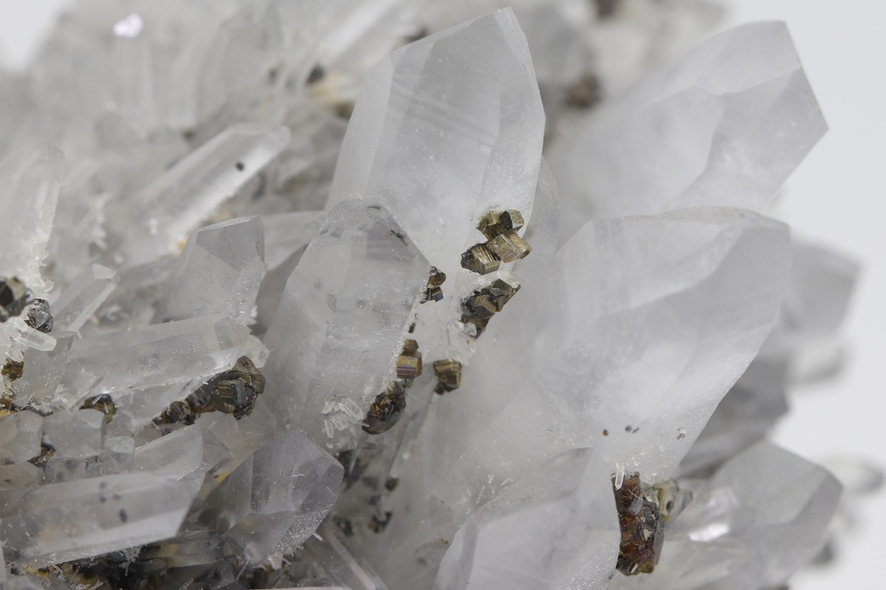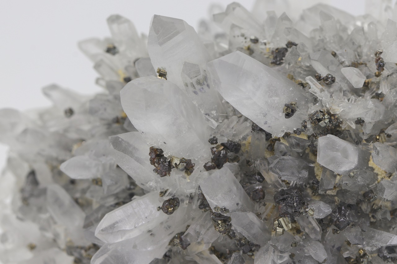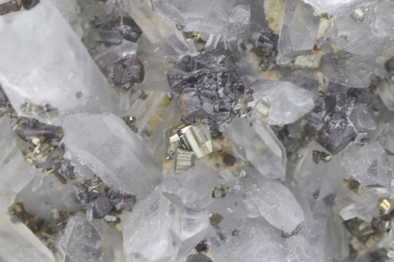 Druse von klaren Quarzkristallen, bewachsen mit goldenen Pyritkristallen. Die größten Kristalle sind 2,5 cm groß.