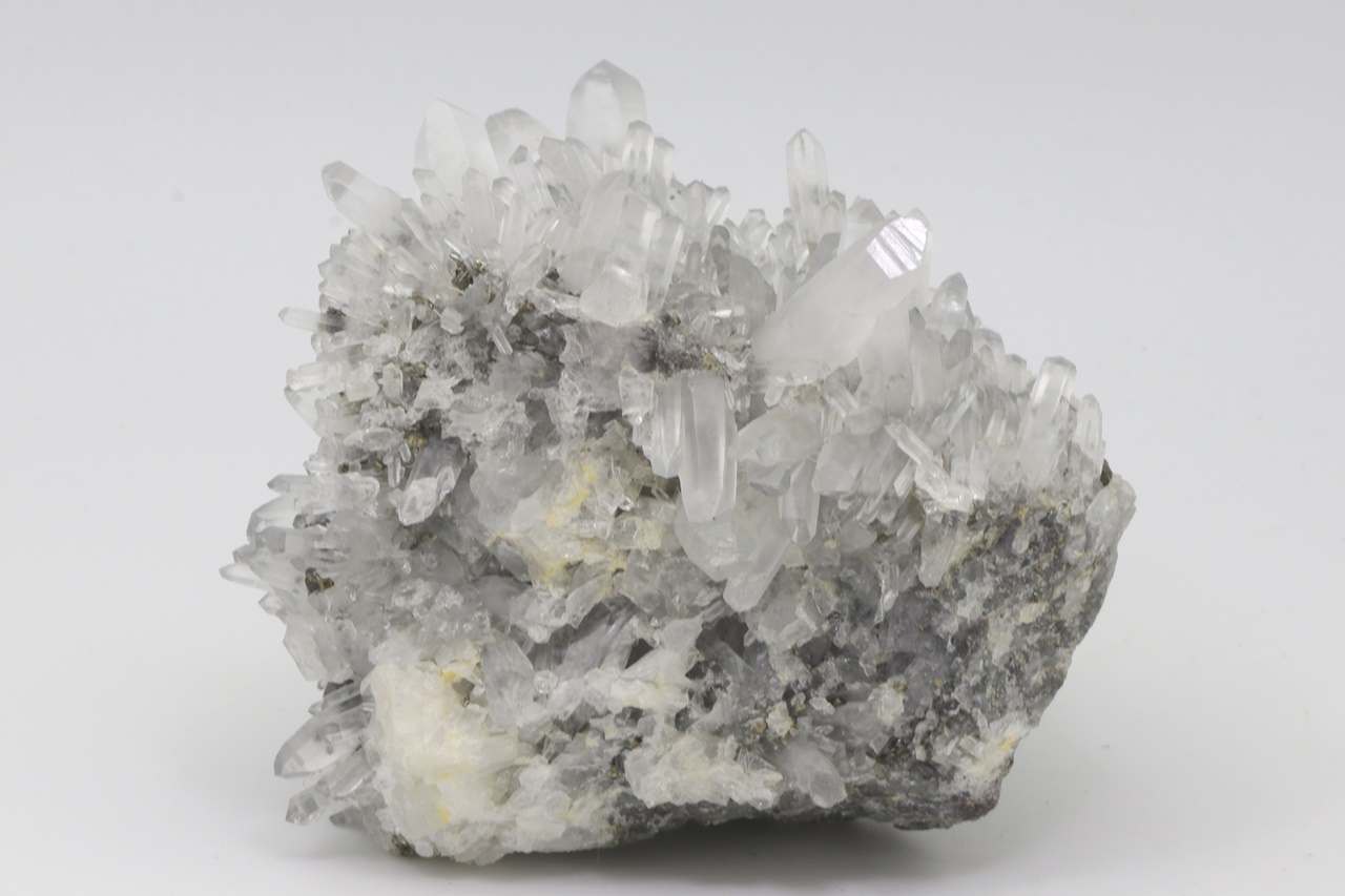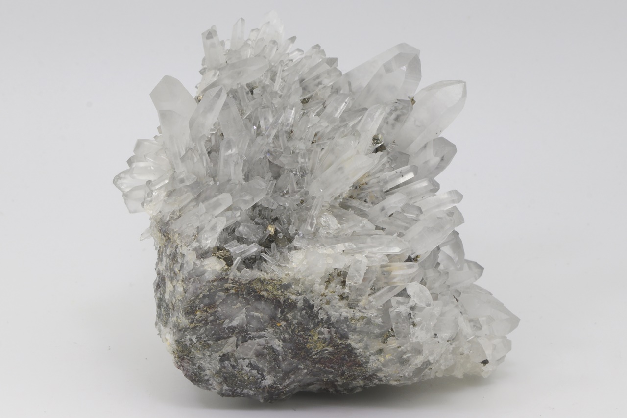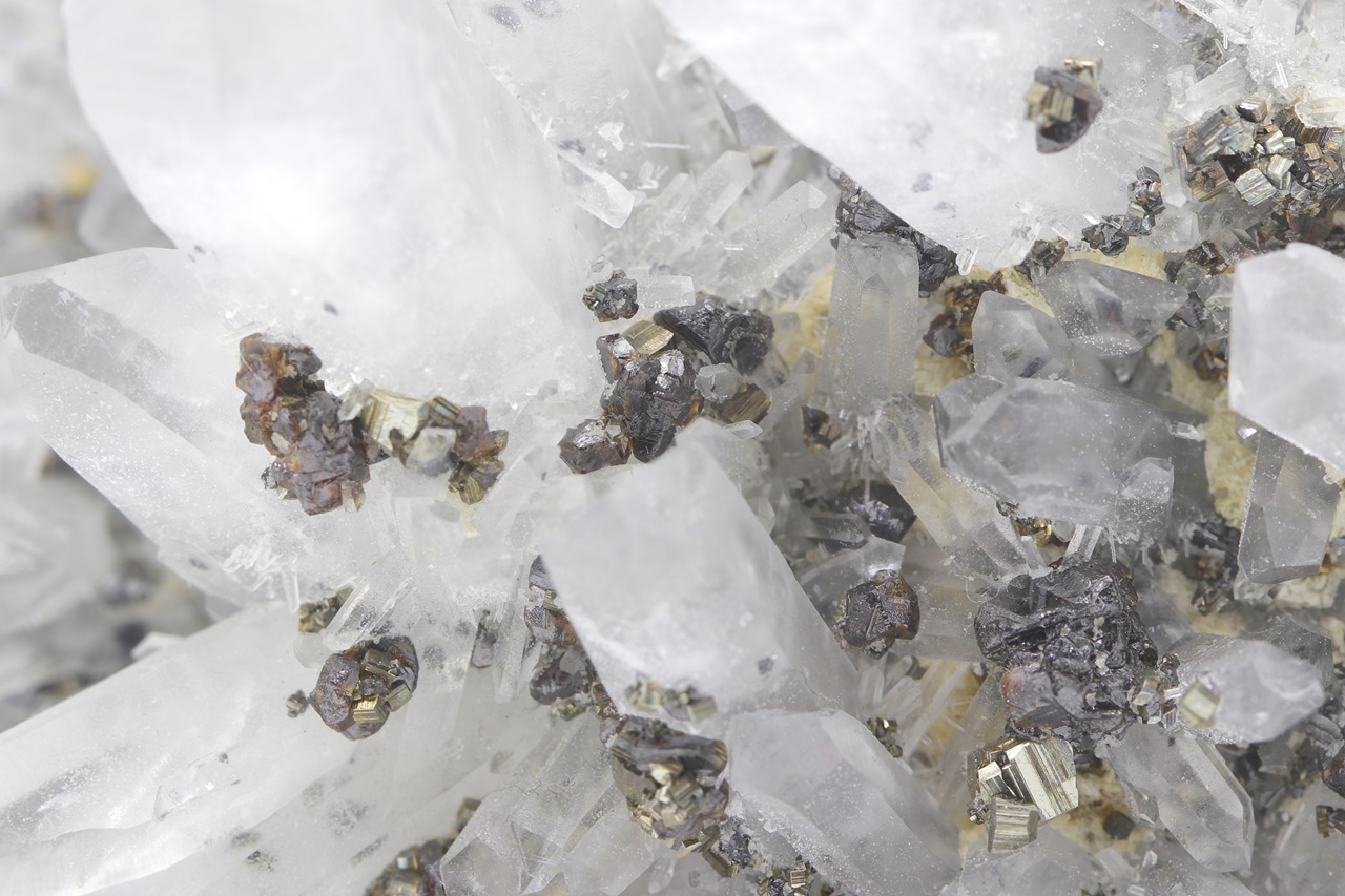 Druse von klaren Quarzkristallen, bewachsen mit goldenen Pyritkristallen. Die größten Kristalle sind 2,5 cm groß.