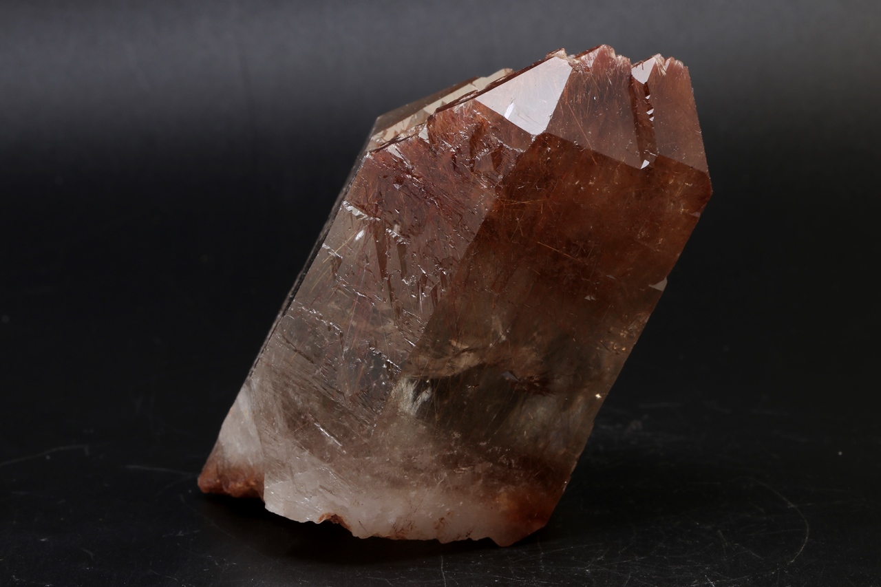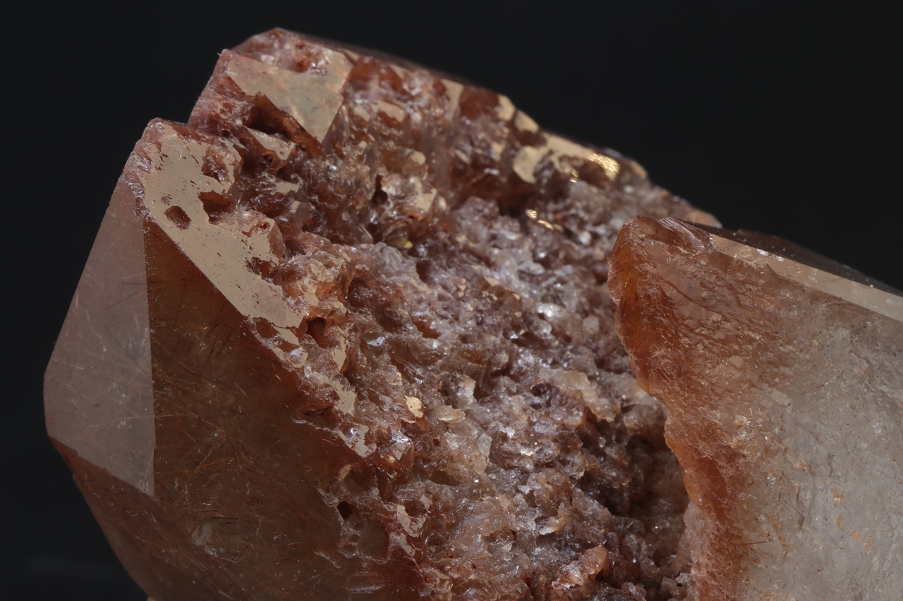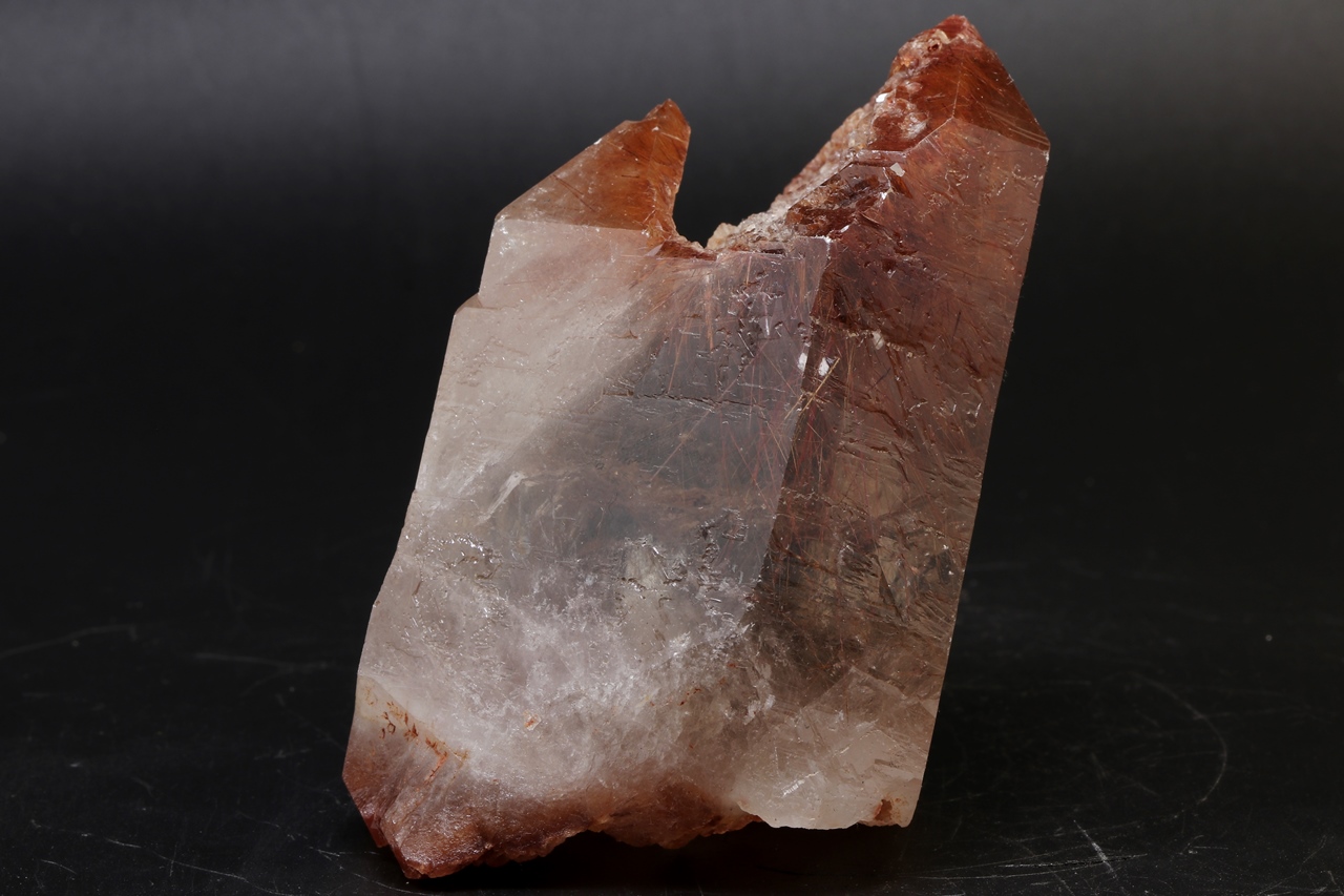 Einzigartiger gespaltener Bergkristall mit vielen strahlenförmigen Einschlüssen von rötlichen Rutil-Sagenit.