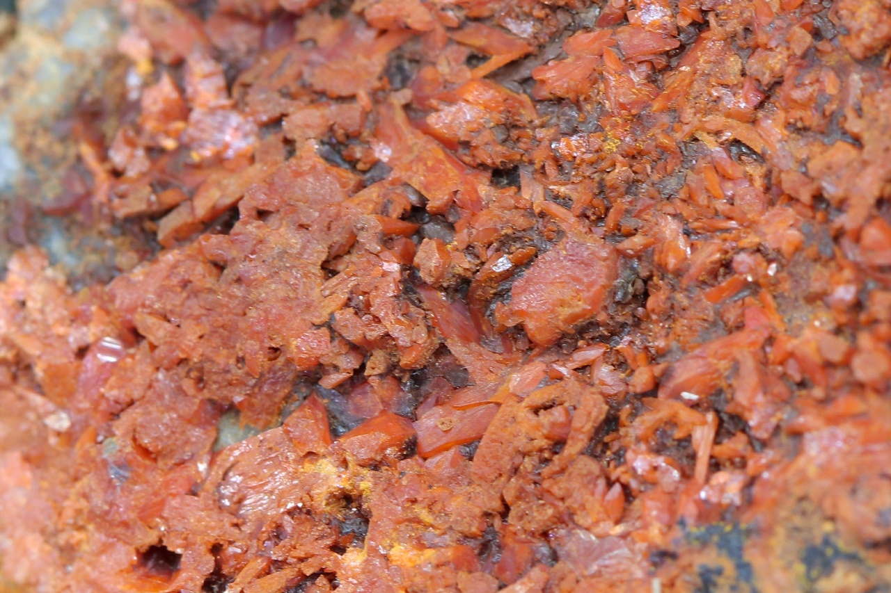 Wachstum von Kristallen des orange-roten Krokoits bis zu 2 mm Größe.