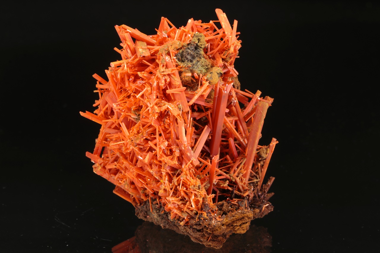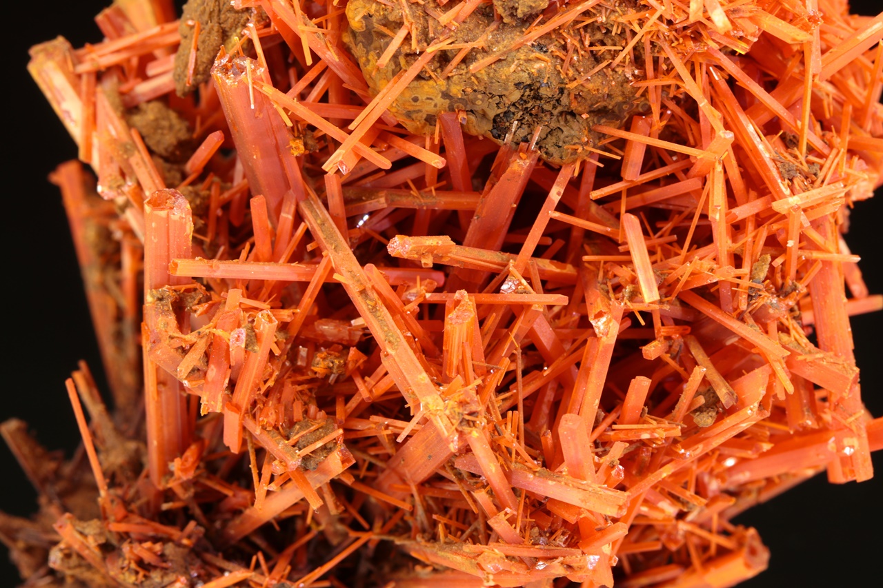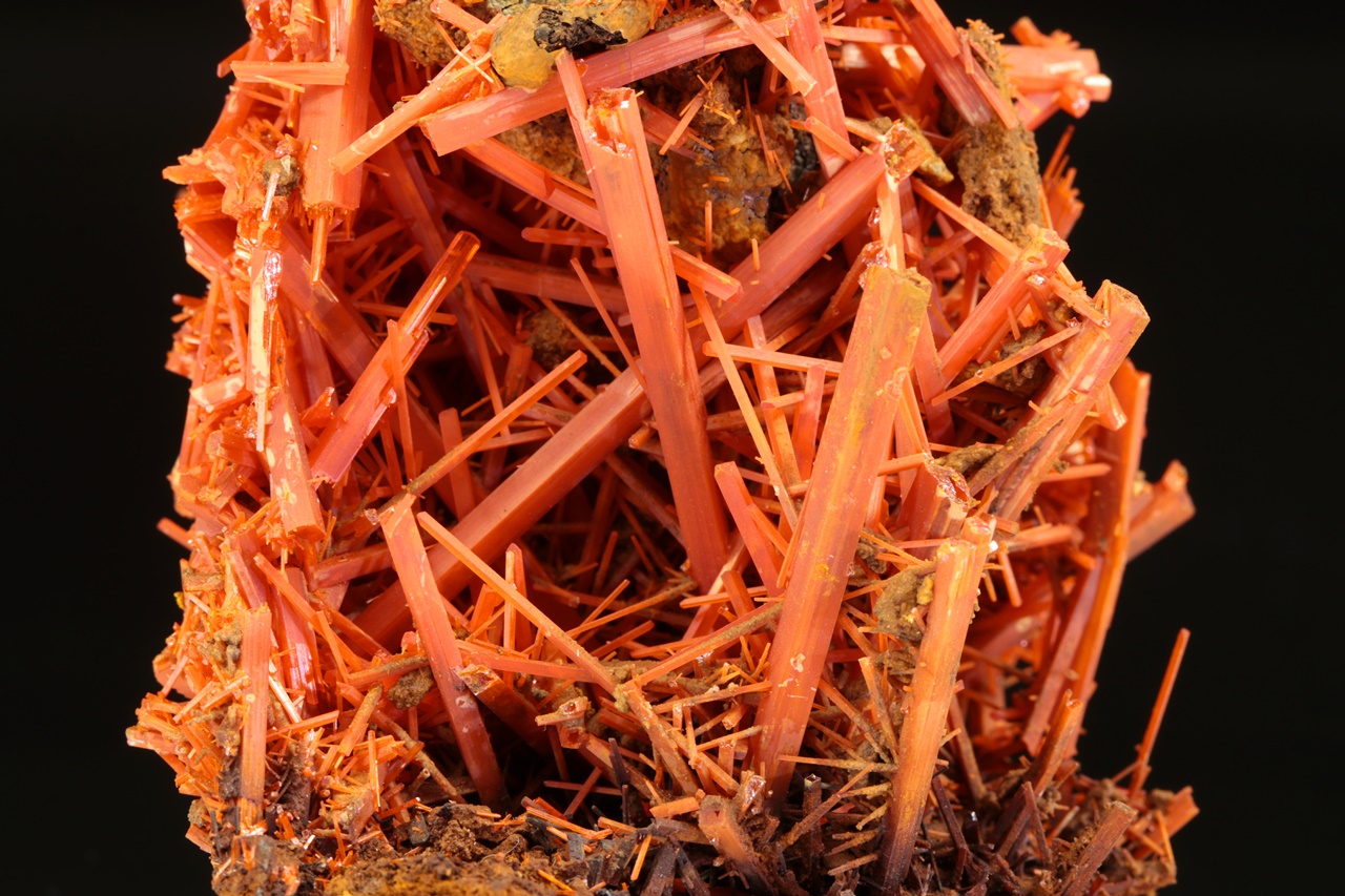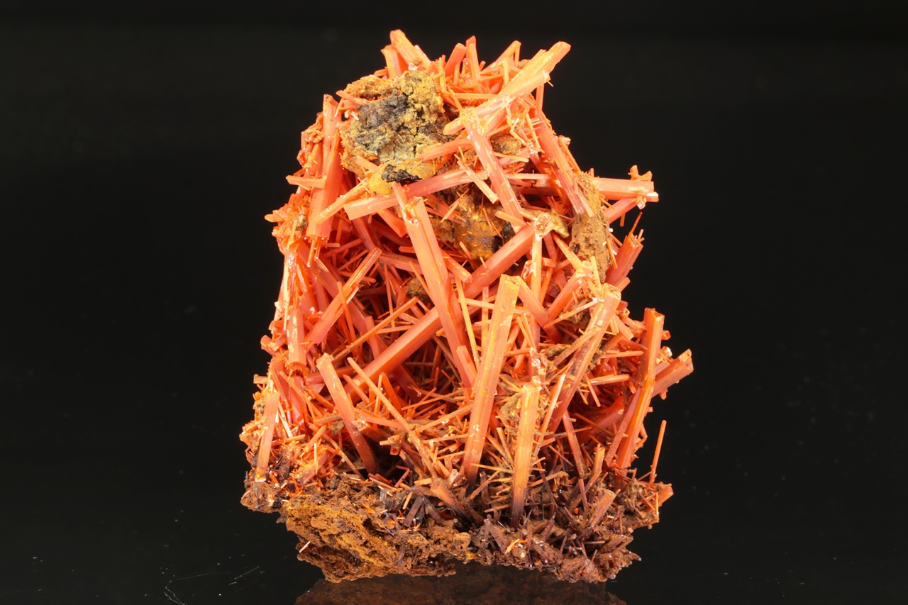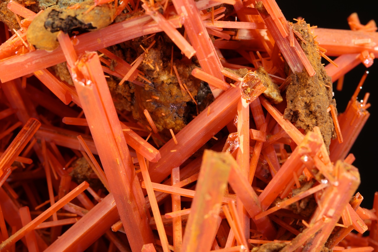 Nádherný bohatý vzorek lesklých intenzivně červených krystalů krokoitu až 3 cm velkých.