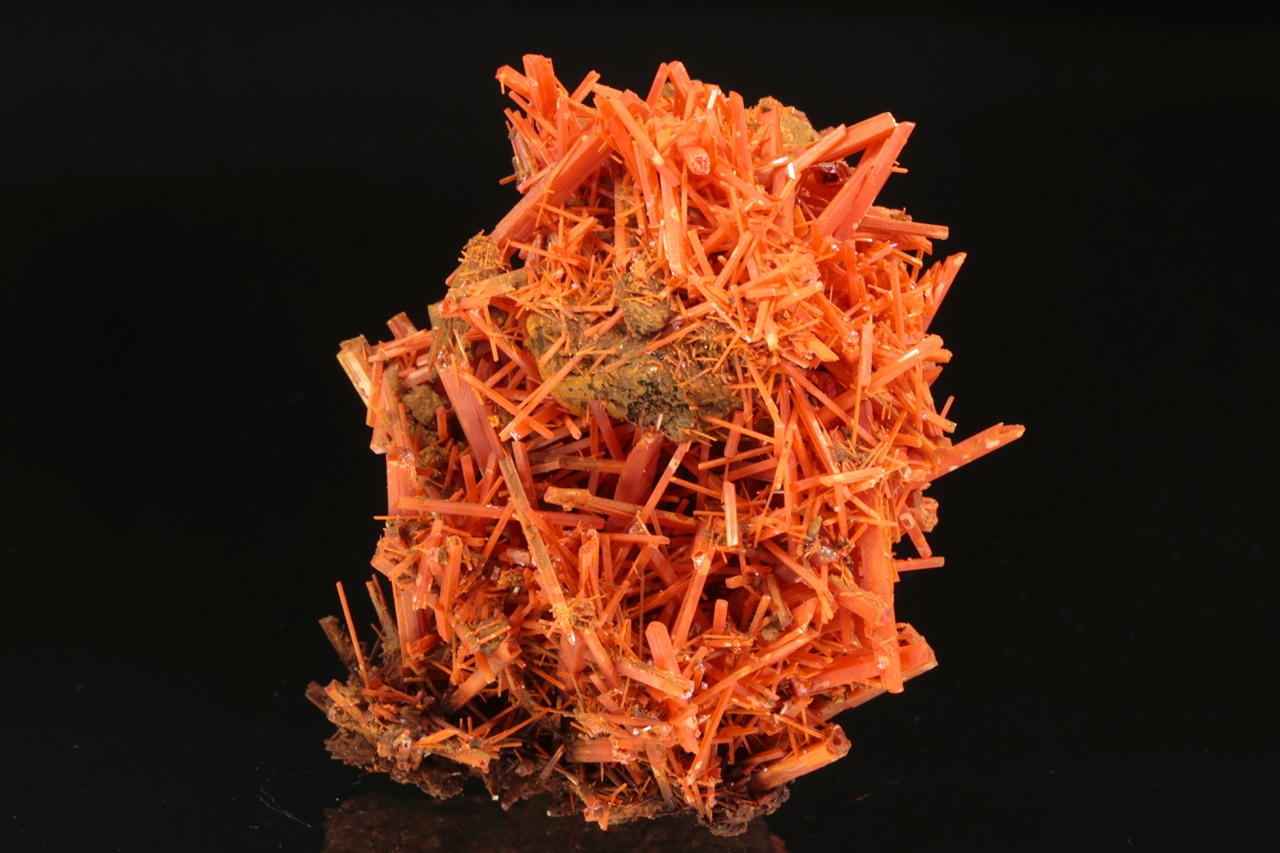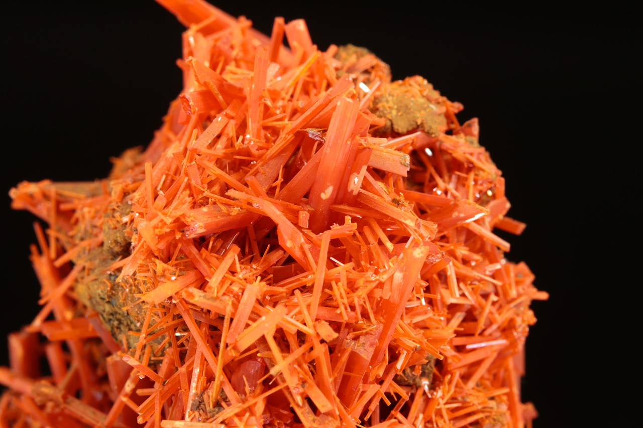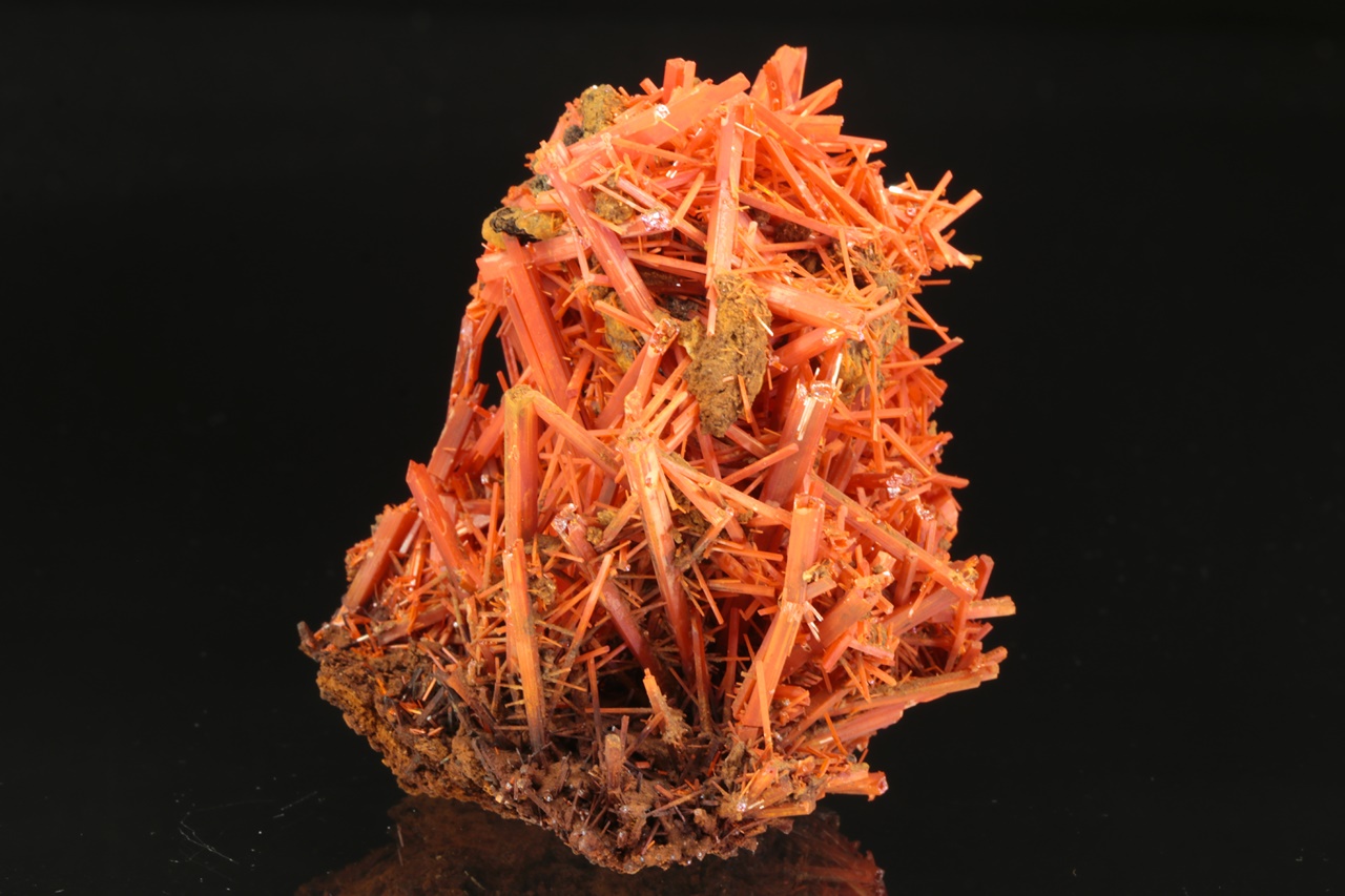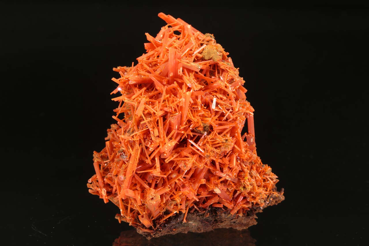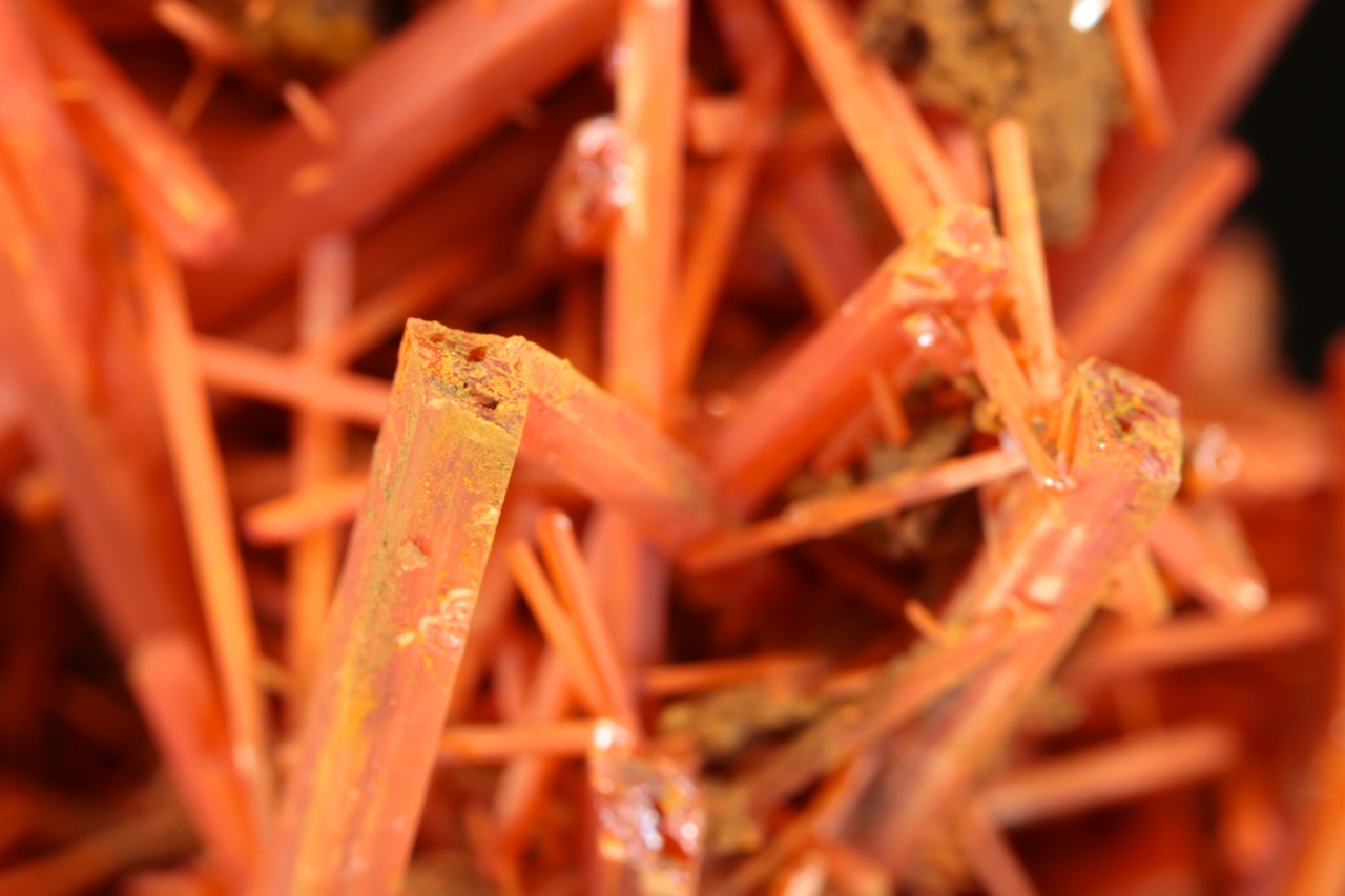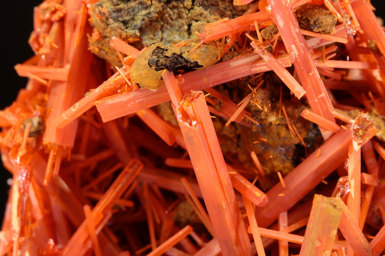 Nádherný bohatý vzorek lesklých intenzivně červených krystalů krokoitu až 3 cm velkých.