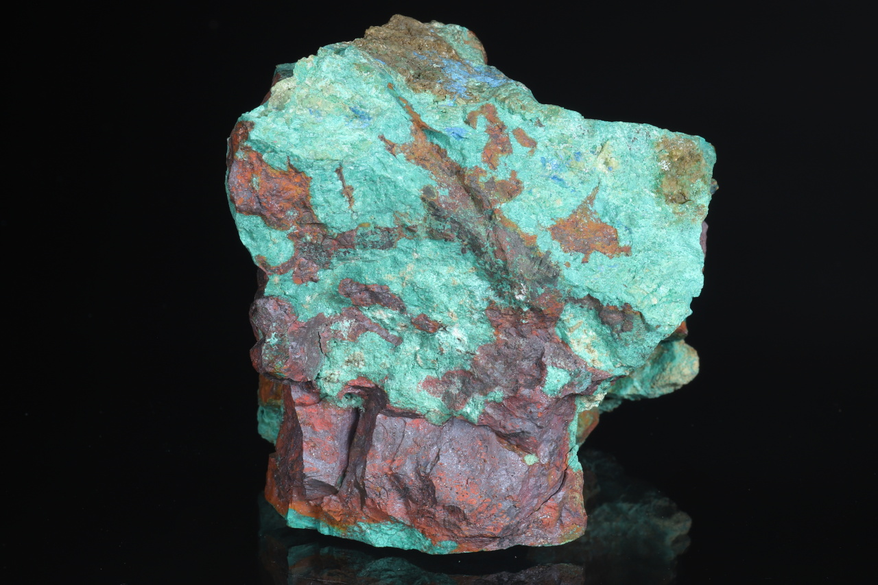 Probe von massivem rotbraunem Kuprit im Gestein, gefärbt durch sekundäre Kupfermineralien. Eine reiche Probe von Kuprit aus der klassischen Fundstelle Běloves.
