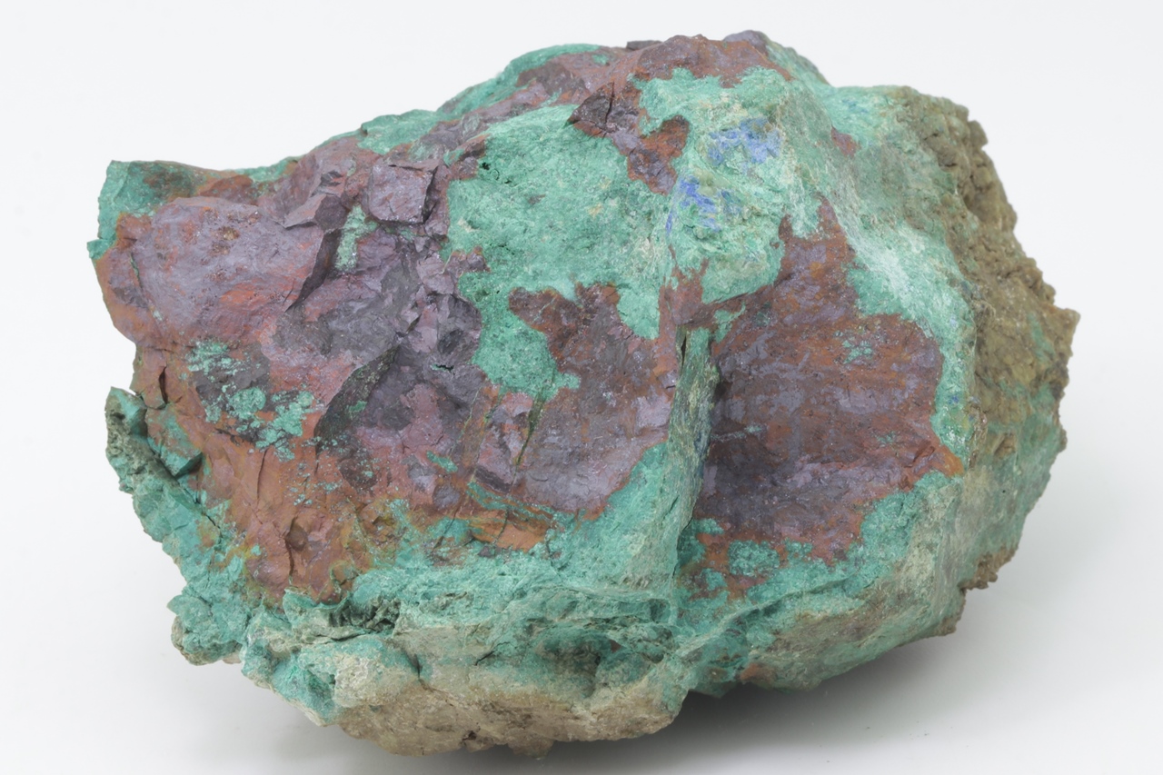Probe von massivem, braunrotem Kuprit bedeckt mit grünem Malachit und blauem Azurit.